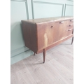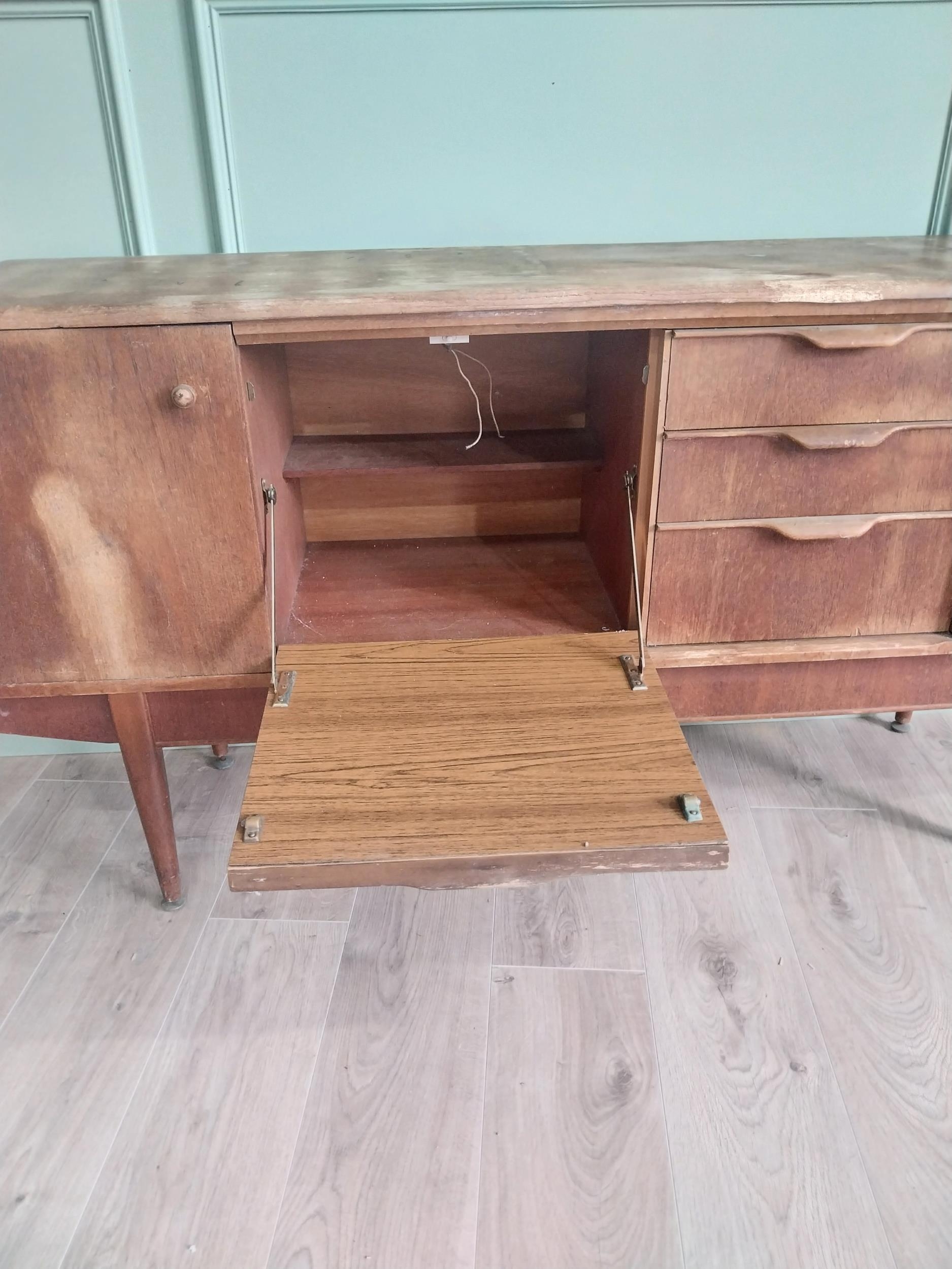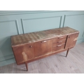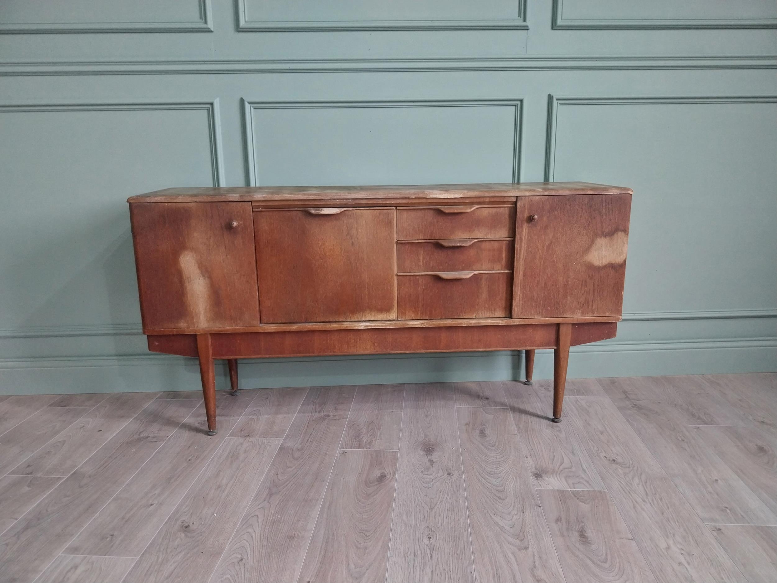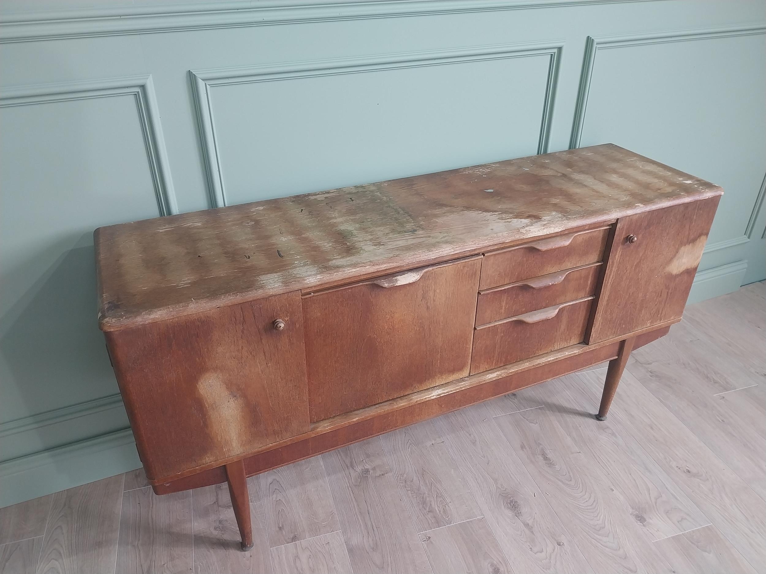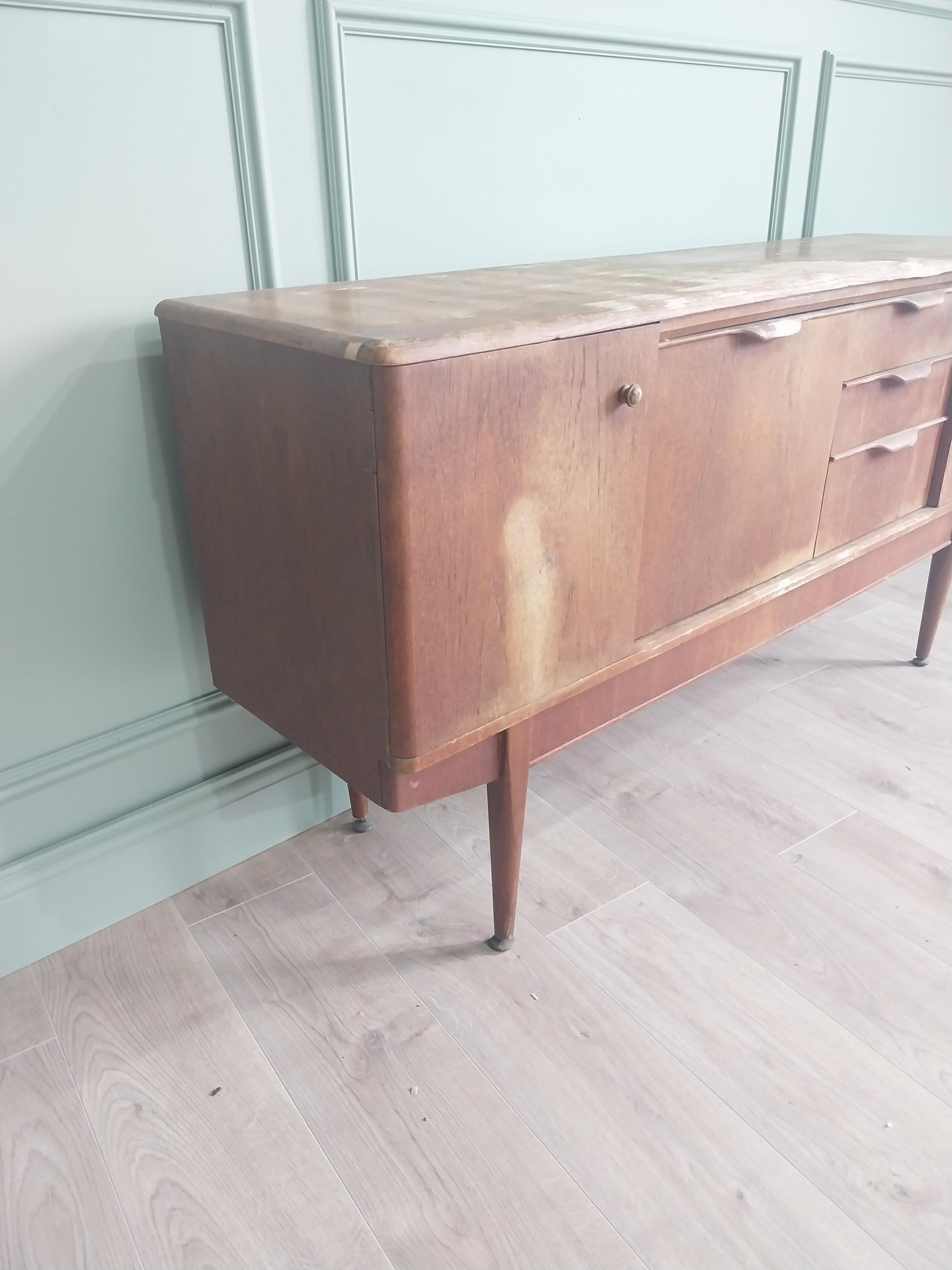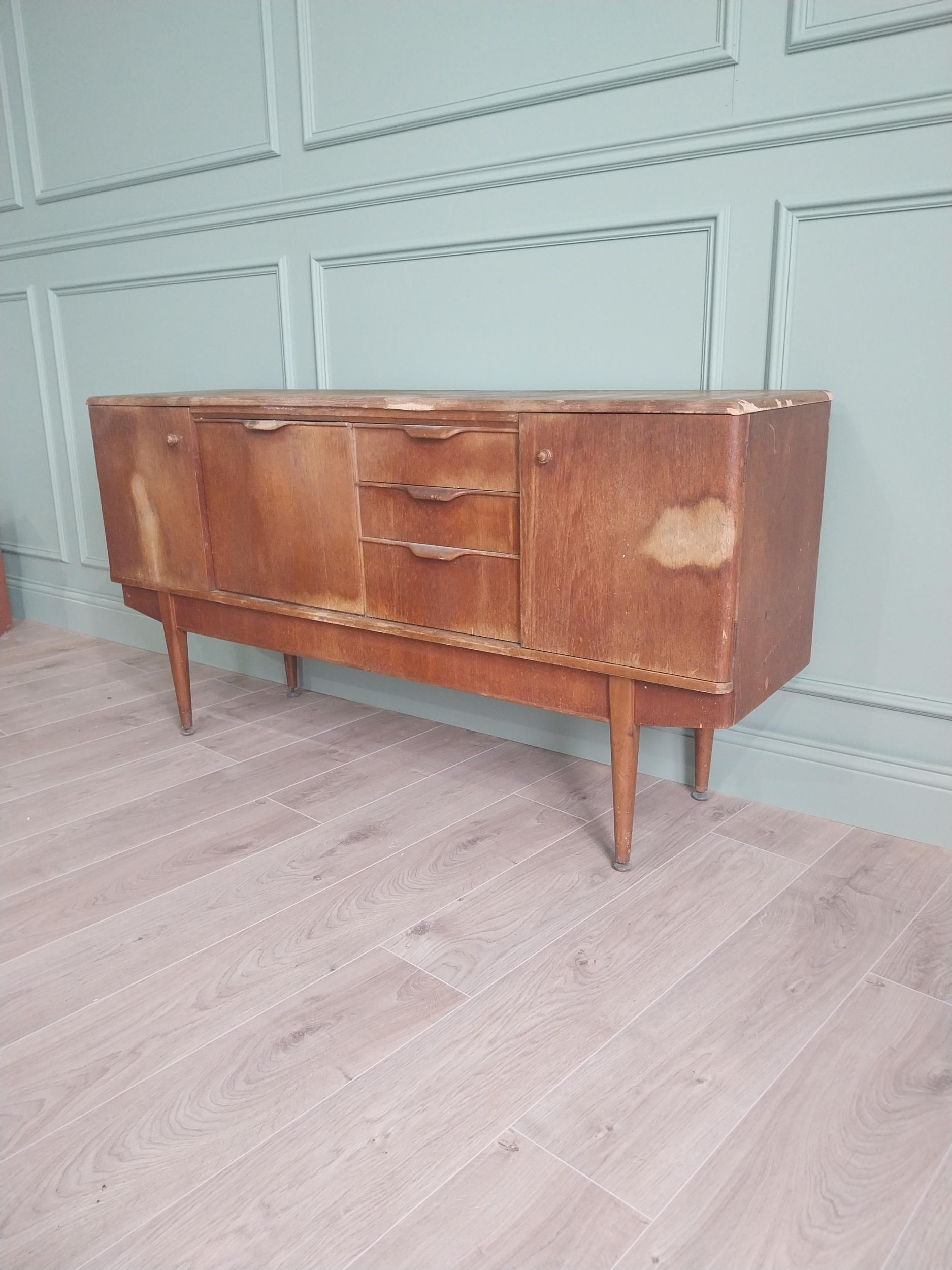 Mid-Century teak side board raised on tapered legs {78 cm H x 151 cm W x 42 cm D}. U