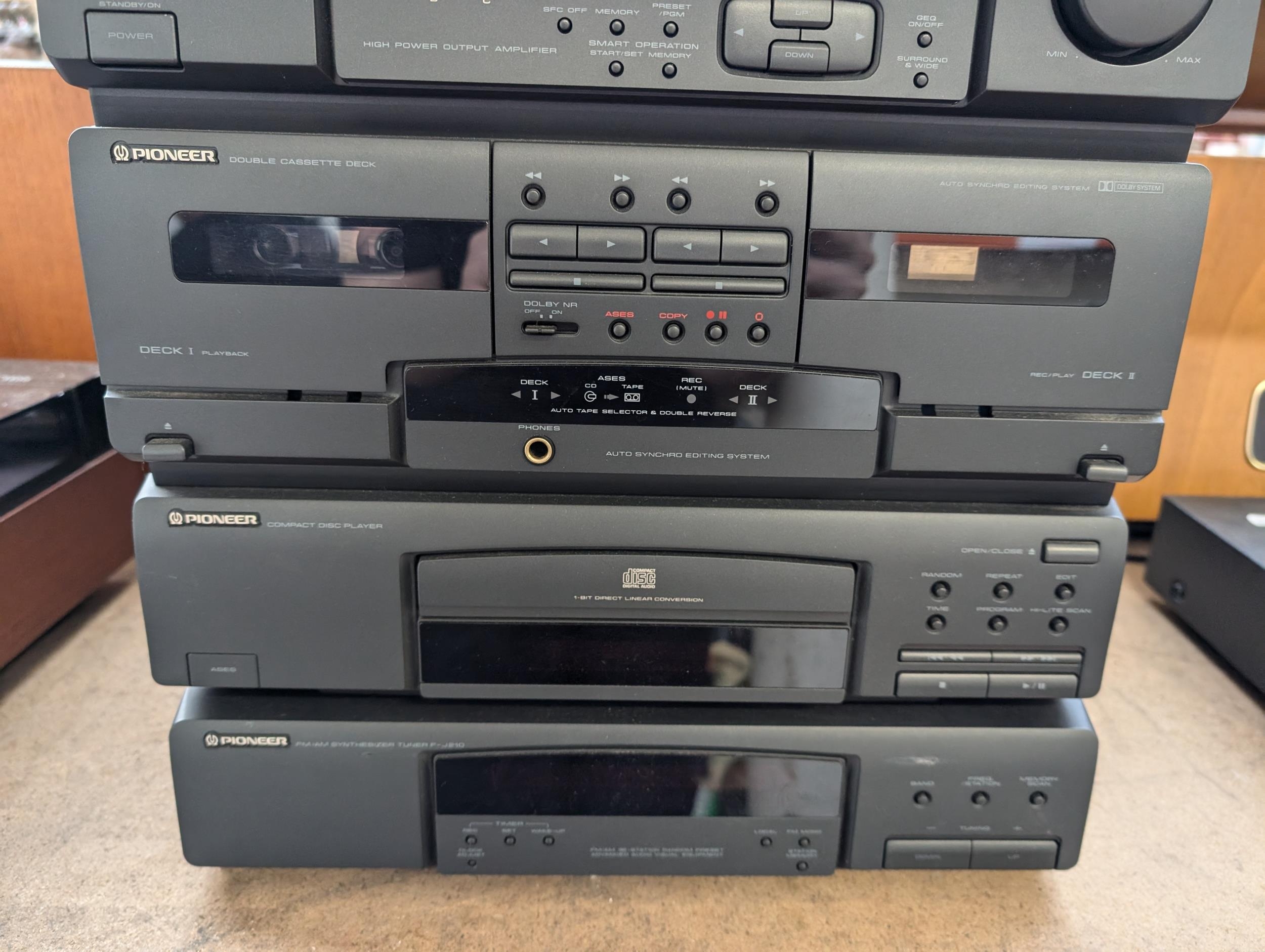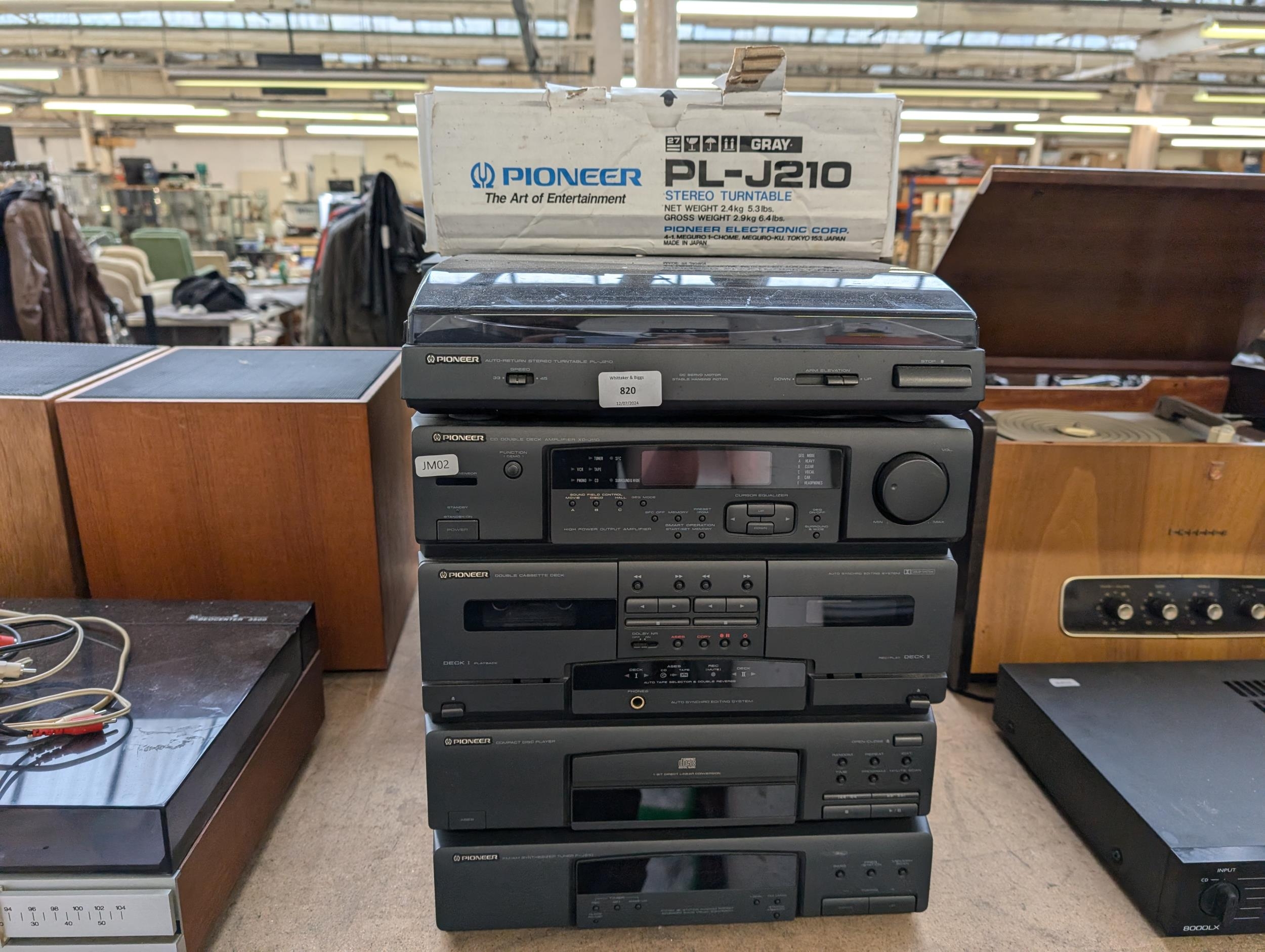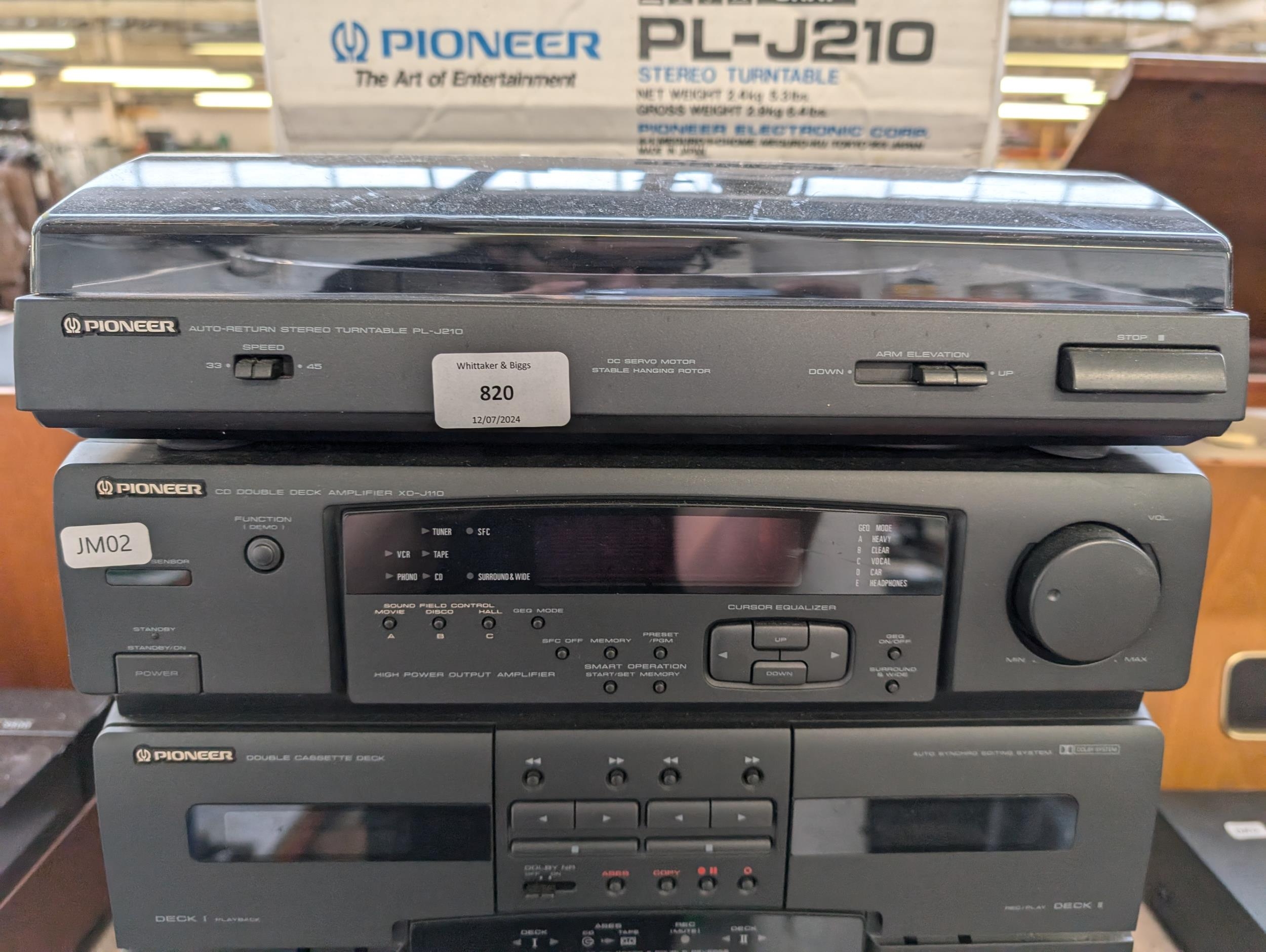 A Pioneer stereo system comprising PL-J210 two-speed turntable with box, XD-J110 amplifier/CD player/twin cassette deck, F-J210 FM/Am tuner and a pair of S-J210 speakers