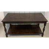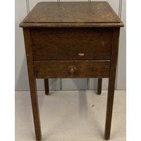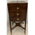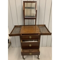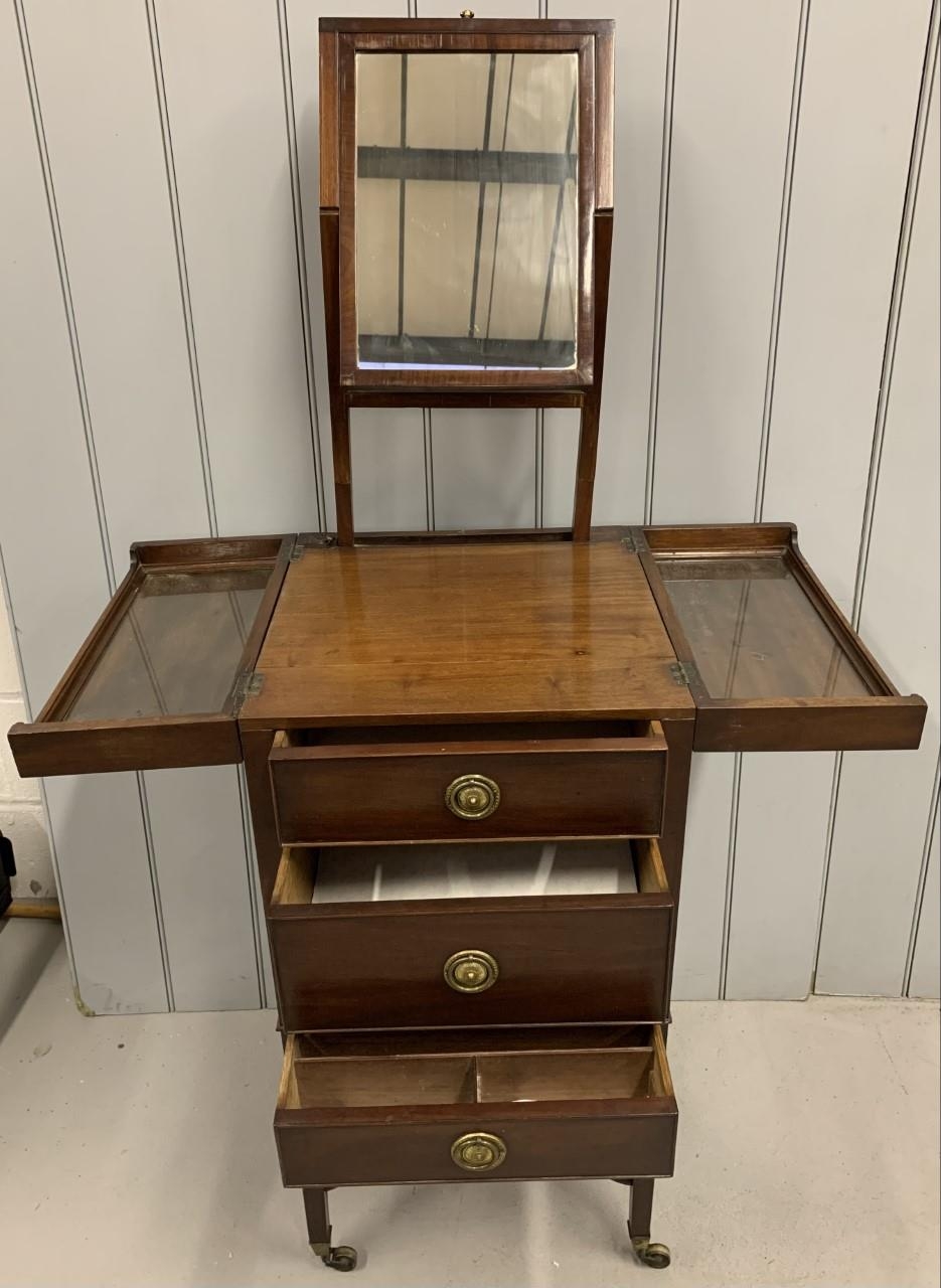 An Edwardian, campaign-style dressing table/washstand. Double hinged top houses an integrated/adjustable mirror. Three drawers, with brass drawer handles, castors & carry handles.
