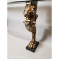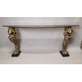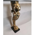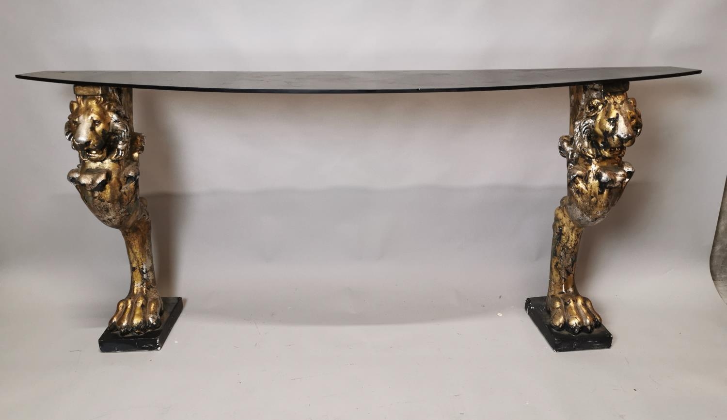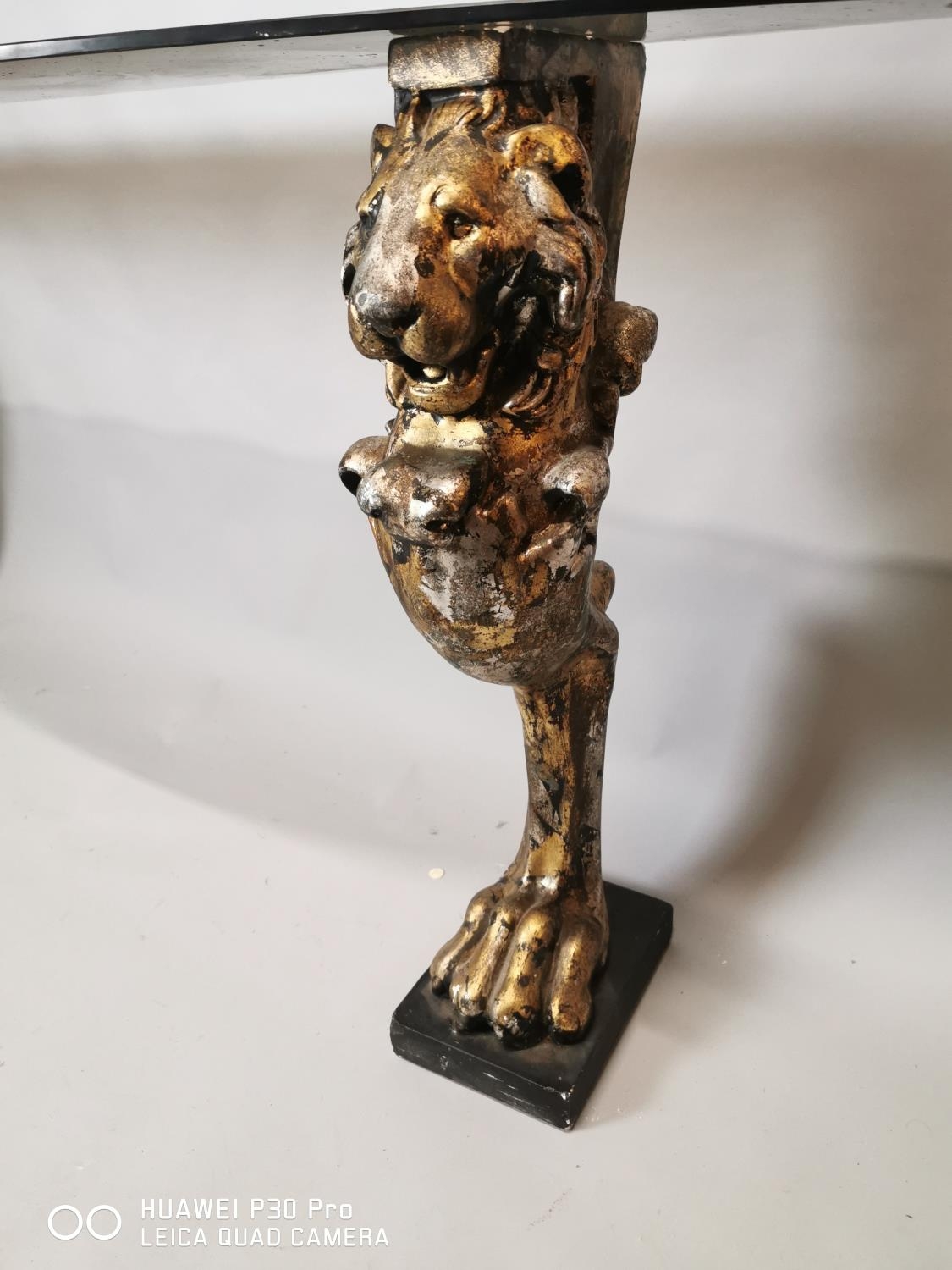 Good quality glass console table raised on composition lions supports {84 cm H x 200 cm W x 40 cm D}.