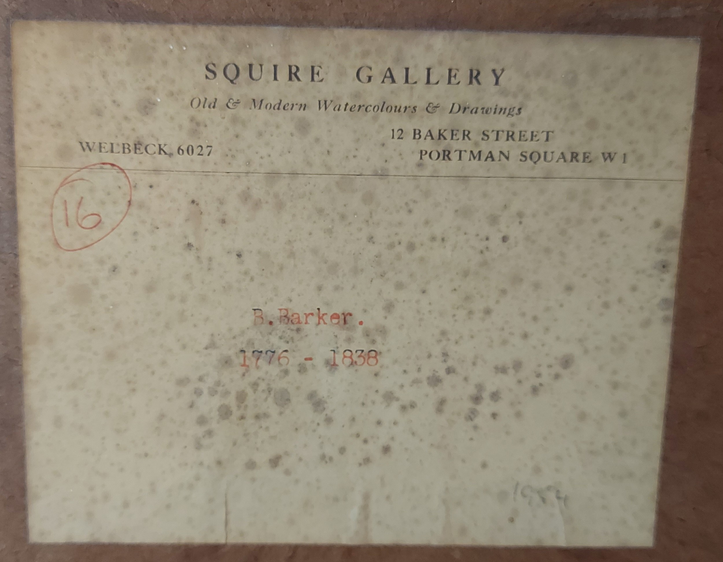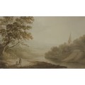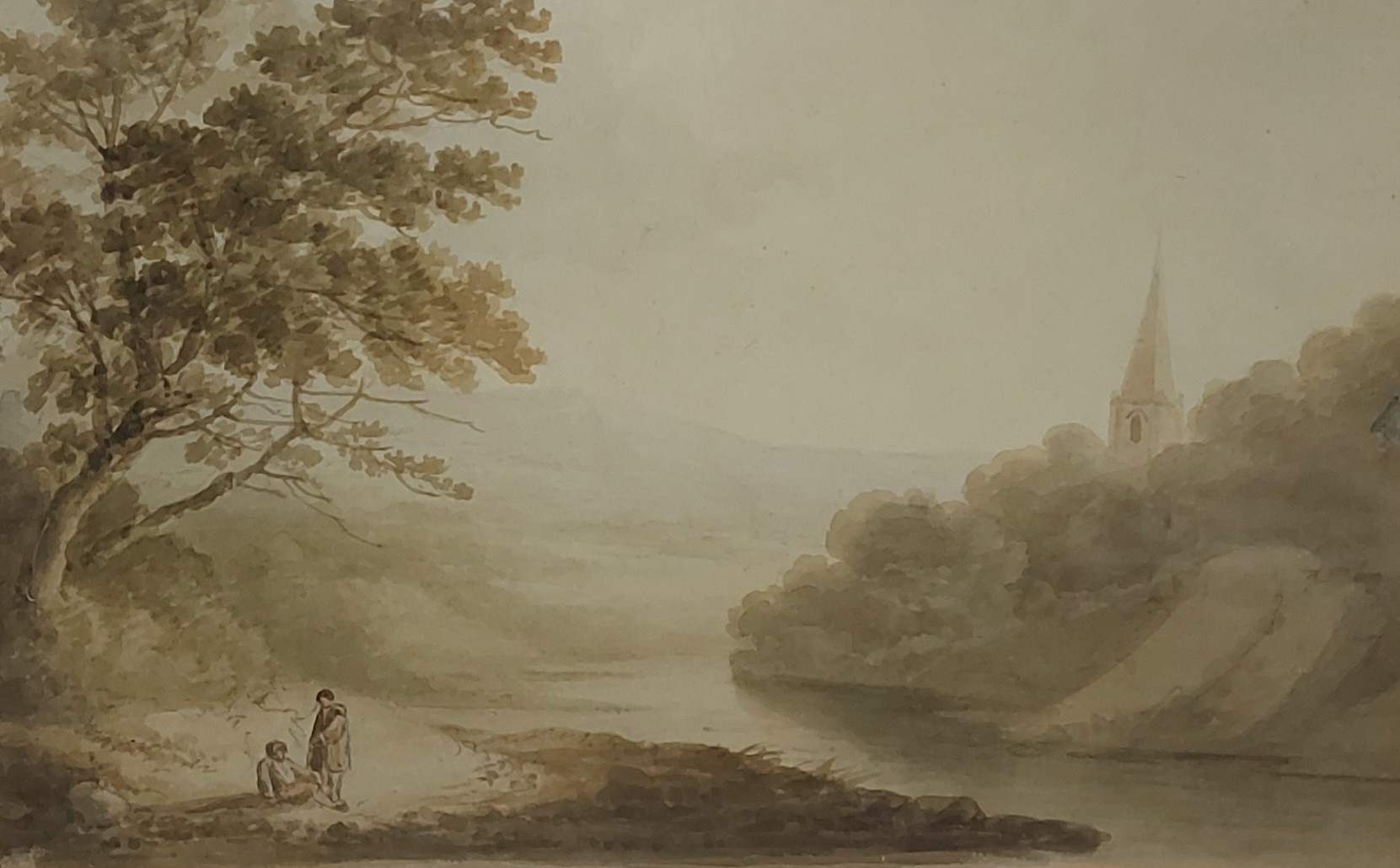 Attributed to Benjamin Barker, river landscape with figures and a church, watercolour, 24cms x 35cms