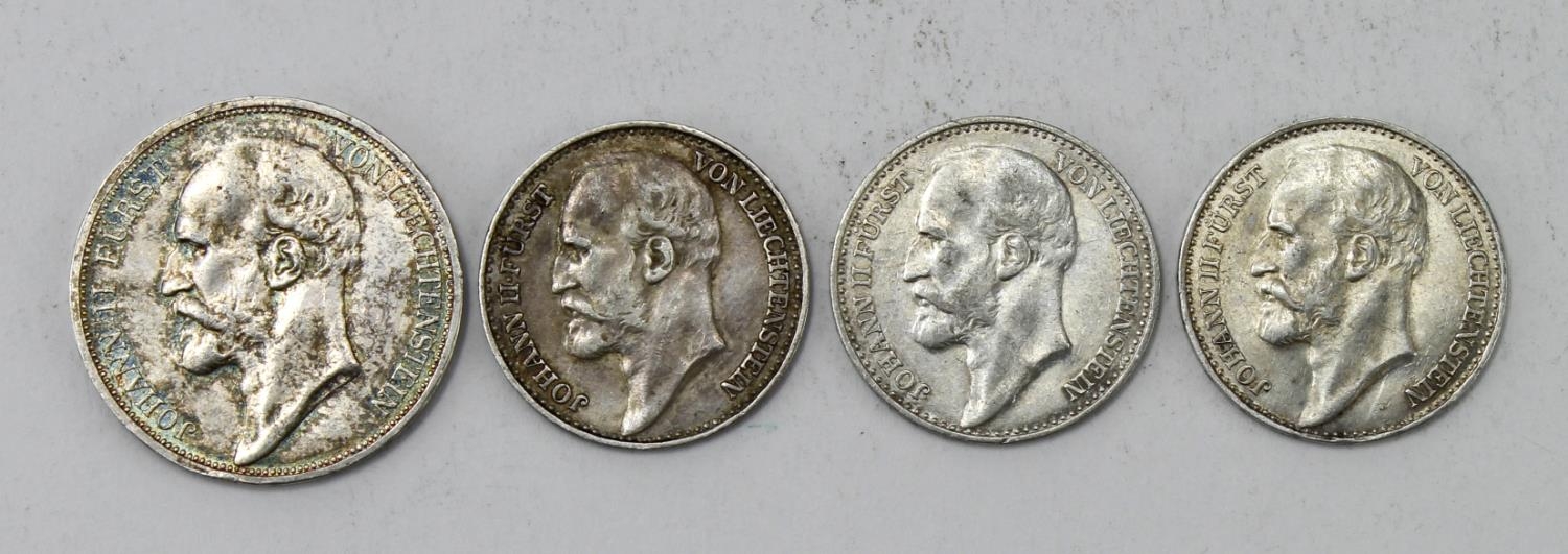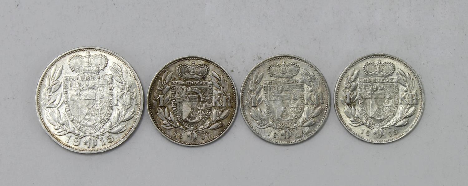 Liechtenstein silver (4): 2 Krone 1915 EF; 1 Krone: 1900 VF, 1904 VF, and 1915 EF