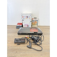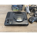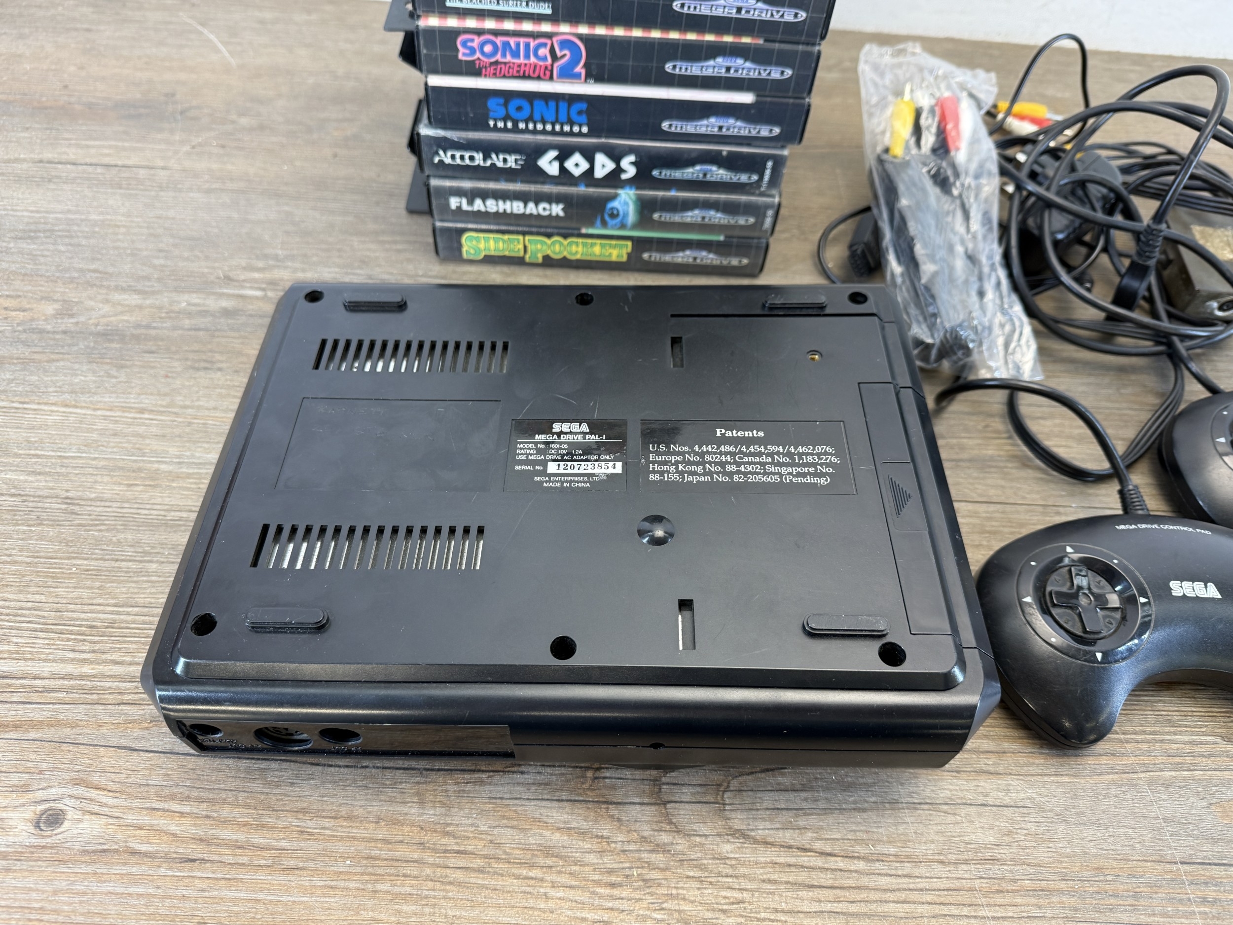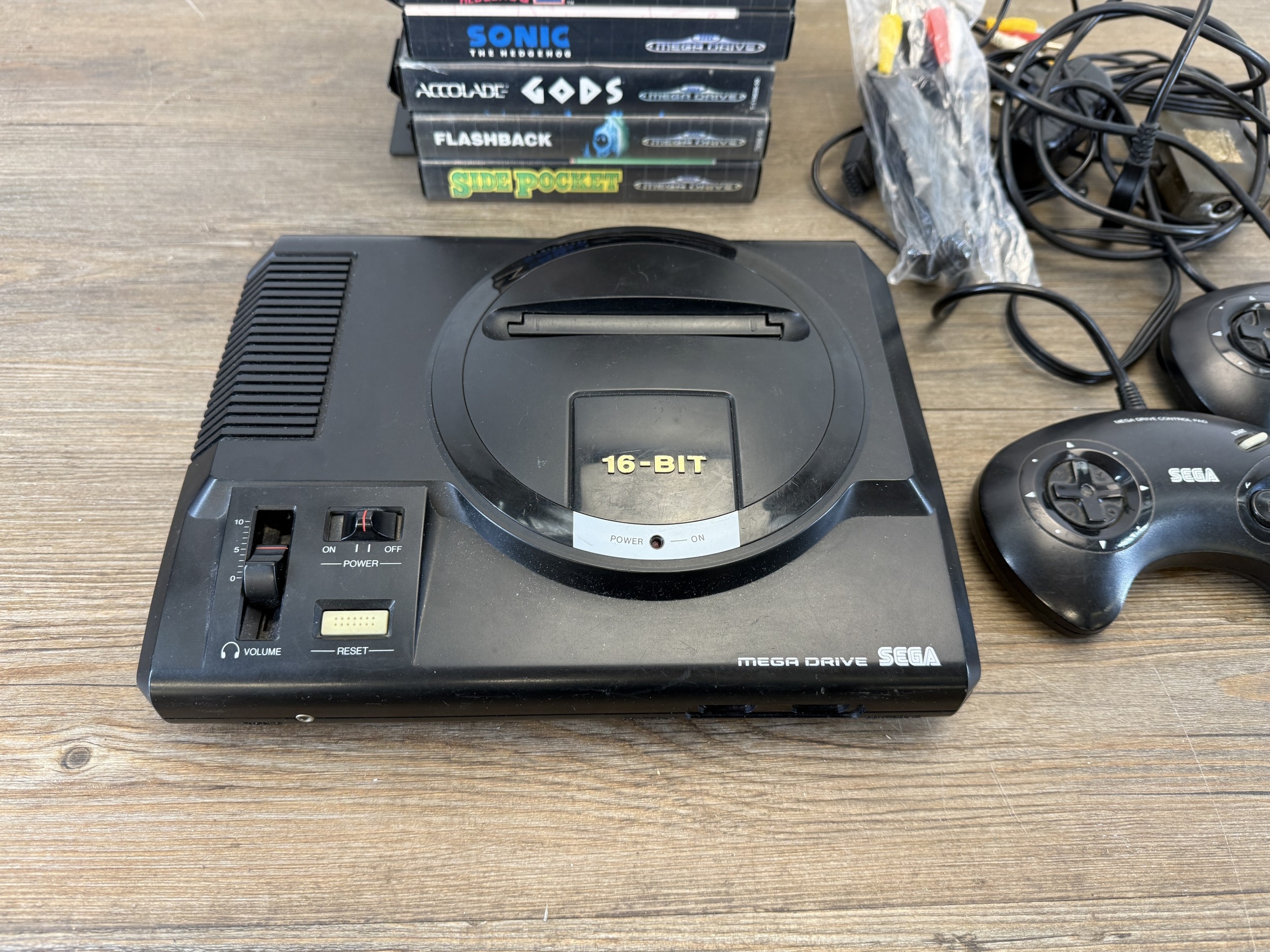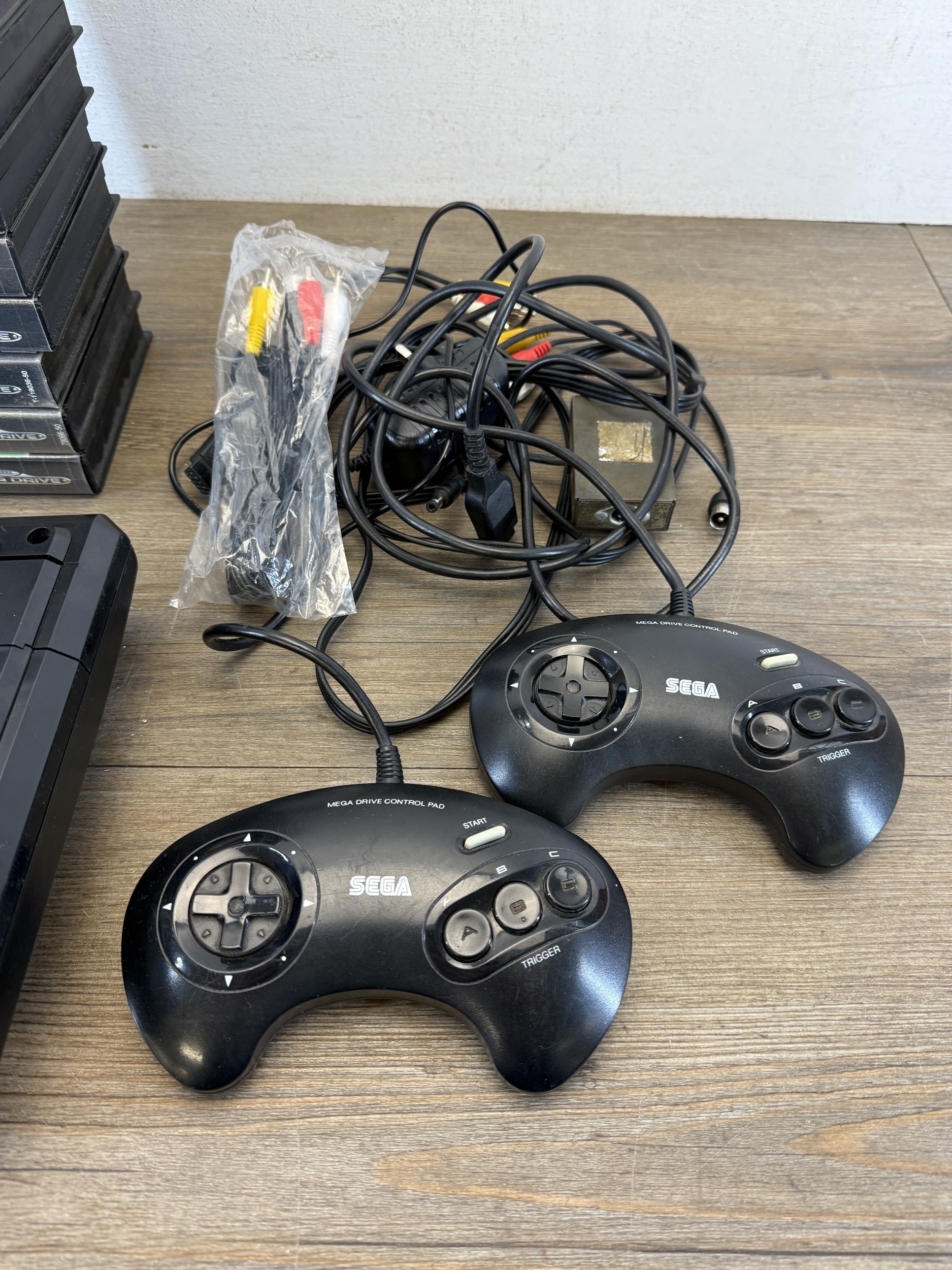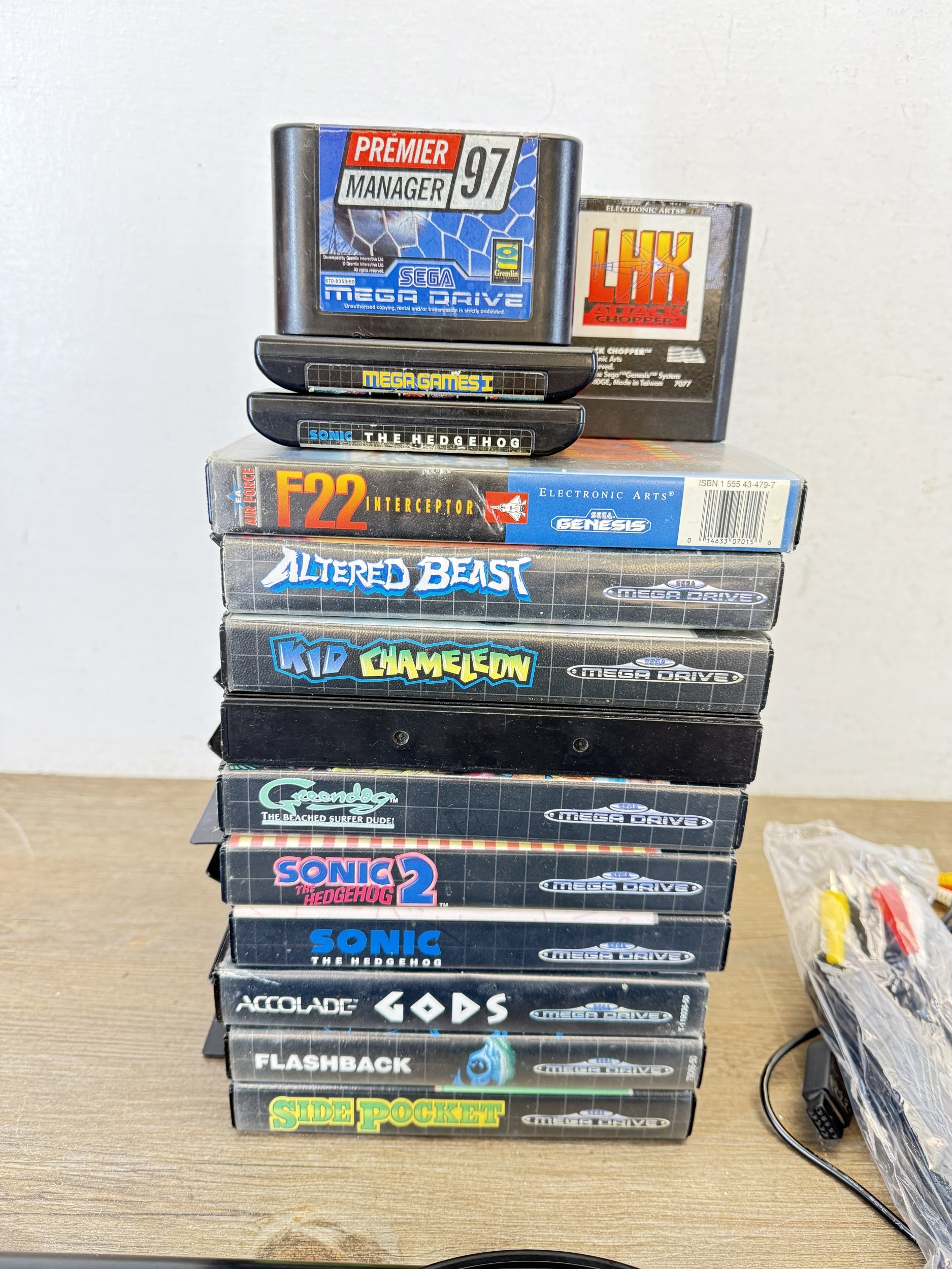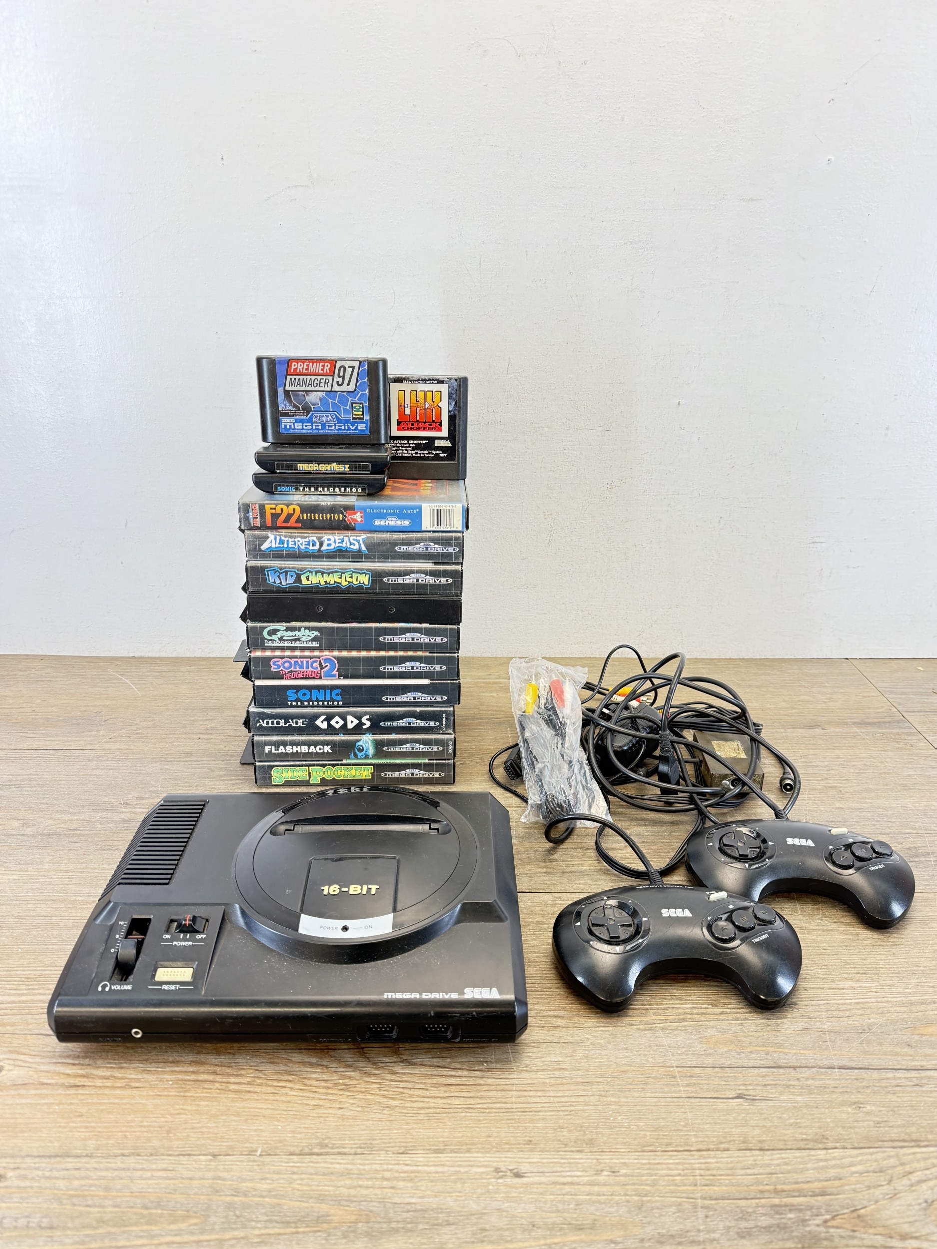 A SEGA Mega Drive 16-BIT game console with cables, two controllers and fourteen games to include Sonic The Hedgehog, Altered Beast, Kid Chameleon etc.