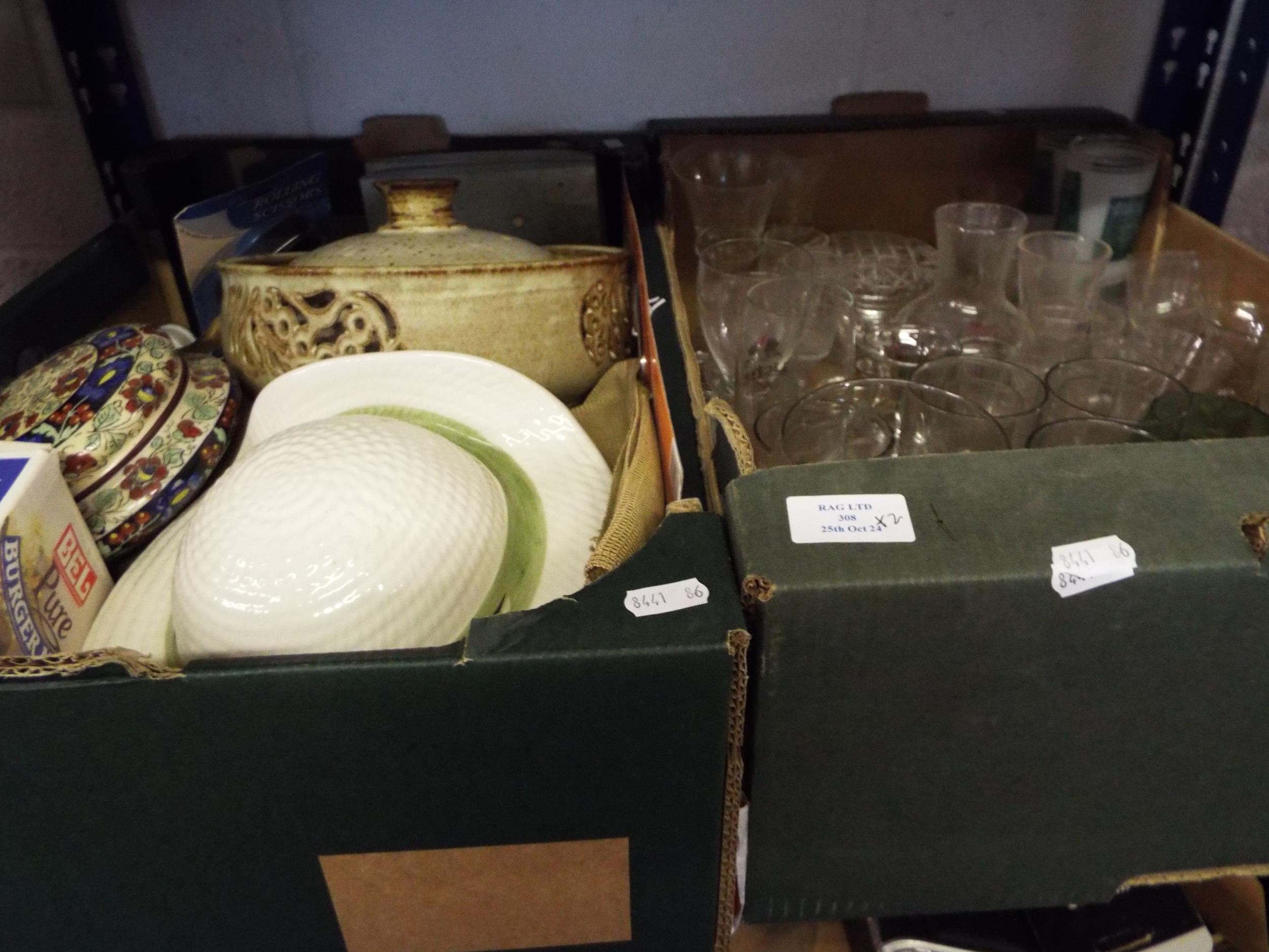 Two boxes of assorted items to include glasses, china, kitchenalia etc