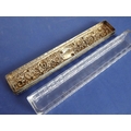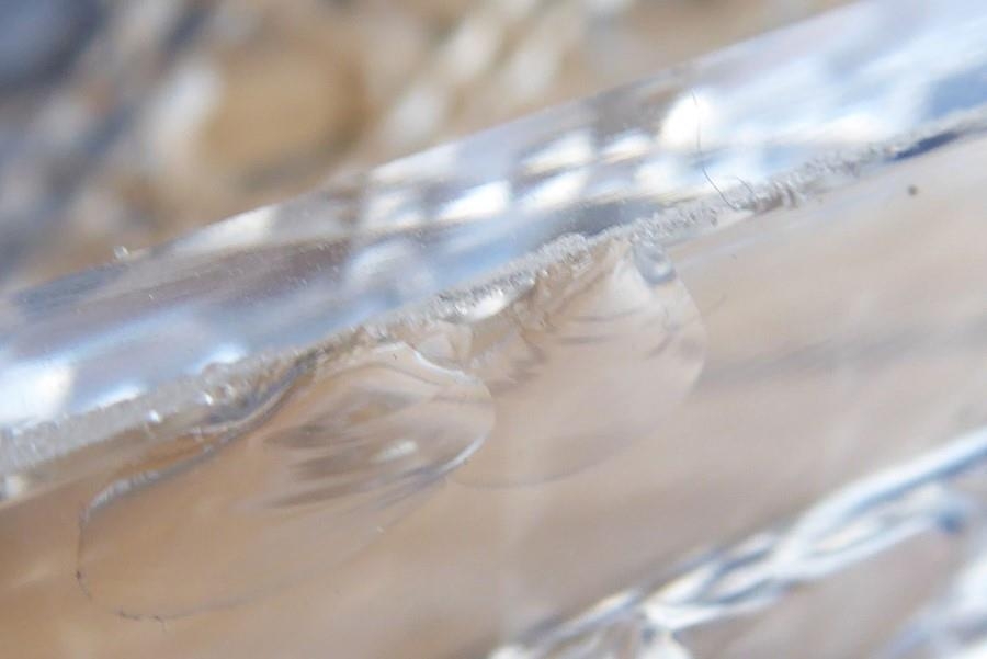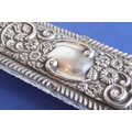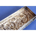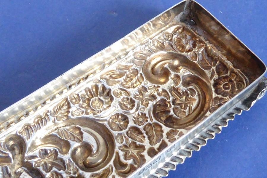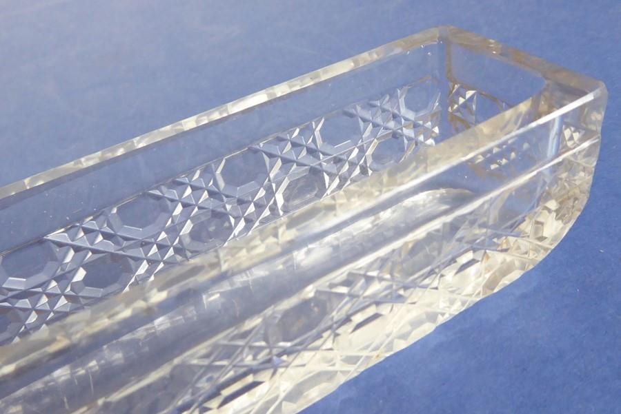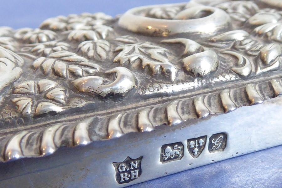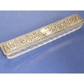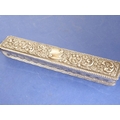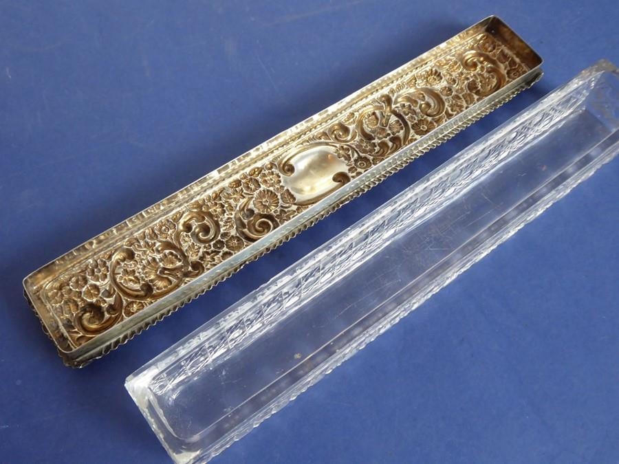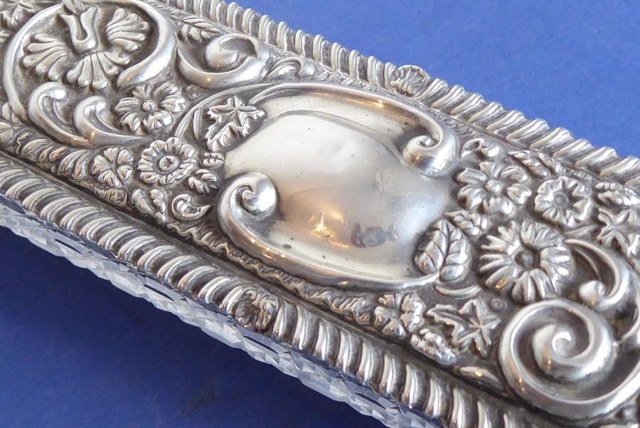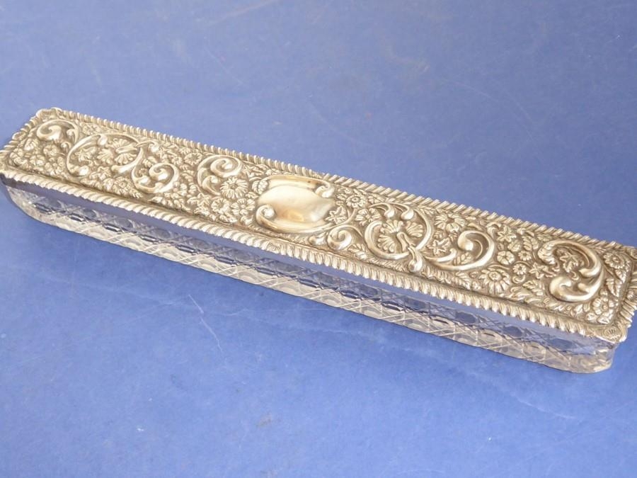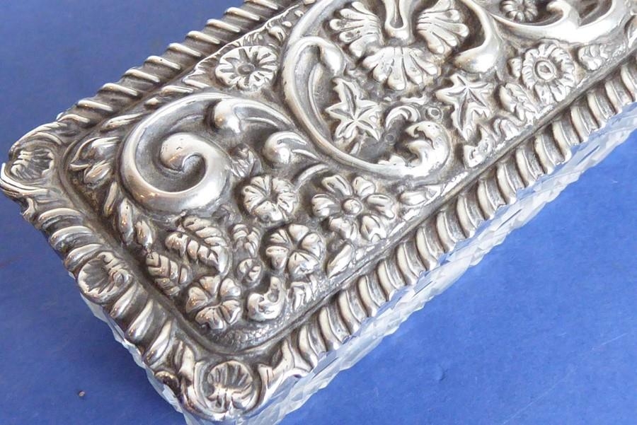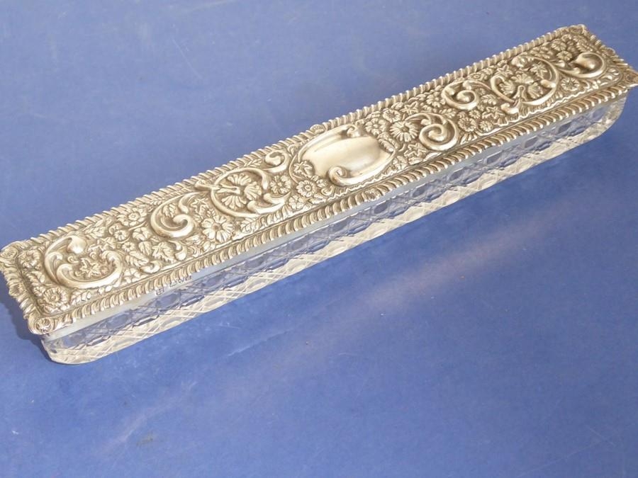 A long rectangular cut-glass lady's dressing table requisite box having silver-mounted lid (small double match-head size chip to outside top of glass base), the lid with central vacant cartouche amongst C-scrolls and scrolling foliage and flower heads etc. in repoussé style, maker's mark G. N. R. H, assayed Chester 1907 (the silver lid 29cm)