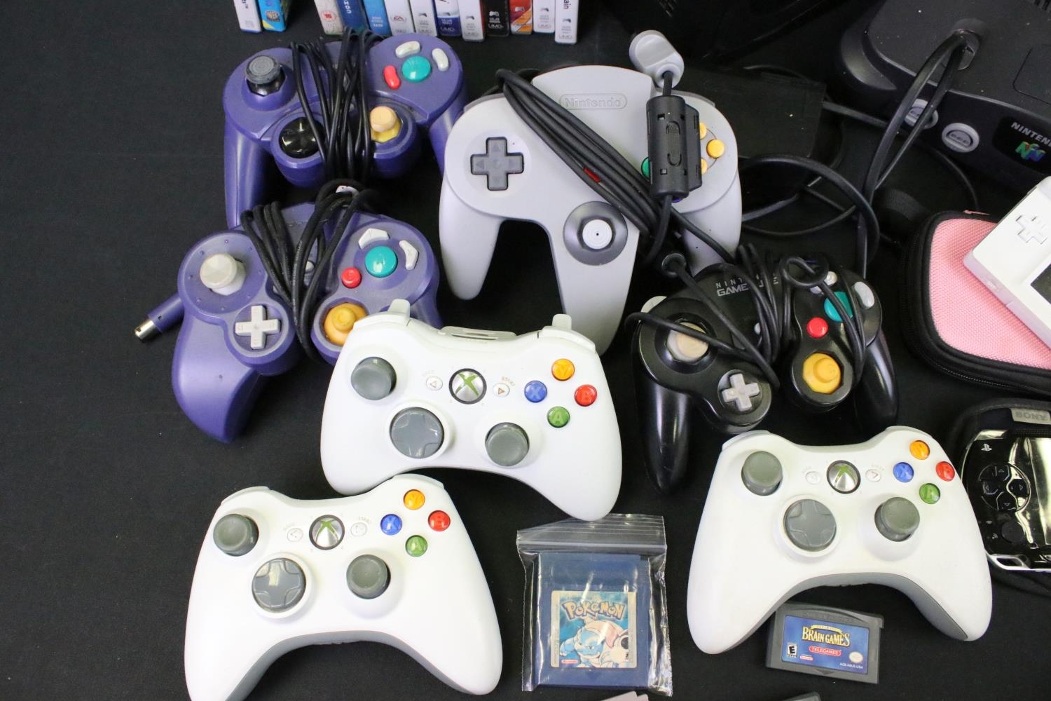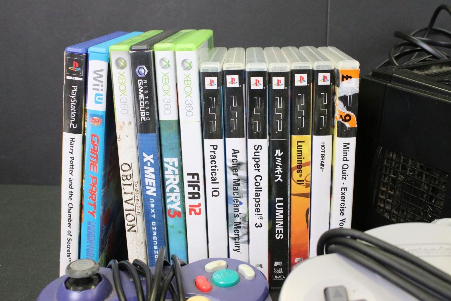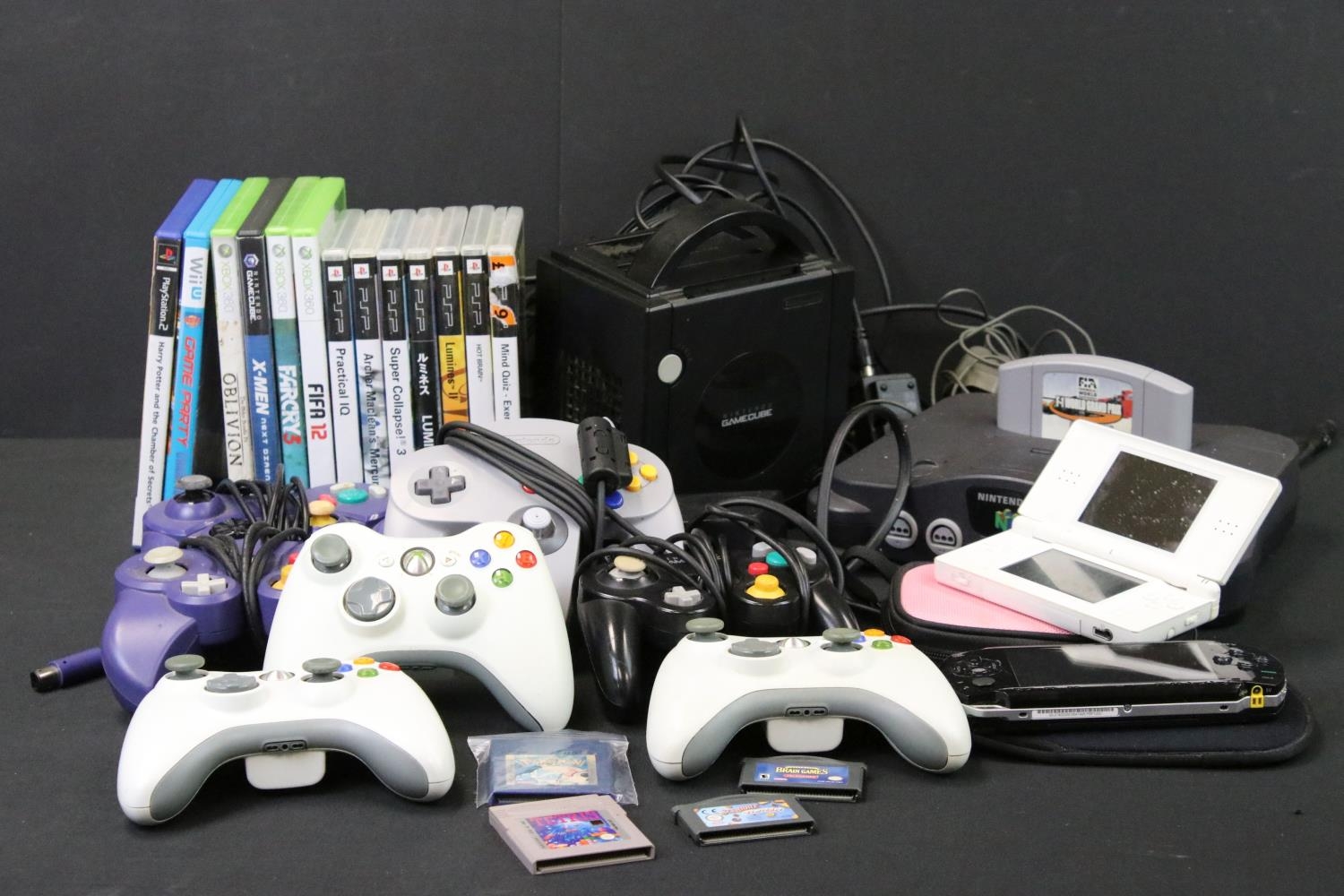 Retro Gaming - Four gaming consoles to include Nintendo 64 (N64) console with original controller, F1 World Grand Prix, Nintendo Gamecube console with original controller, 2 x 3rd party controllers, cased X-Men Next Dimension, Sony Playstation Portable (PSP) with 7 x cased games (Practical IQ, Archer Maclean's Mercury, Super Collapse! 3, Lumines, Lumines II, Hot Brain & Mind Quiz) & Nintendo DS Lite with 3 x DS games (Mario and Sonic At The Olympic Games, My World Coach & Sega Superstar Tennis), 4 x Gameboy games (Pokémon Blue Version, Tetris, Scrabble Scramble & Ultimate Brain Games), along with 3 x Xbox 360 controllers 3 x cased Xbox 360 (Fifa 12, Far Cry 3 & The Elder Scrolls IV Oblivion), cased Wii U Game Party & cased Playstation 2 Harry Potter And The Chamber Of Secrets