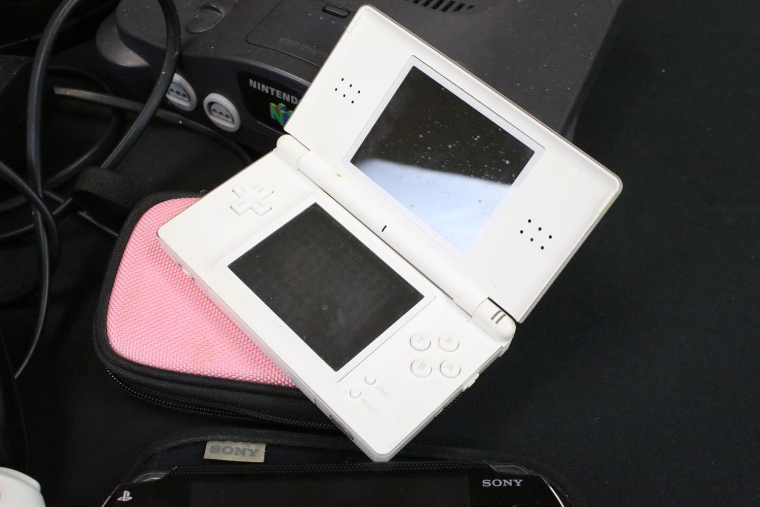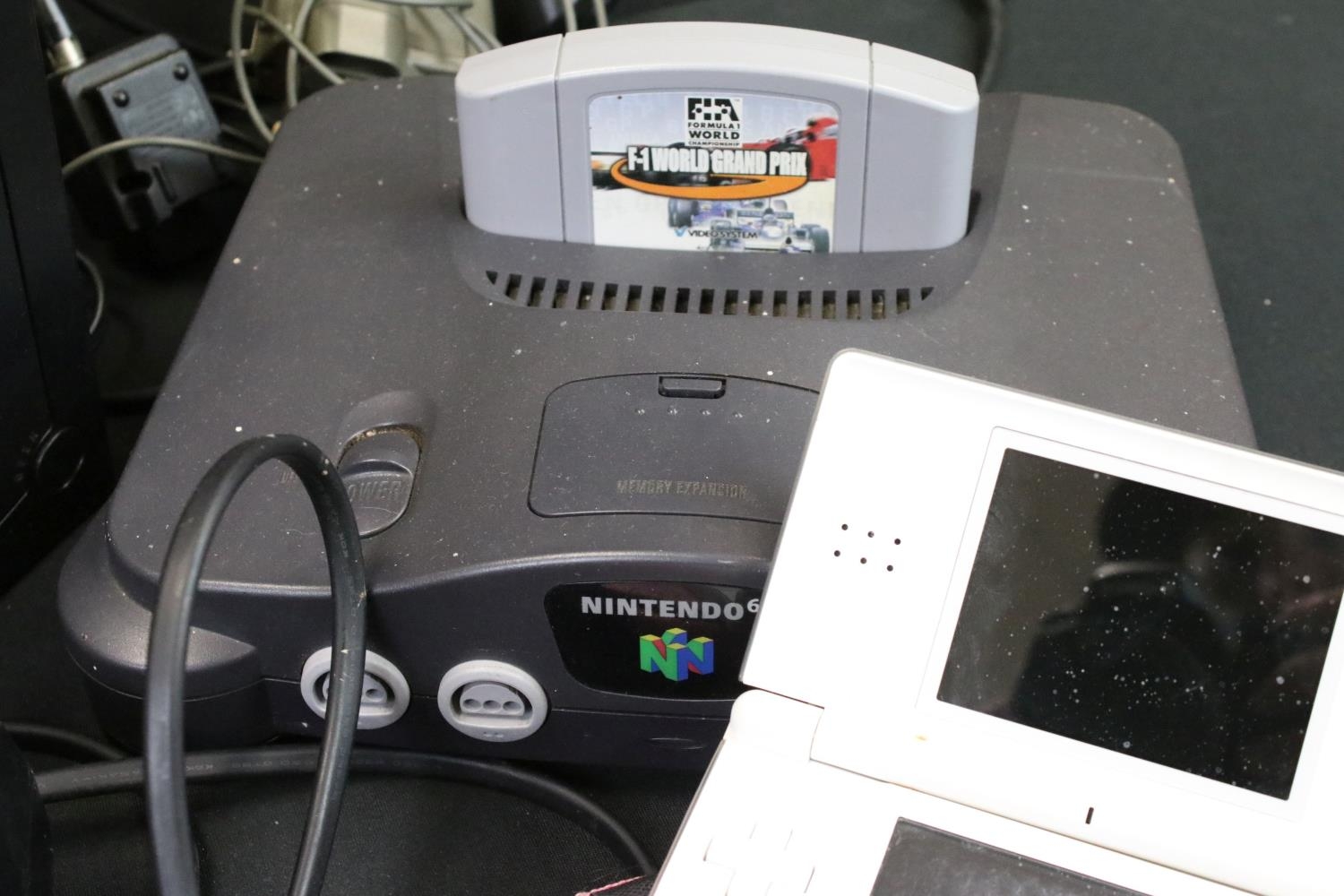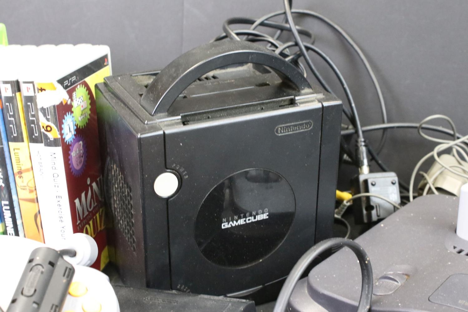 Retro Gaming - Four gaming consoles to include Nintendo 64 (N64) console with original controller, F1 World Grand Prix, Nintendo Gamecube console with original controller, 2 x 3rd party controllers, cased X-Men Next Dimension, Sony Playstation Portable (PSP) with 7 x cased games (Practical IQ, Archer Maclean's Mercury, Super Collapse! 3, Lumines, Lumines II, Hot Brain & Mind Quiz) & Nintendo DS Lite with 3 x DS games (Mario and Sonic At The Olympic Games, My World Coach & Sega Superstar Tennis), 4 x Gameboy games (Pokémon Blue Version, Tetris, Scrabble Scramble & Ultimate Brain Games), along with 3 x Xbox 360 controllers 3 x cased Xbox 360 (Fifa 12, Far Cry 3 & The Elder Scrolls IV Oblivion), cased Wii U Game Party & cased Playstation 2 Harry Potter And The Chamber Of Secrets