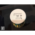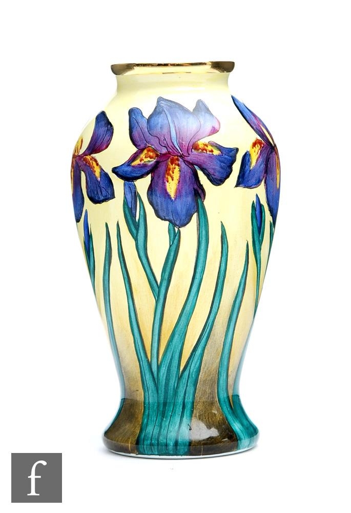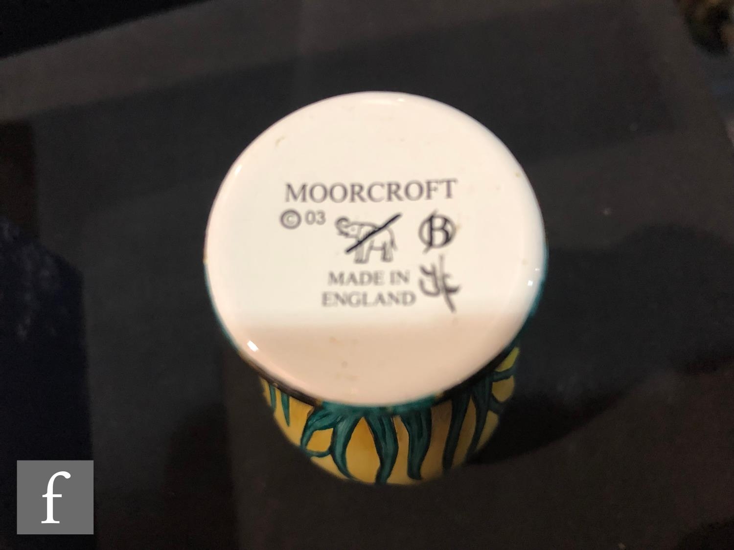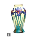 A Moorcroft Enamels vase decorated with hand painted purple flag iris against a pale yellow ground, printed mark, boxed, height 8cm.