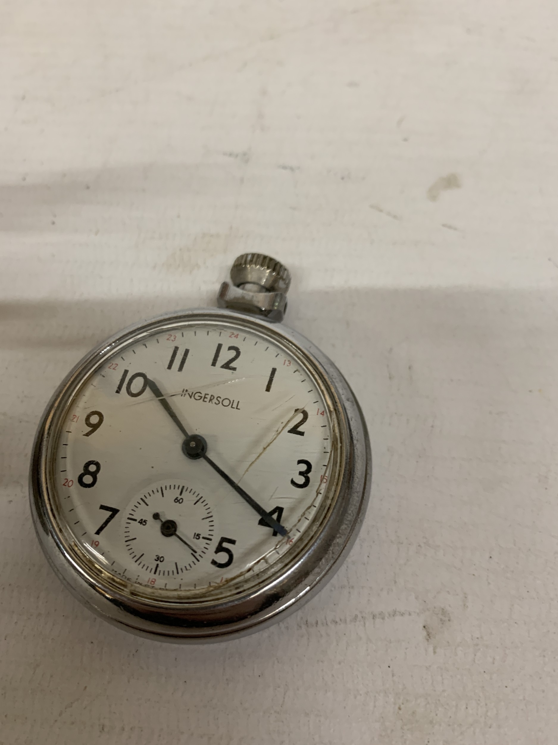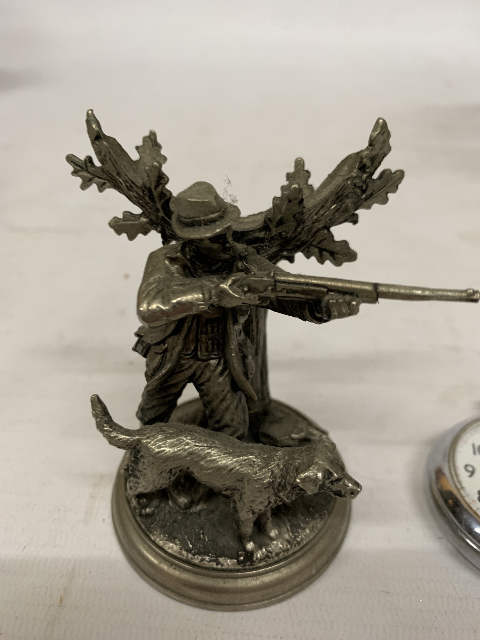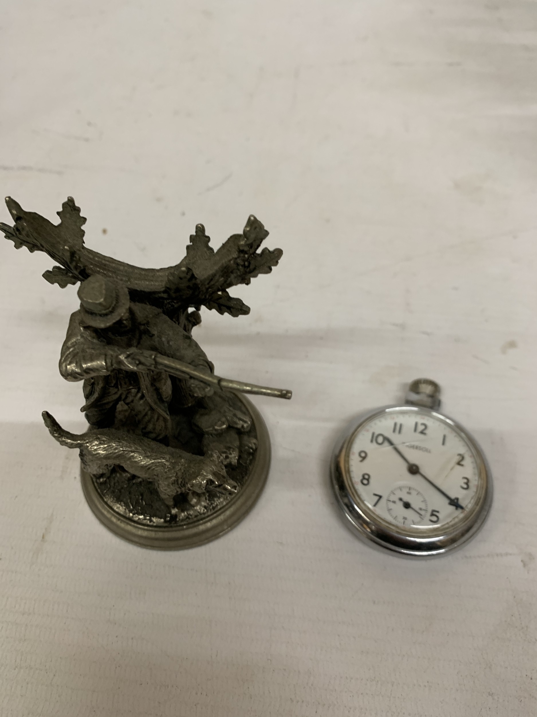 A HEAVY PEWTER GAME KEEPER WATCH STAND WITH AN INGERSOLL POCKET WATCH