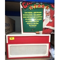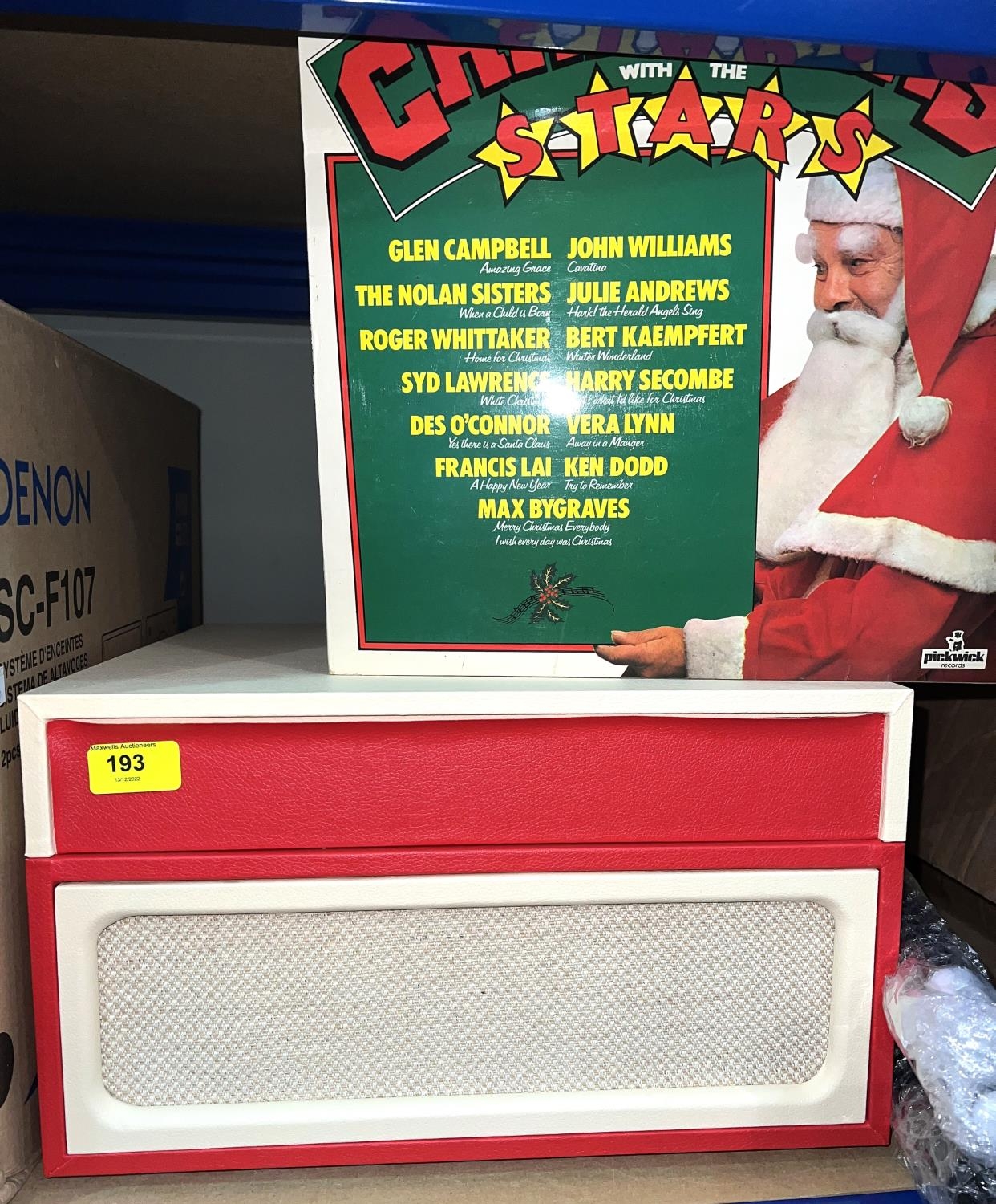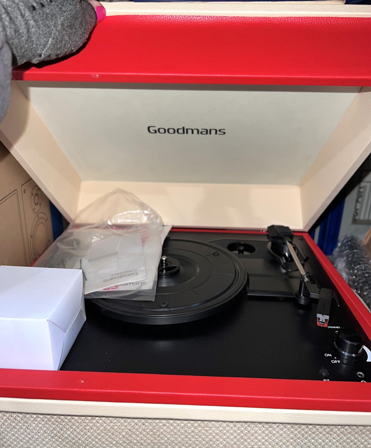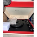 A Goodmans RETRO record player in orange and cream, record cleaners