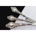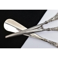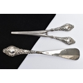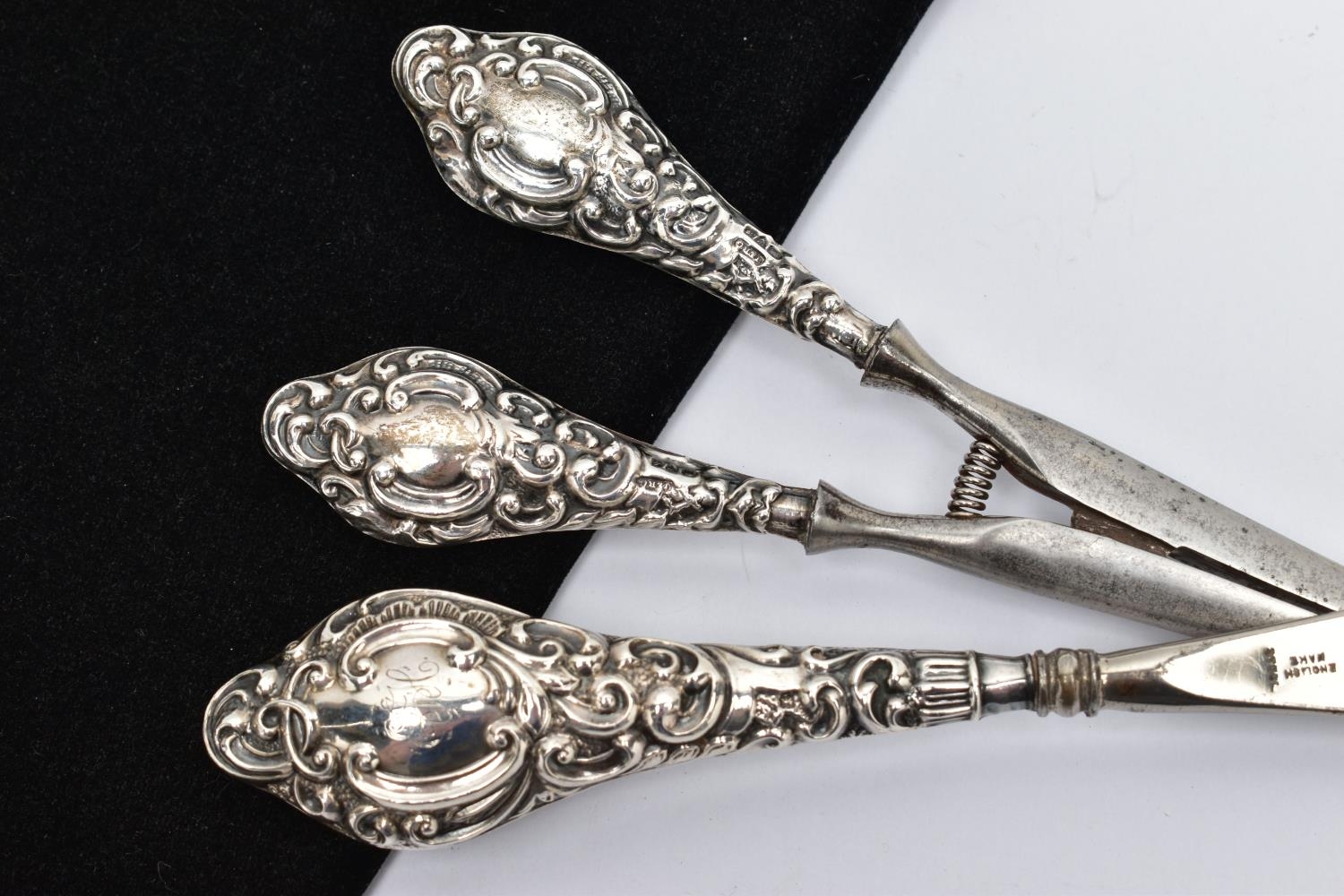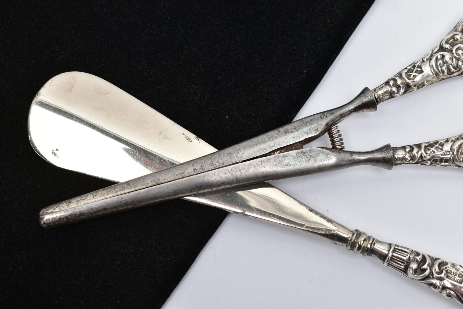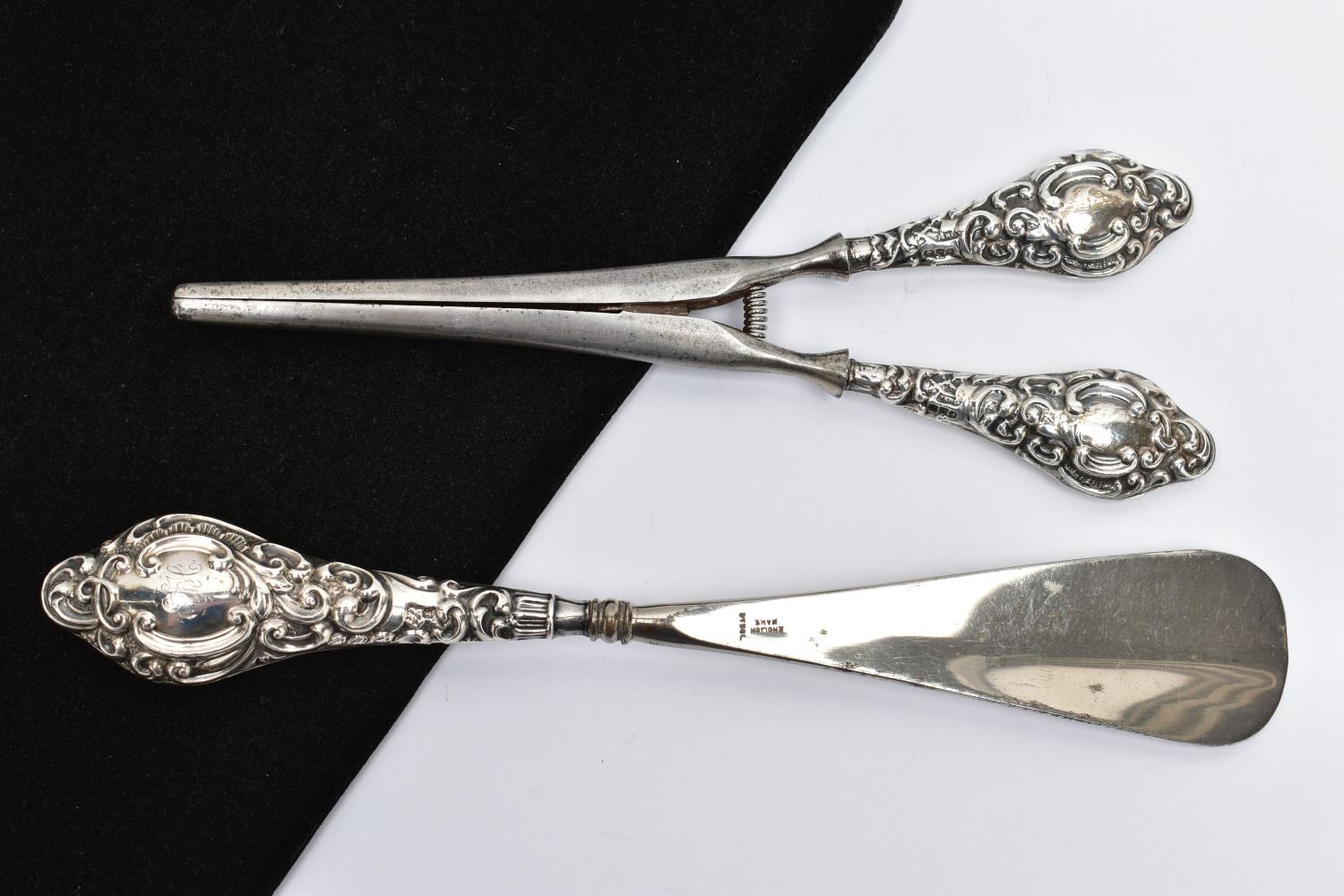 A SILVER HANDLED SHOEHORN AND GLOVE STRETCHERS, a matching set detailing a scrolling foliage design, hallmarked J & R Griffin Chester 1904 and 1909, approximate gross weight 174.1 grams, 5.6 ozt, (condition report: general moderate wear, overall good condition)