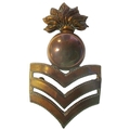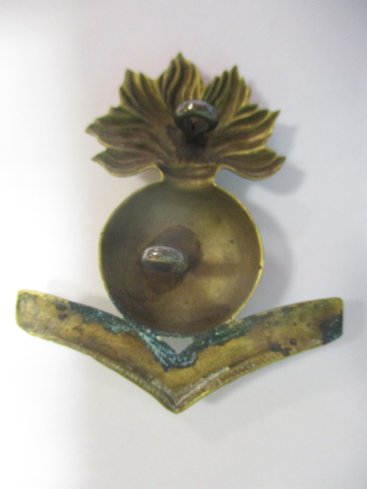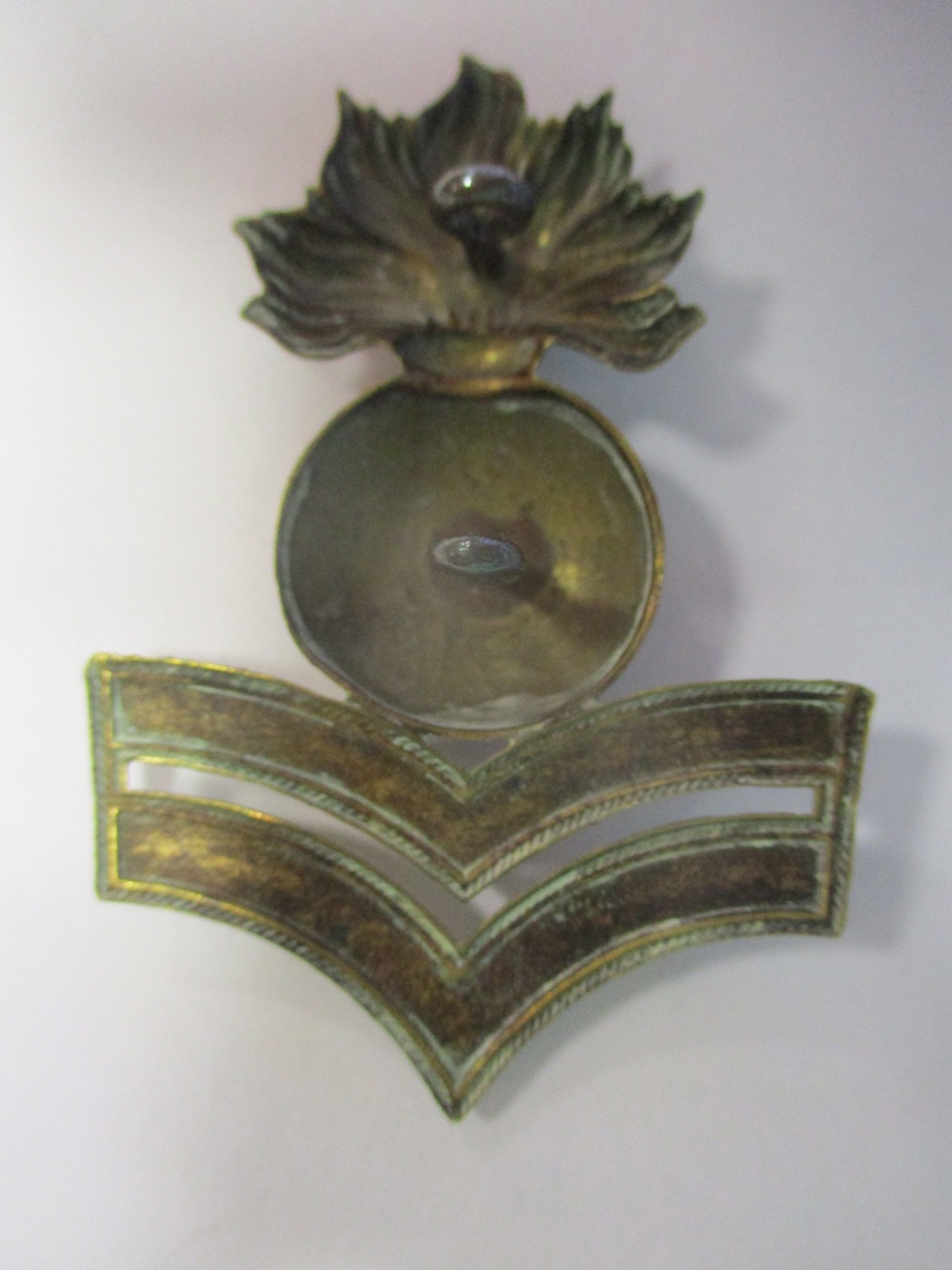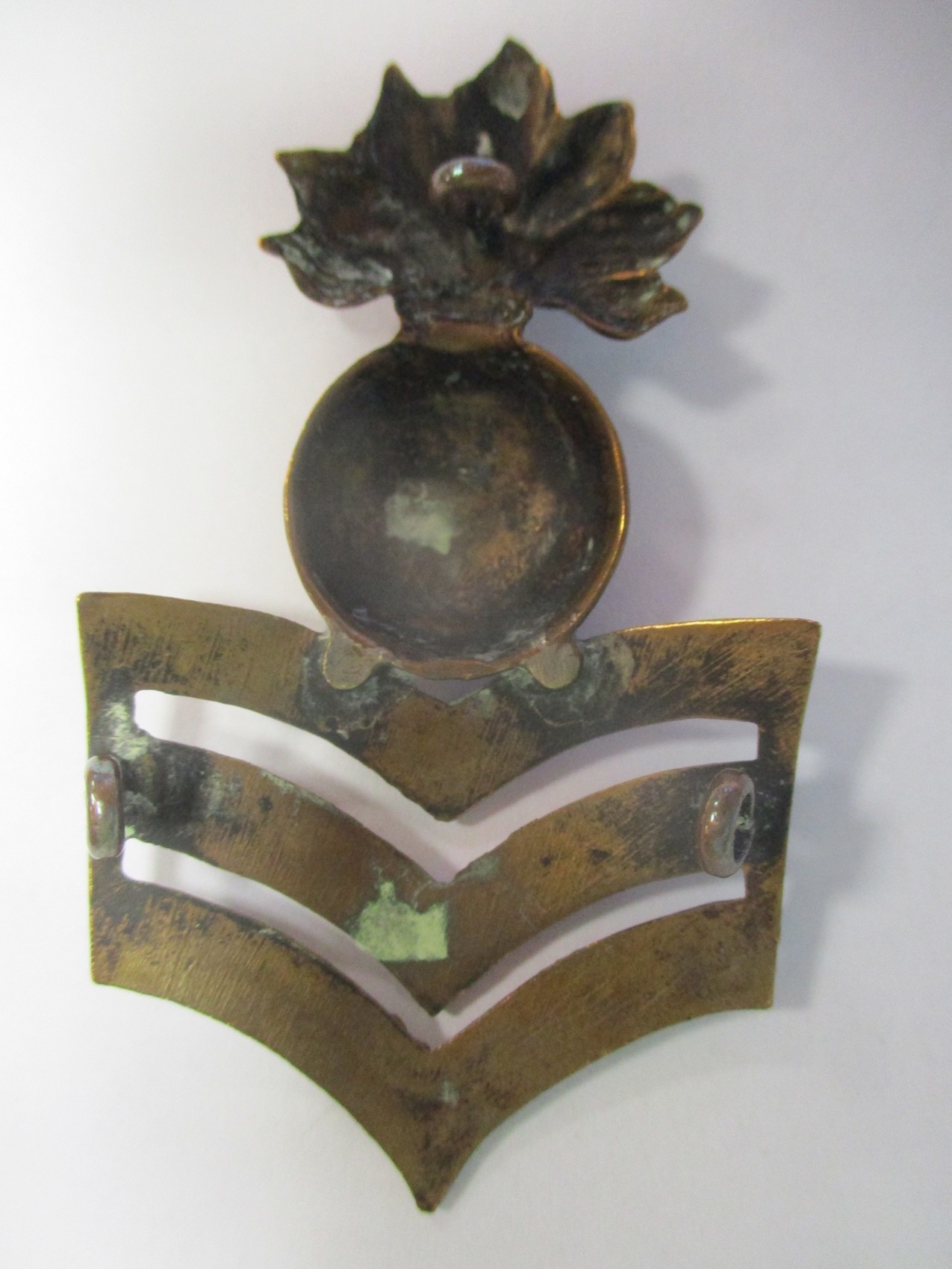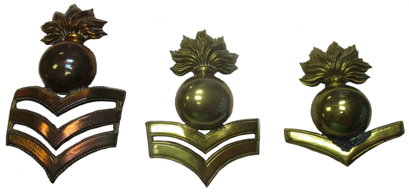 Royal Marine Artillery 1855-57 undress cap badge range with Lance-Sergeant, Bombardier and Lance-Bombardier, fused grenade over appropriate chevron, minor verdigris to chevron on Lance-Bombardier, otherwise very fine or better. Qty 3 (Y)