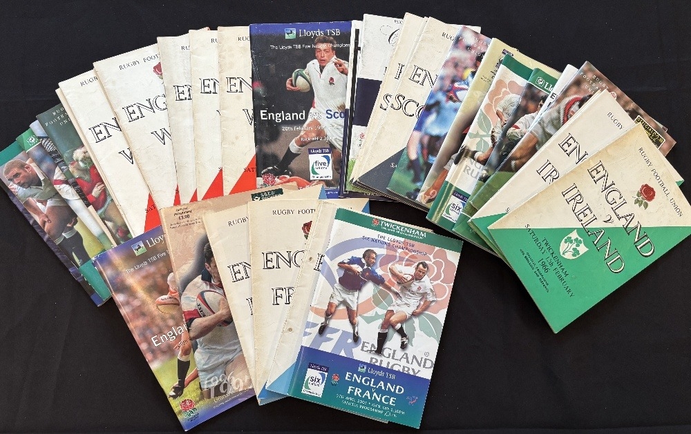 England Home 5/6 Nations Rugby Programmes (40): v Wales 1964, 66, 68 (3), 70, 72 (2), 80, 92, 94, 96, 98, 2000 and 02; v Ireland 66, 68, 70, 72, 94, 96 and 98; v Scotland 67, 71, 73, 75, 87, 93, 95, 97 and 99; v France 57 (p/h), 67, 71, 73, 75, 97, 99 and 2001; plus v Italy 2001. G/VG