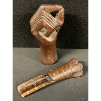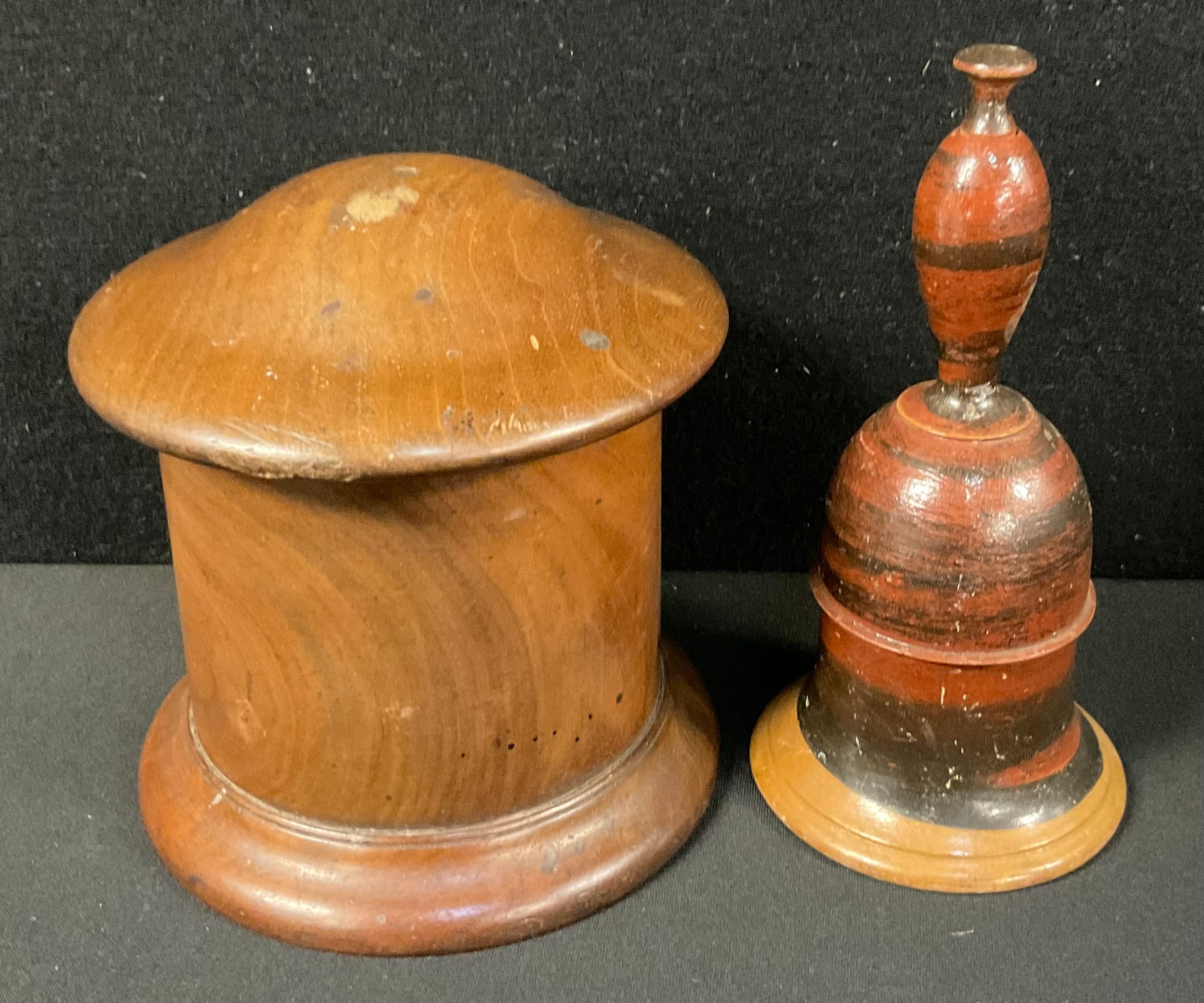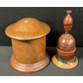 Treen - a 19th century lignum vitae string box, 13cm high; another, a child’s painted wooden bell, 15cm high (2)