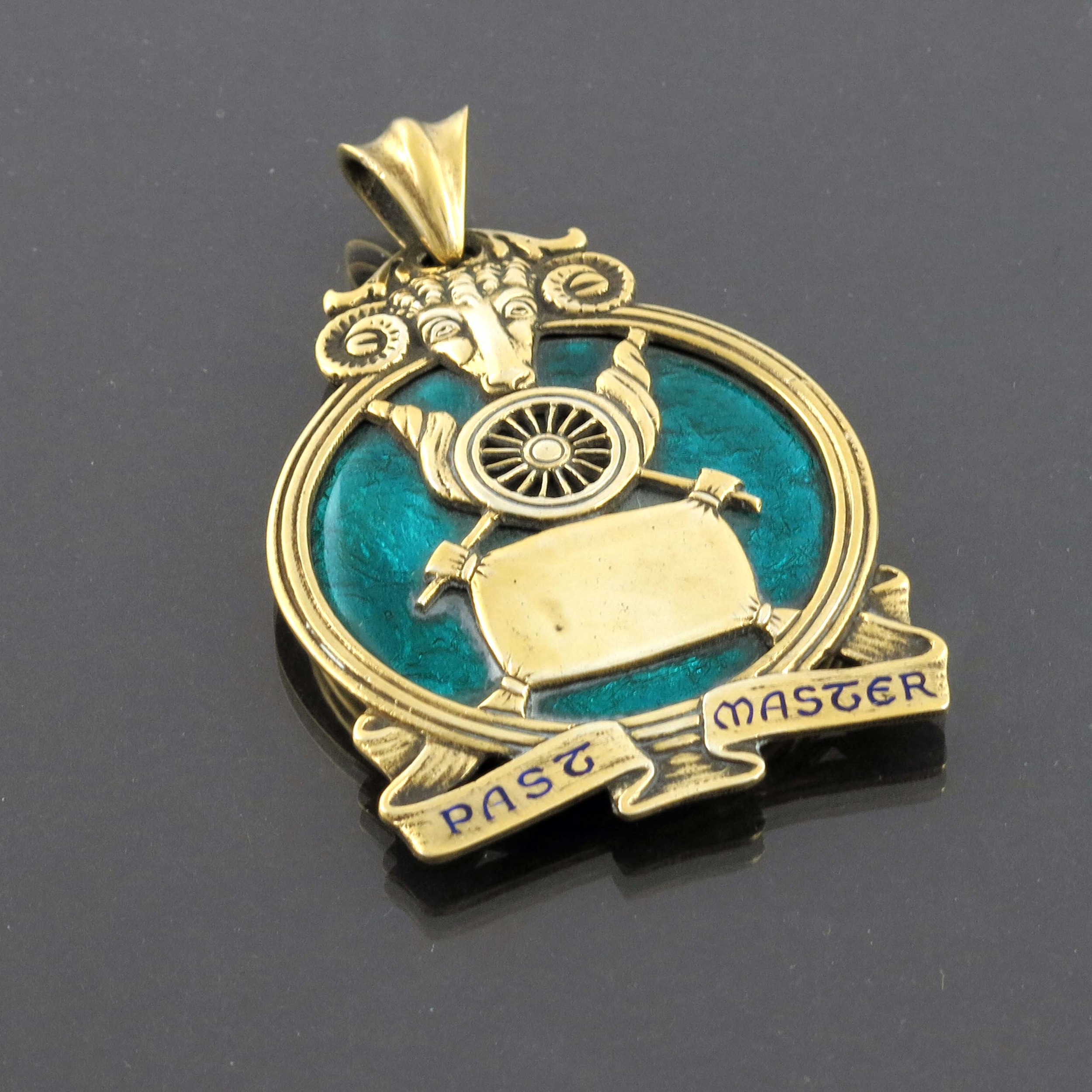 Omar Ramsden, an Arts and Crafts silver gilt and enamelled medal, London 1938, for a Past Master of the Worshipful Company of Woolmen, the foil backed roundel applied with the cast crest and emblem of the livery company, below a rams mask, the banner below inscribed in blue enamel, suspended on a loop, A M Morris 1901-3, 6cm long, 0.88ozt