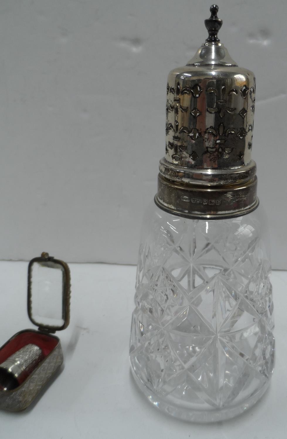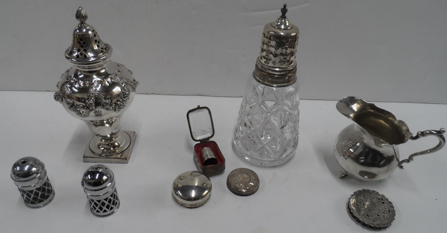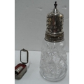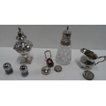 Silver topped and cut glass sugar shakers together with other silver and white metal items (lot)