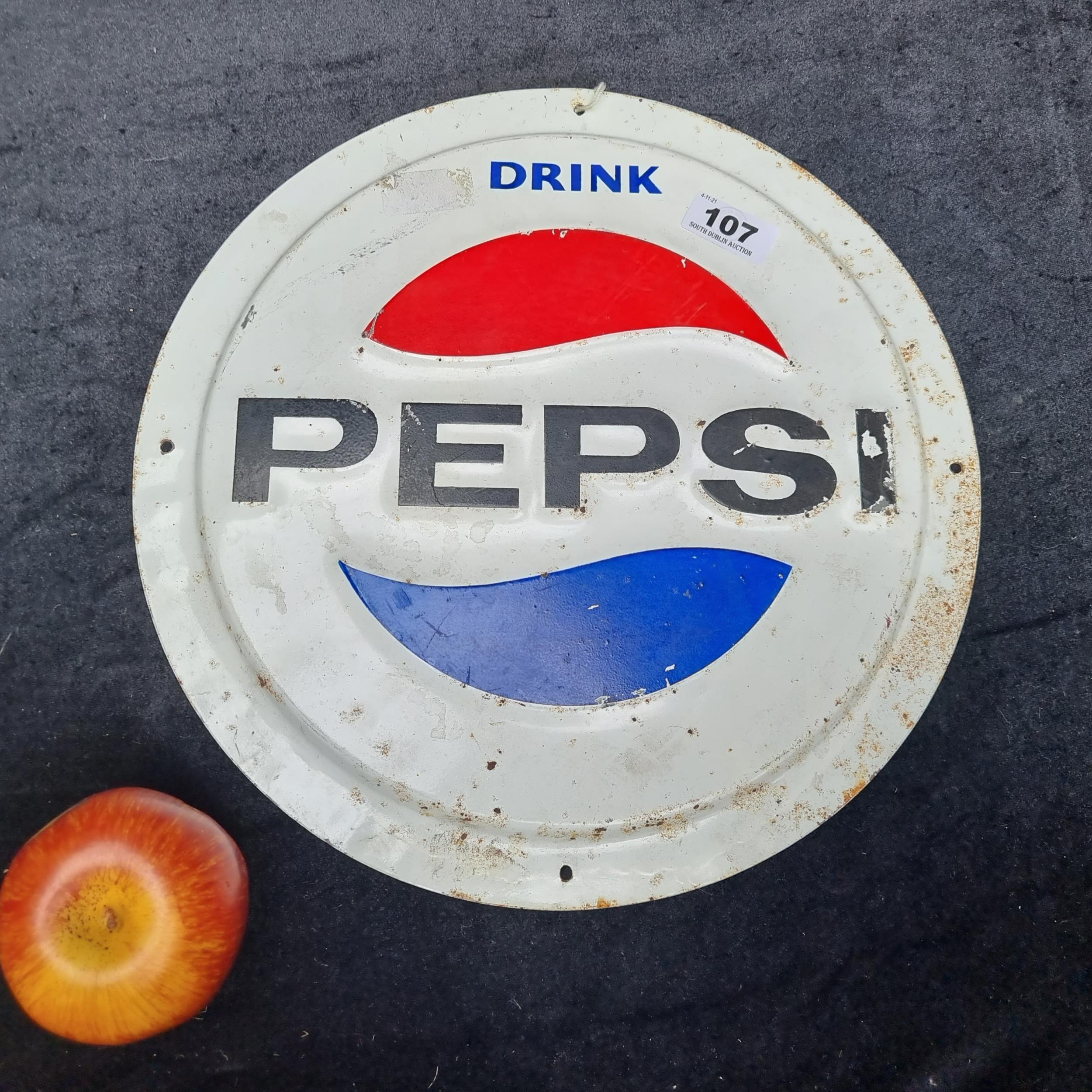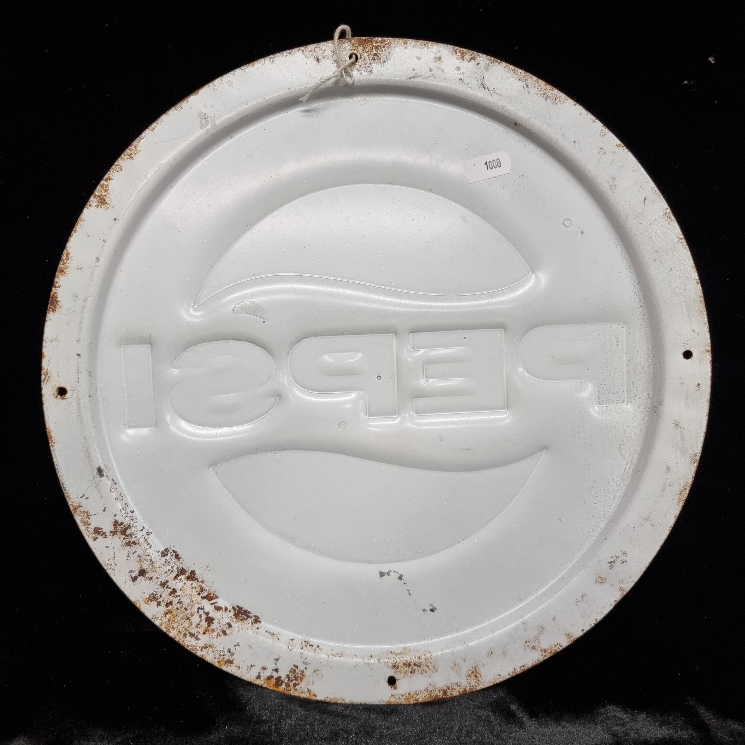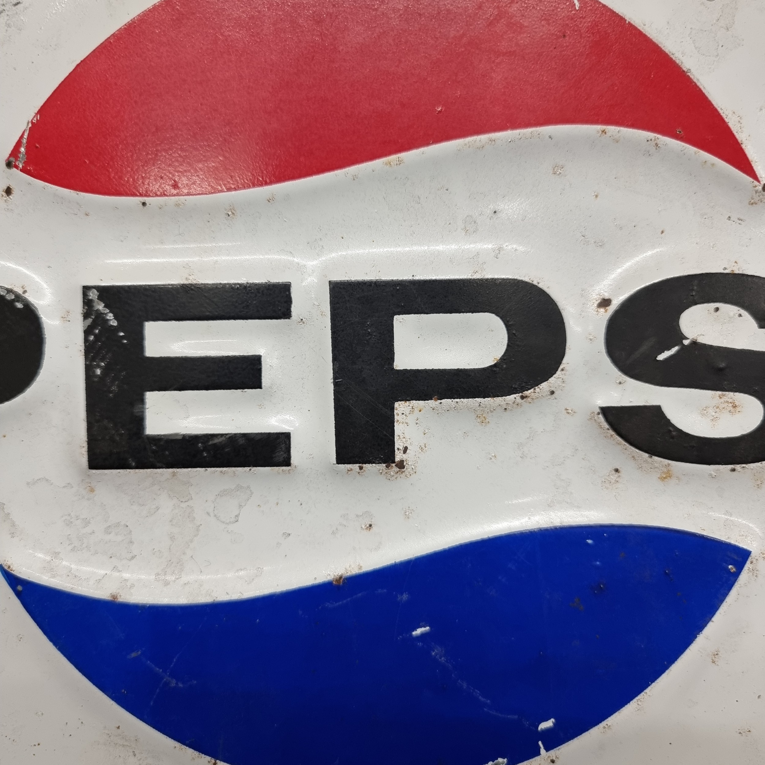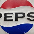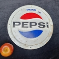 A large circular vintage metal Pepsi advertising sign with good patina. Perfect for wall mounting. Pepsi advertisement items are rare.
