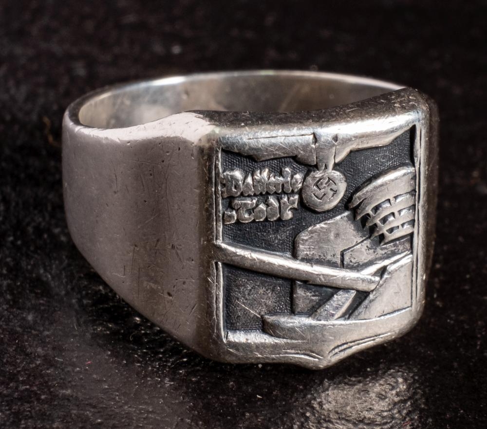 A WWII German battery Defence ring: of silver colour with emblem and text over a gun emplacement.