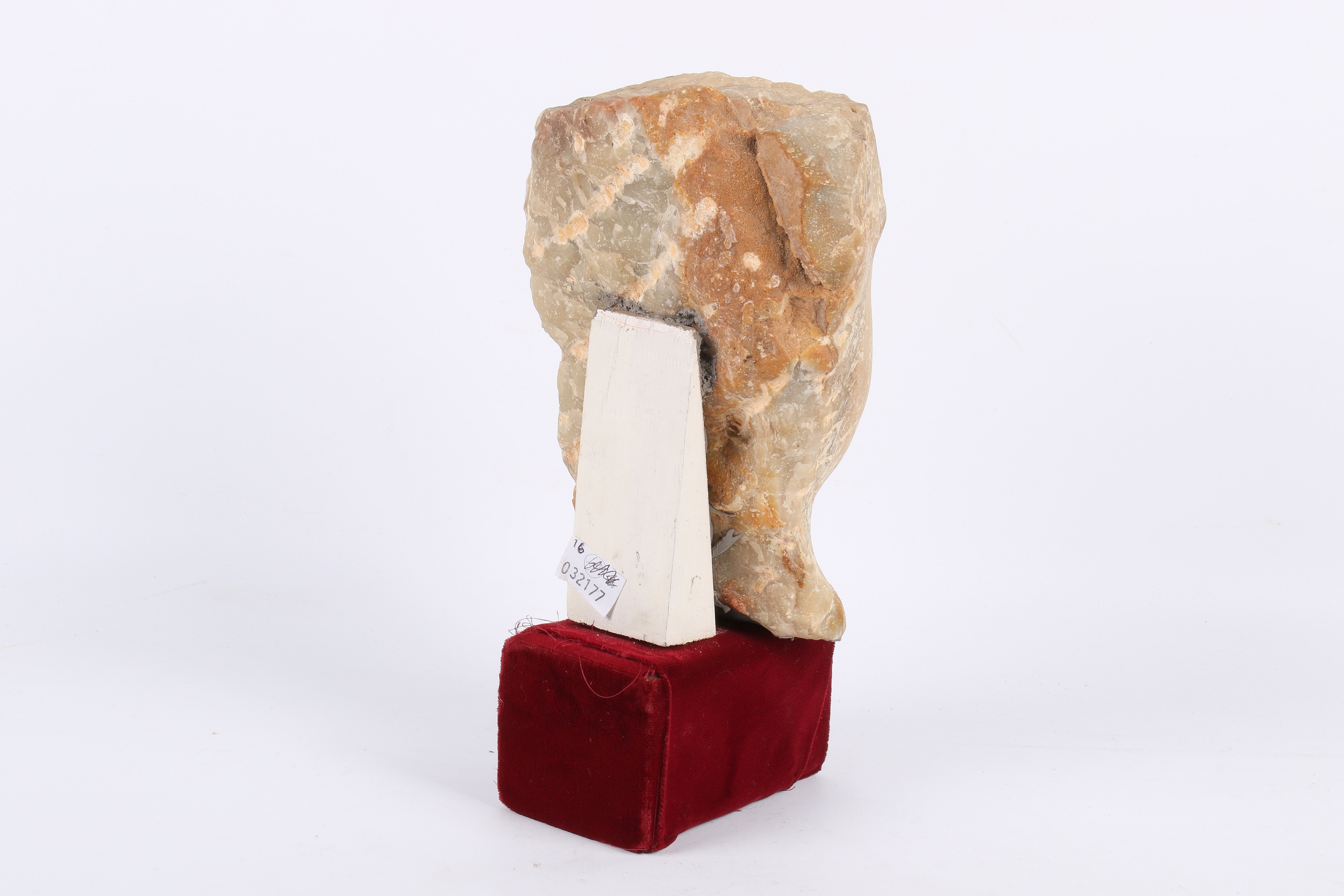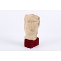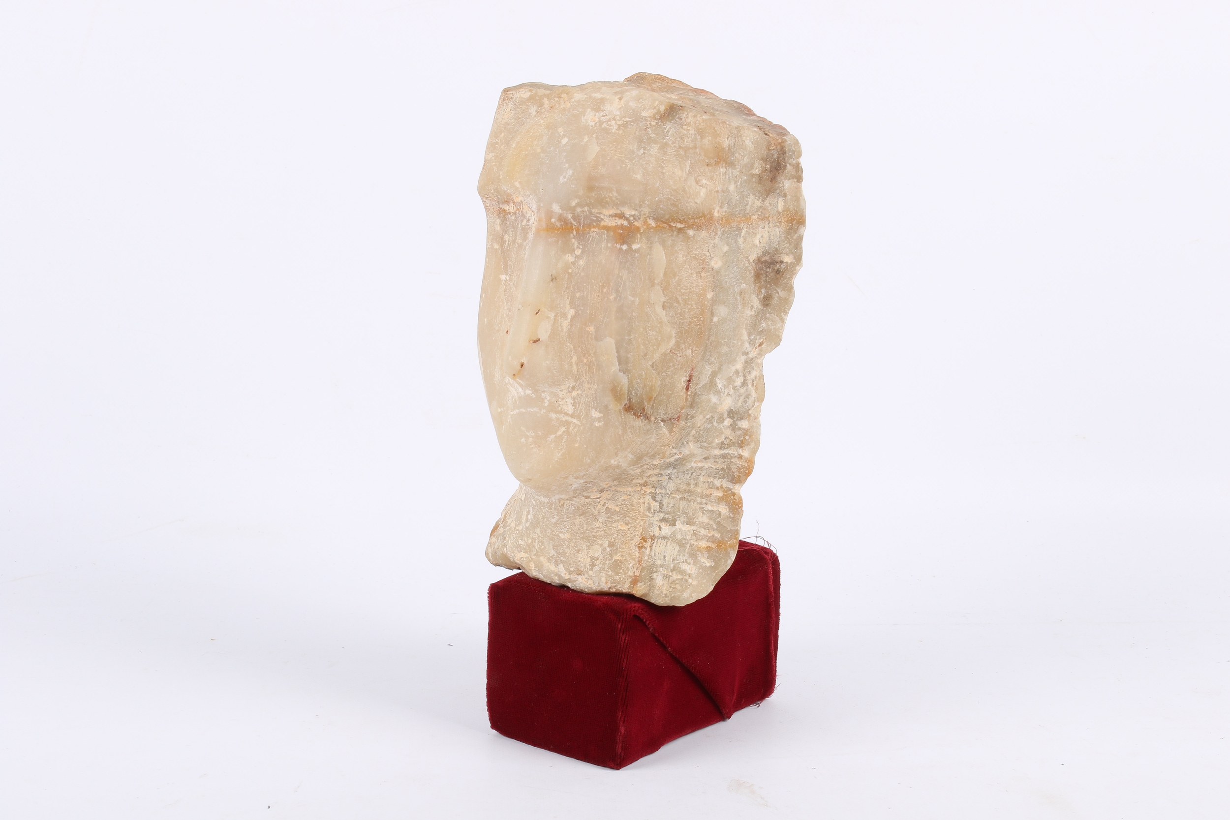 A carved alabaster head. With simplified features, flattened top of head and flat back, South Arabian style of 3rd-1st century B.C., circa H19cm x D7.5cm, fixed to a wood support. Cf. similar examples in the British Museum, https://www.britishmuseum.org/collection/object/W_1985-0223-31 Acquired in the late 1960s/early 1970s in Yemen.
