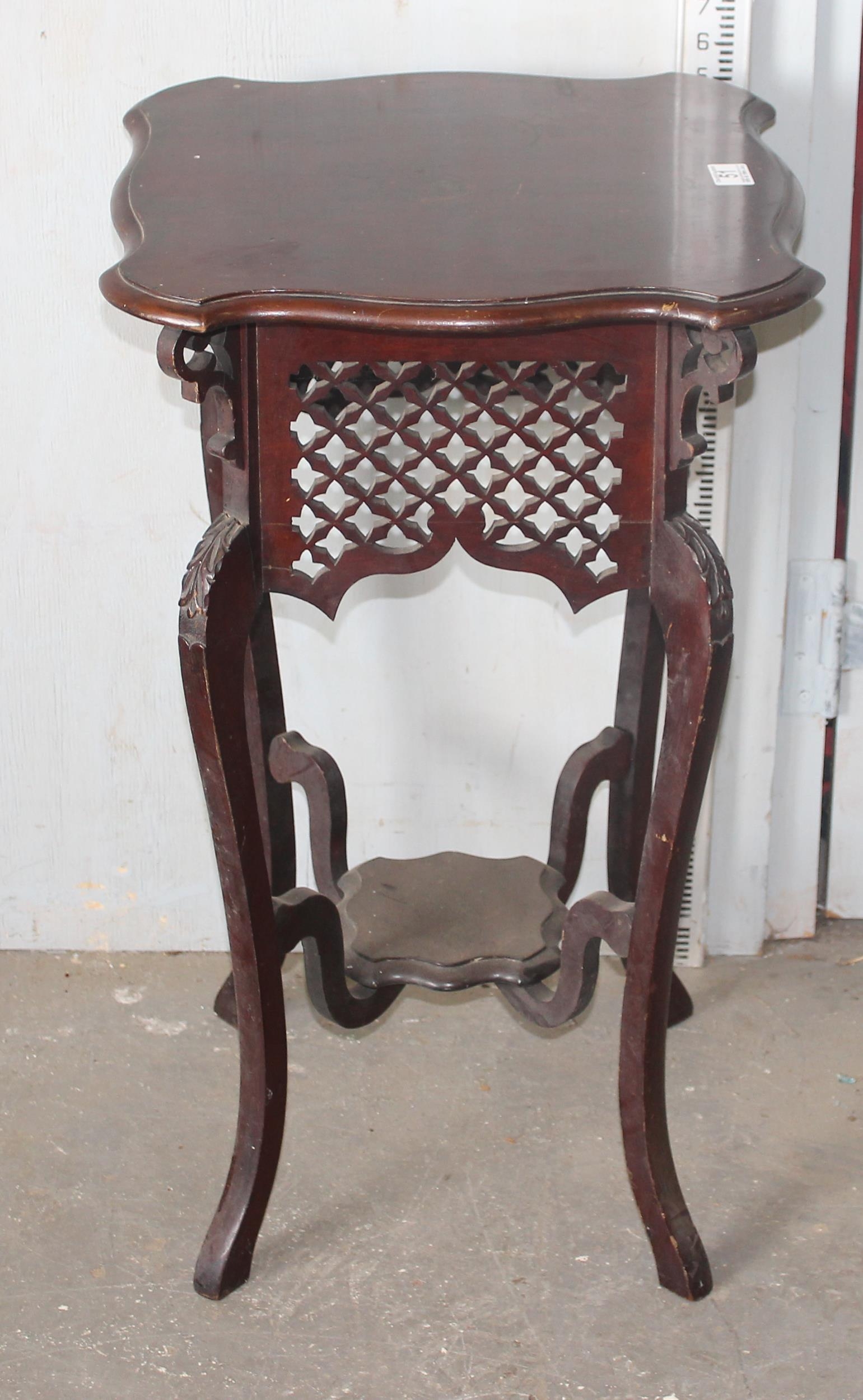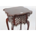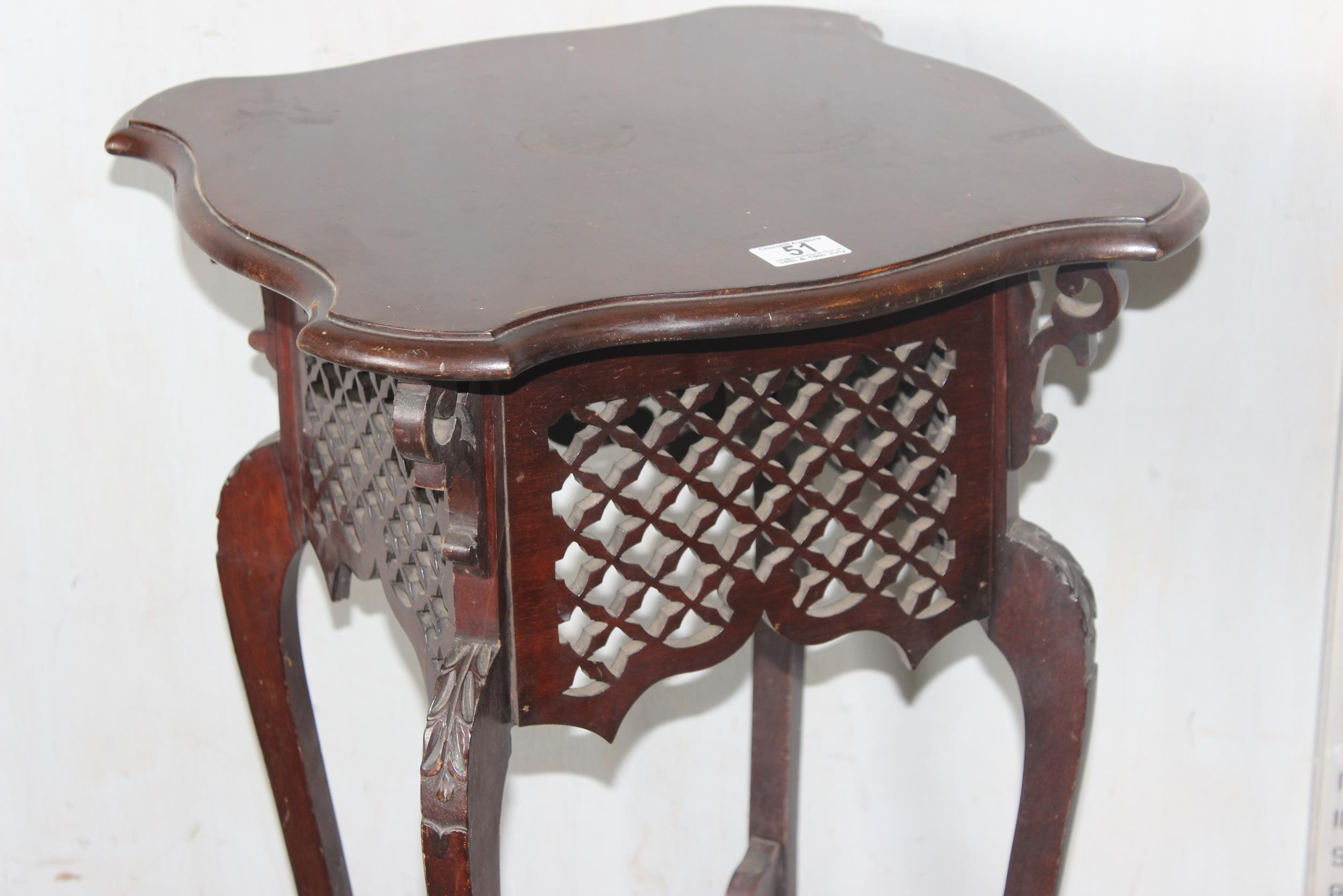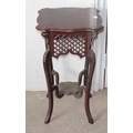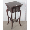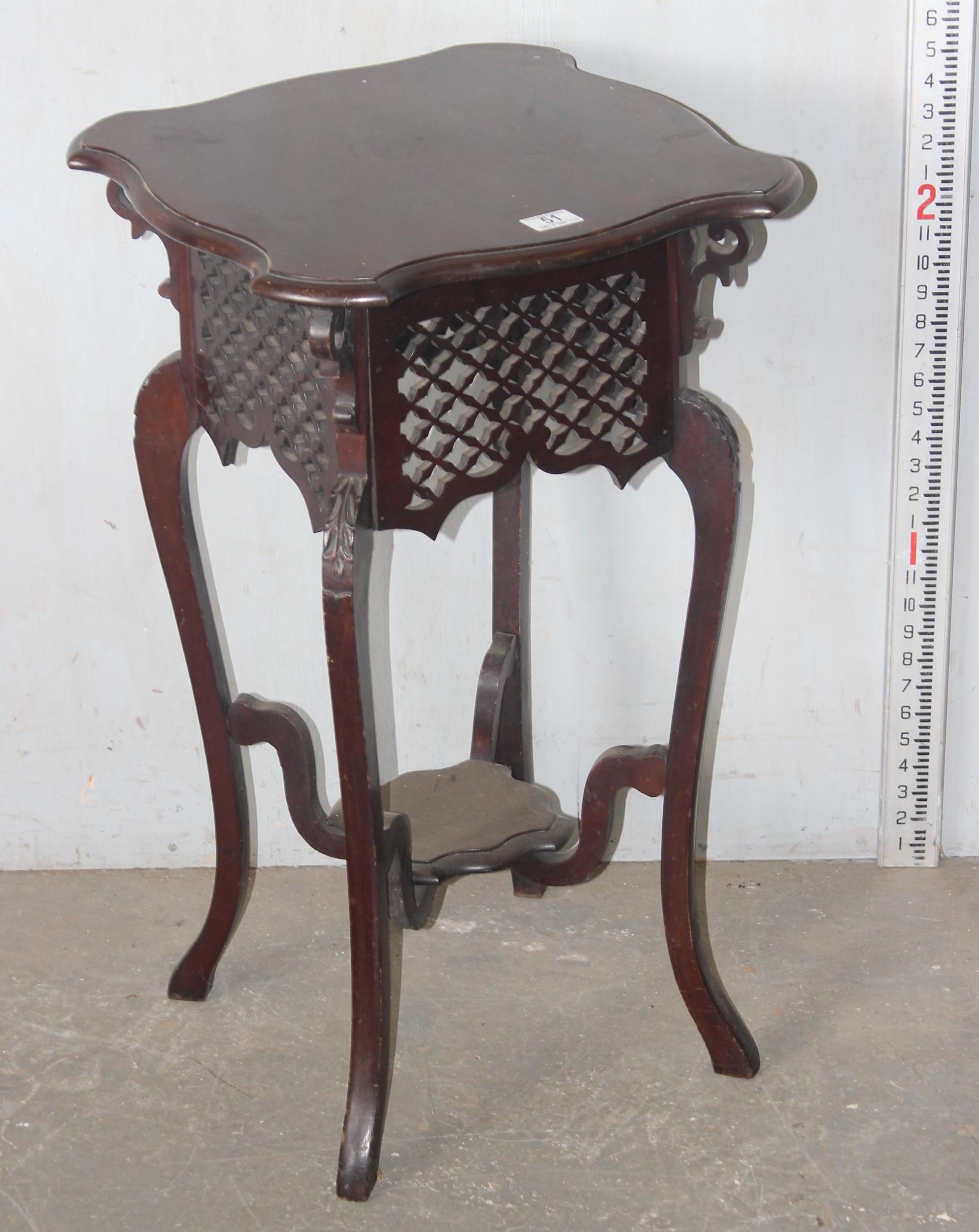 An early 20th century mahogany Art Nouveau side table or Jardiniere stand with interesting pierced fretwork panels, partial paper label to base