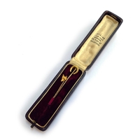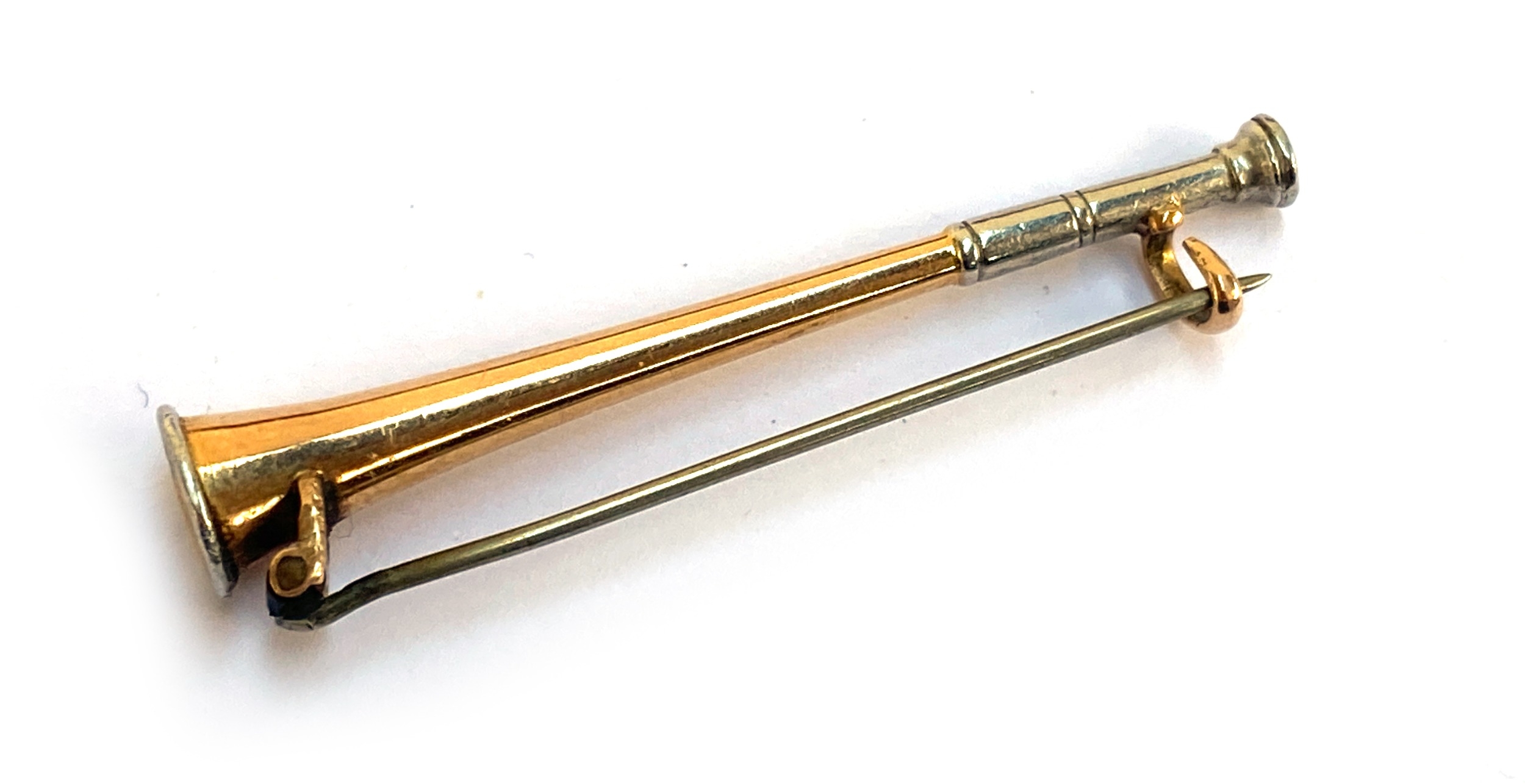 An early 20th century gold brooch in the form of a hunting horn, unmarked but tests as 9ct, 4.6cmL, gross weight 3.5g