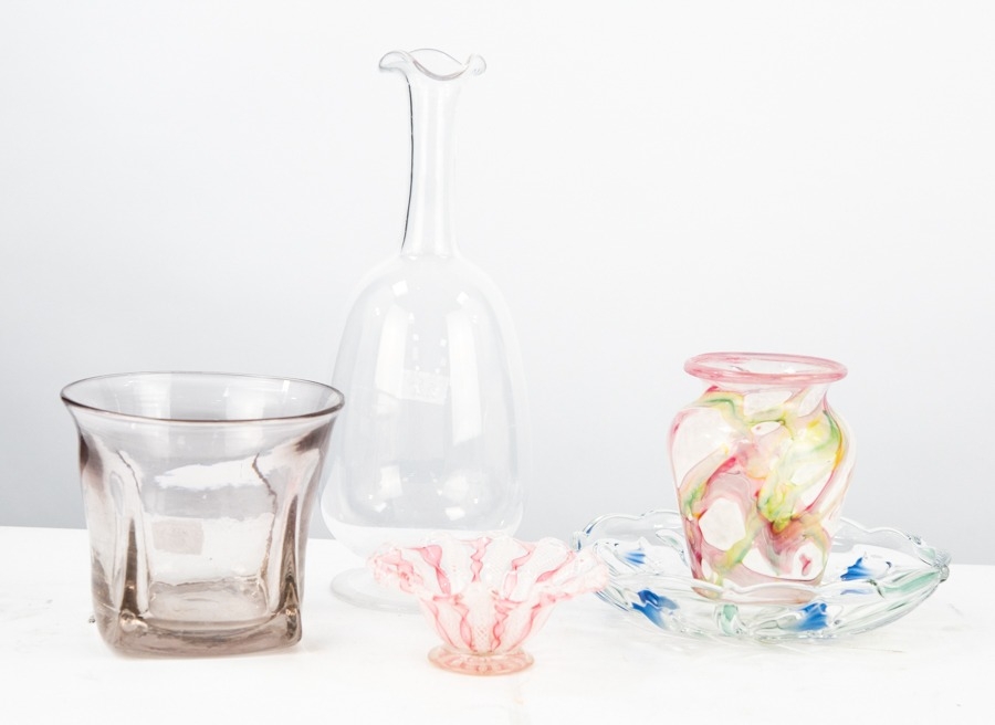 FIVE PIECES OF TWENTIETH CENTURY GLASS, comprising: WHITEFRIARS CLEAR GLASS CARAFE, LANGSWORTHY, CORNWALL MULTI COLOURED VASE, with sticky label, HEAVY CLEAR GLASS FLARED VASE, indistinctly etched to the base, MURANO PINK AND WHITE RIBBON CANDY DISH, and a KISSLINGER FLORAL MOULDED SHALLOW DISH, 10 ½” (26.7cm) and smaller, (5)