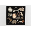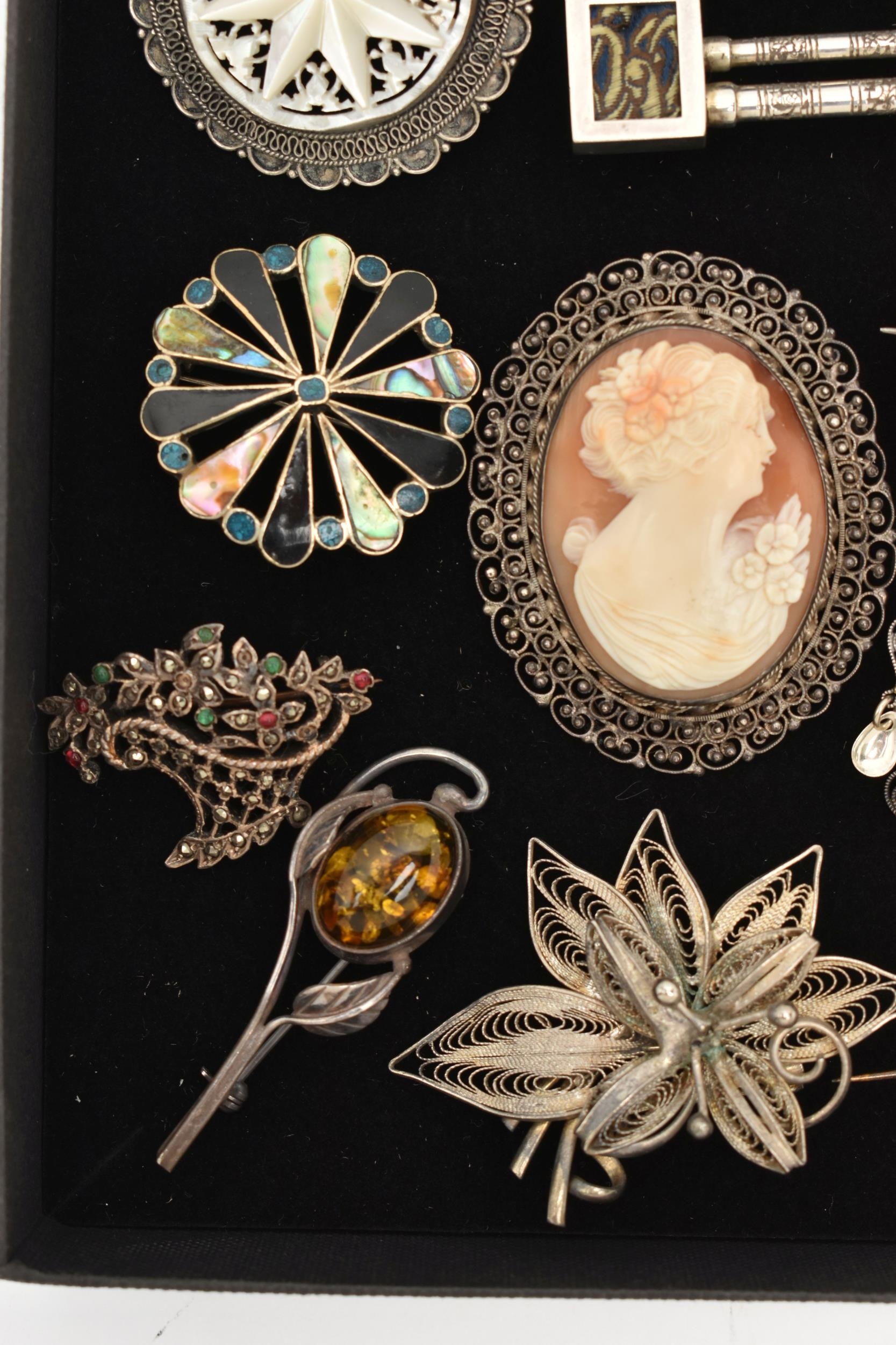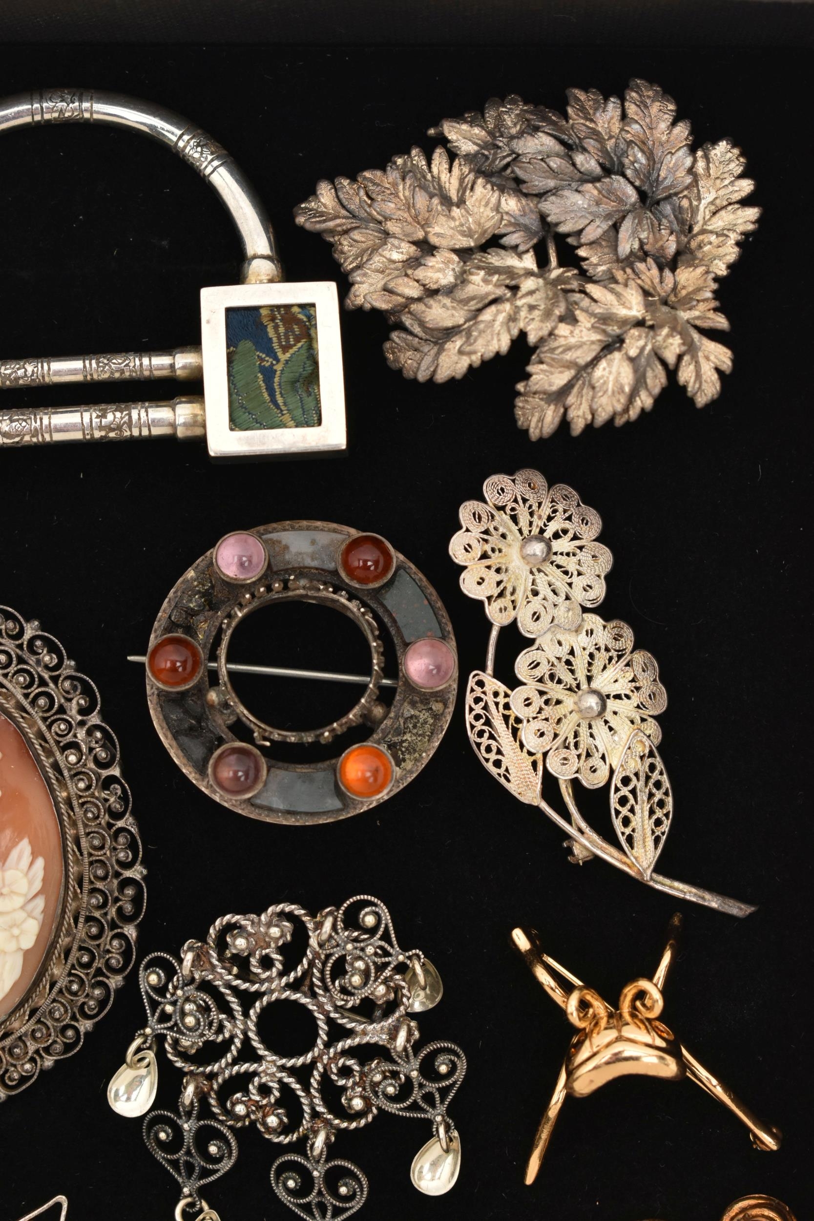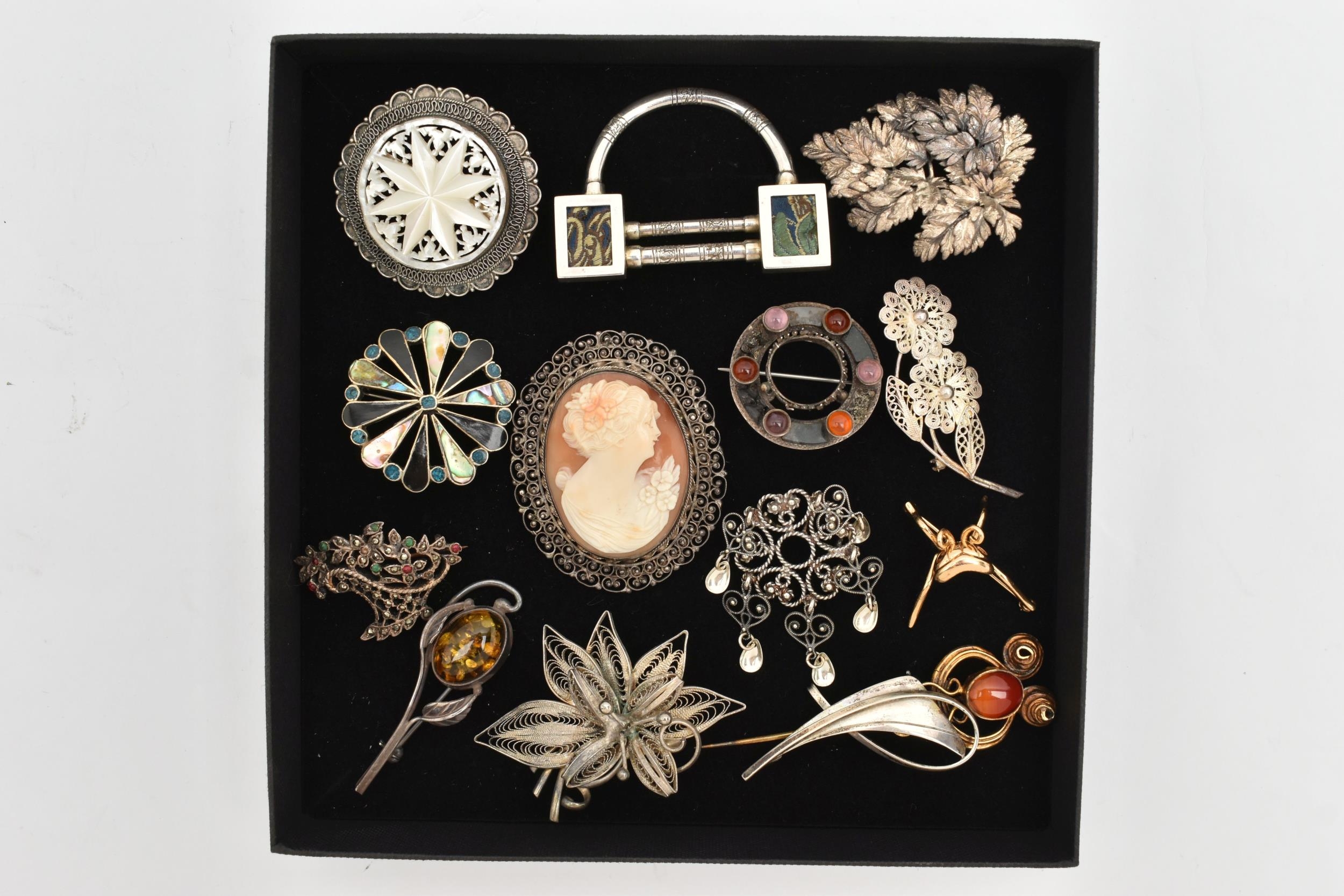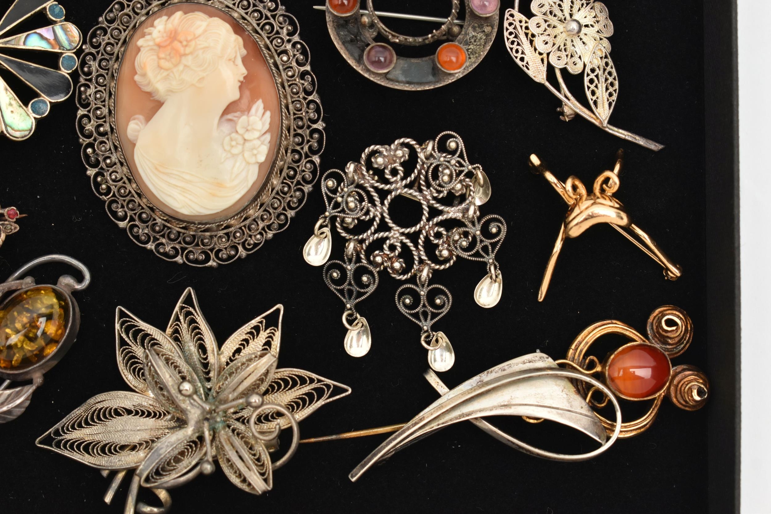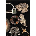 AN ASSORTMENT OF SILVER AND WHITE METAL BROOCHES, to include an AF Scottish brooch, hallmarked Birmingham, an AF insect brooch hallmarked London, approximate gross weight 11.7 grams, three white metal brooches and one gold plated stick pin, all stamped 925, approximate gross weight 27.8 grams, two white metal brooches, both stamped 800, together with six additional white metal brooches, unmarked, approximate gross weight 58.5 grams, (condition report: silver brooches damaged, require attention, overall condition good)