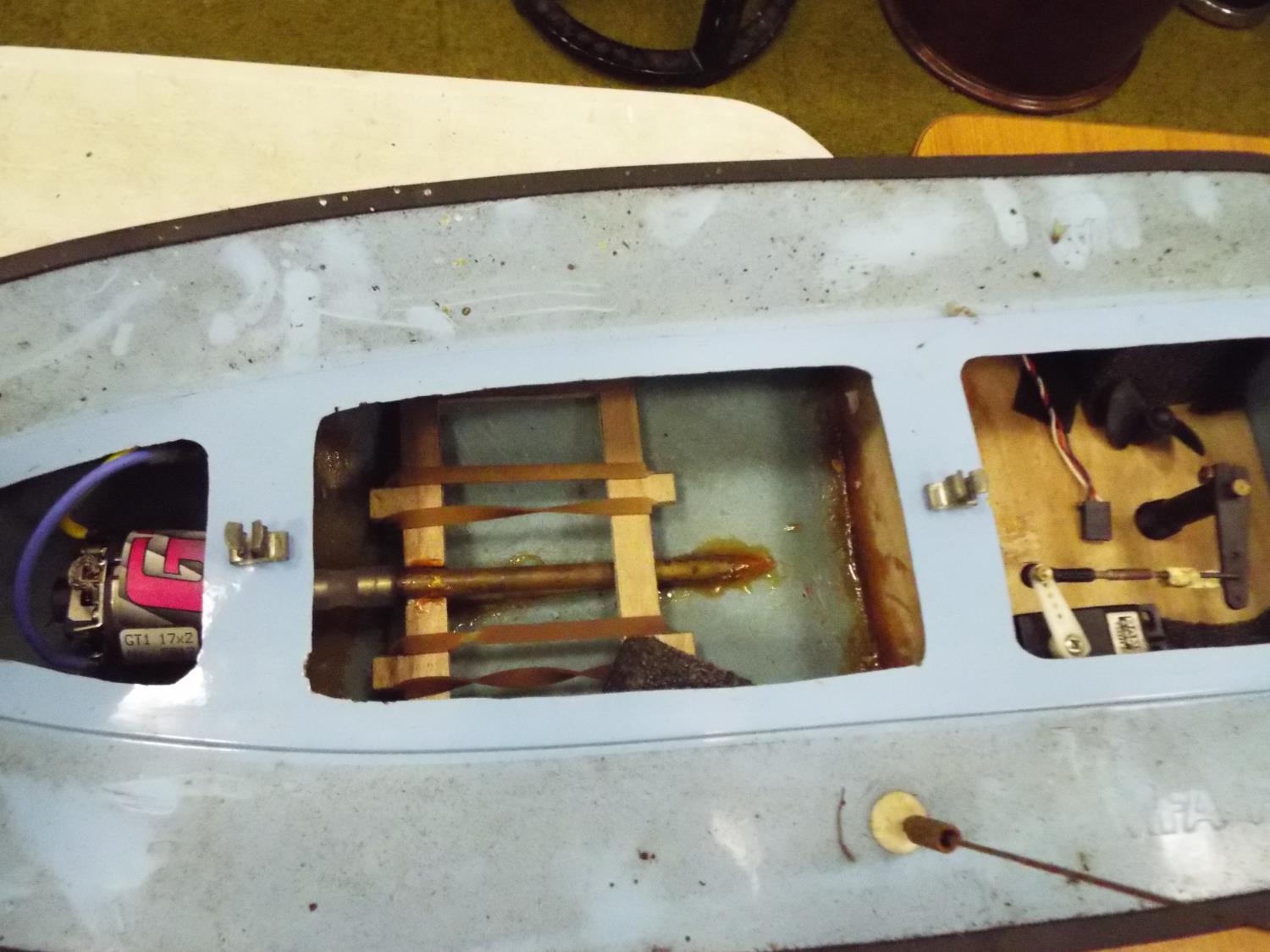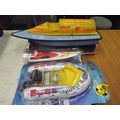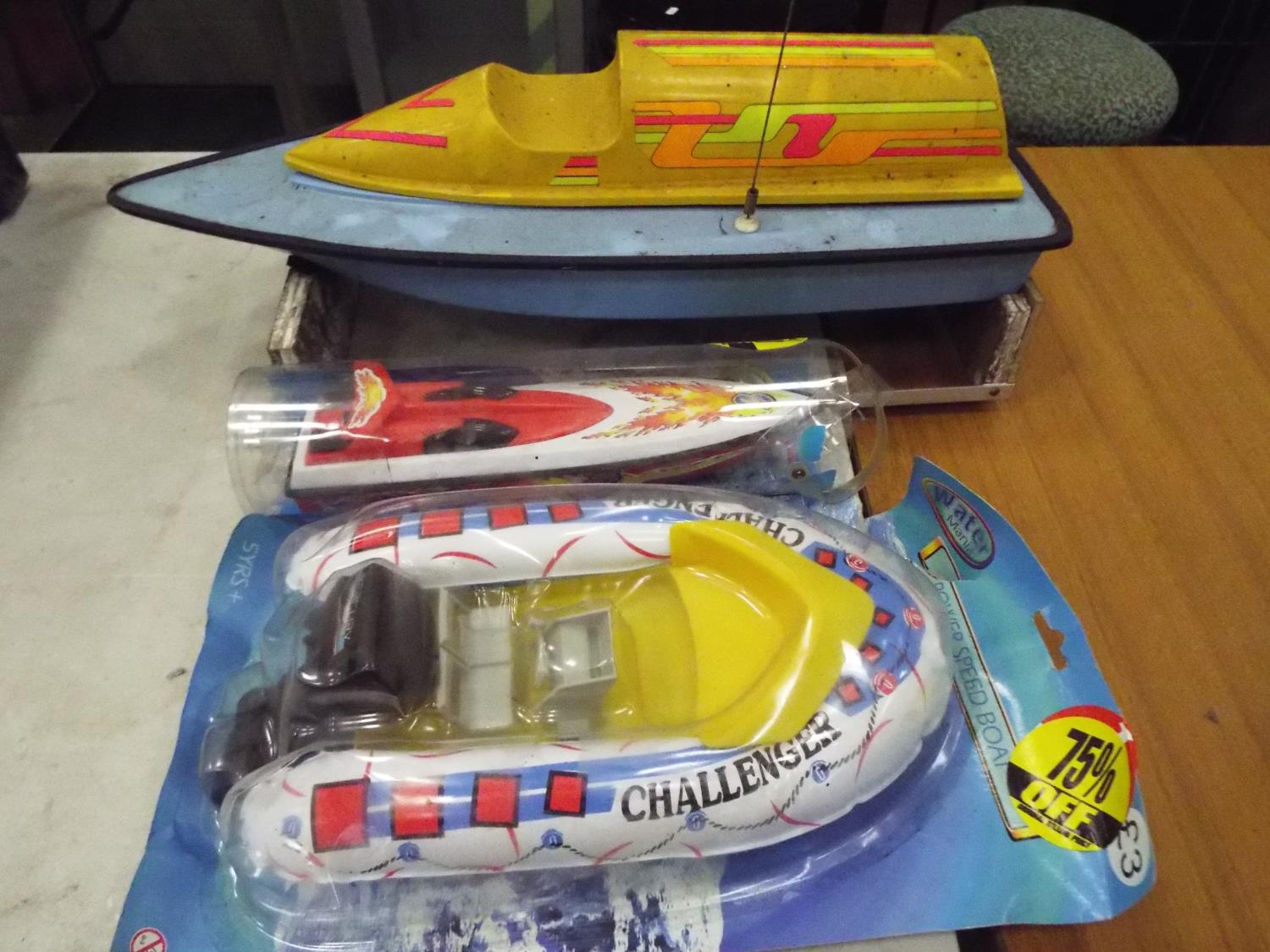 Radio controlled powerboat with electric motor with wooden cradle 22 inches long, plus two other toy powerboats in blister packs