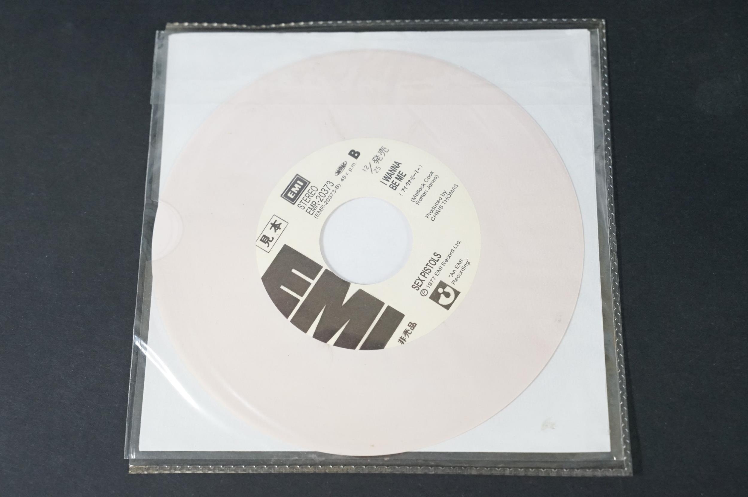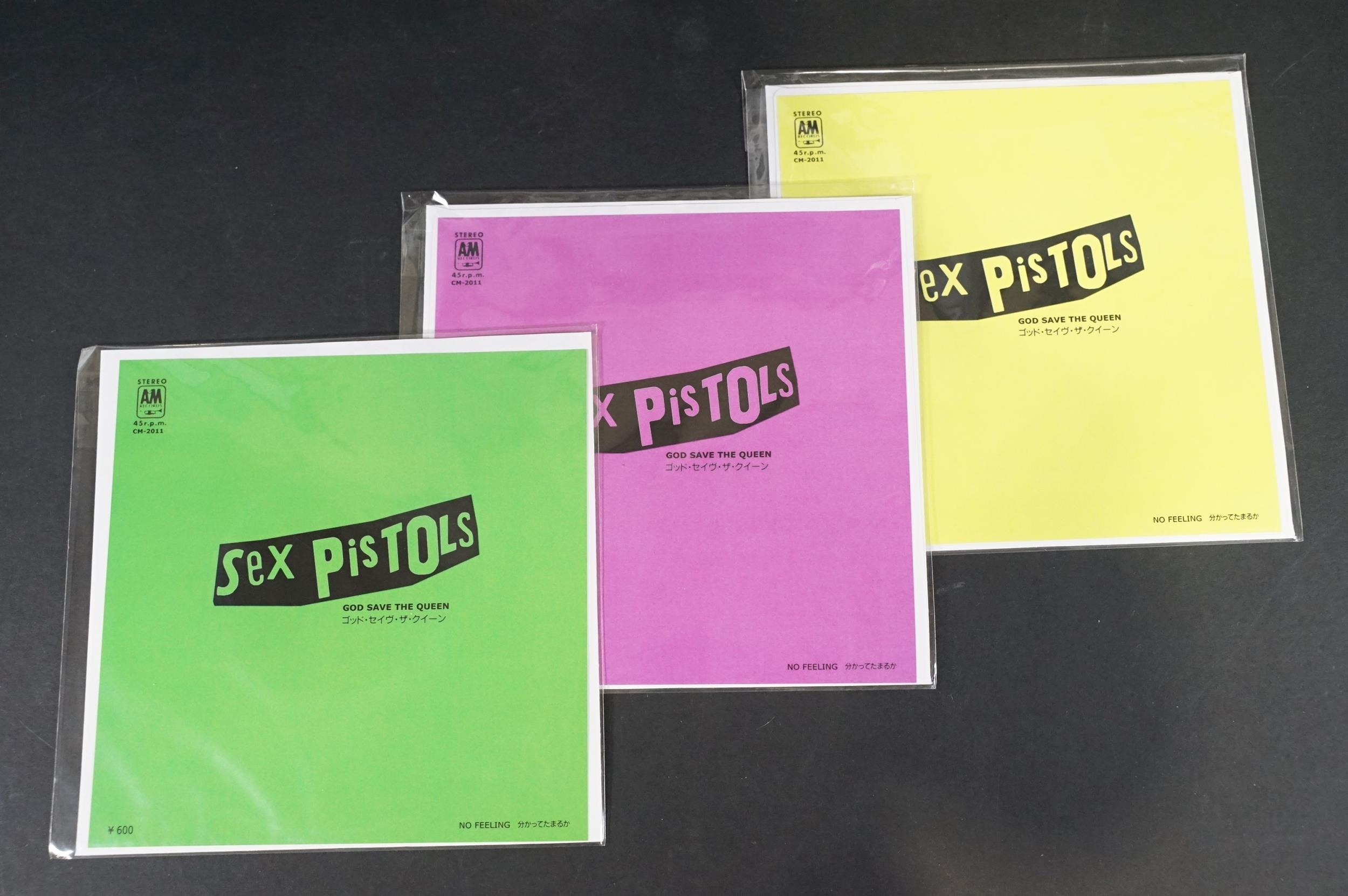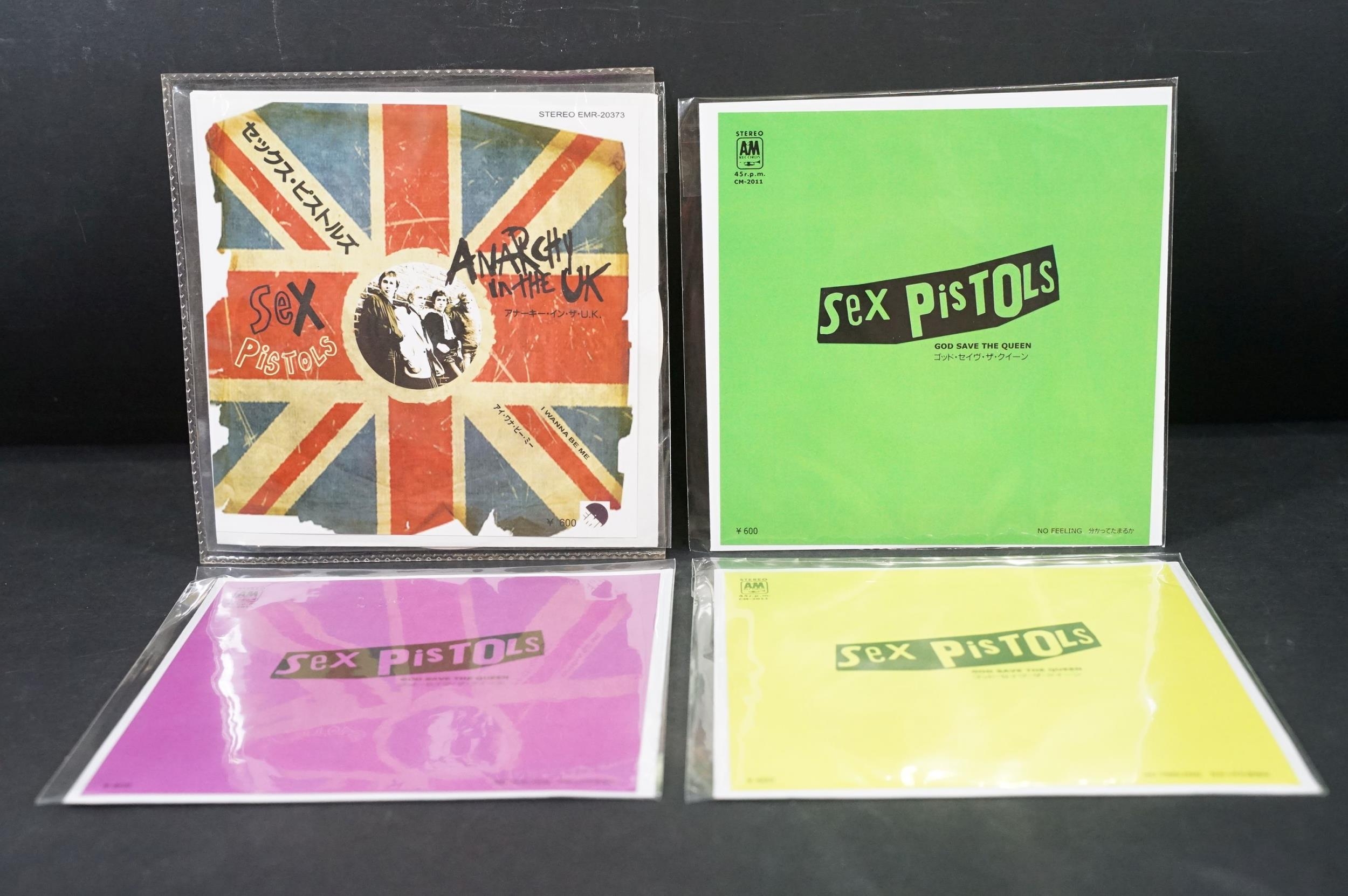 Vinyl - Punk - Sex Pistols, 4 Japanese late 1980’s coloured vinyl private pressing 7” singles, to include: God Save The Queen (green vinyl, yellow vinyl and purple marbled vinyl), I Wanna Be Me (light pink / cream vinyl), all come with insert picture sleeves and are EX+