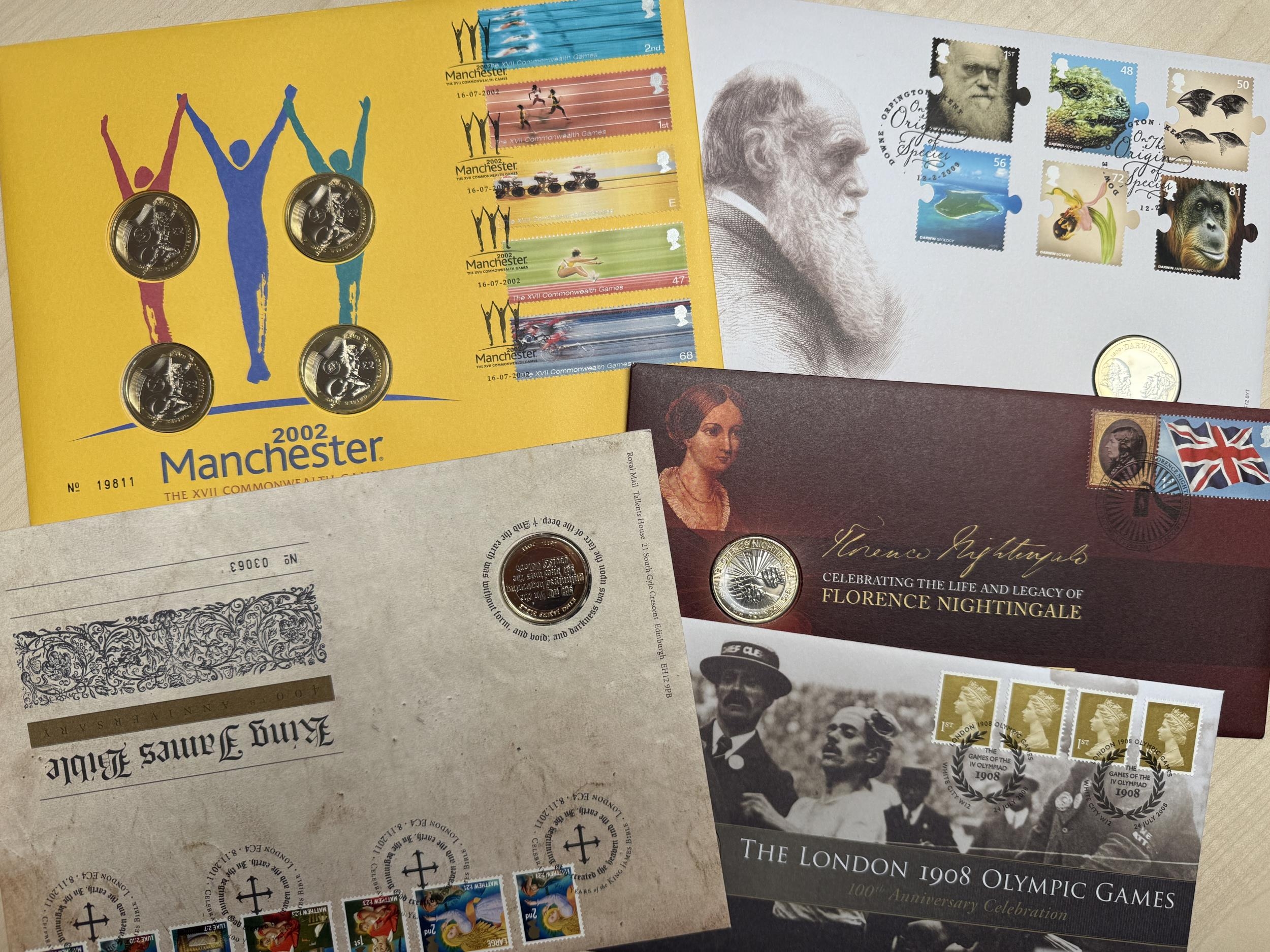 A collection of x92 UK RM PNC coin covers, noted 2002 Commonwealth Games £2 coin cover, 2010 Florence Nightingale £2 coin cover and 2011 King James Bible £2 coin cover, condition generally good