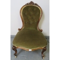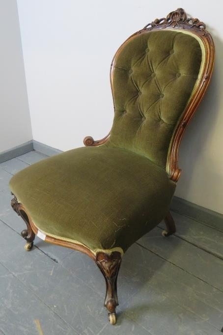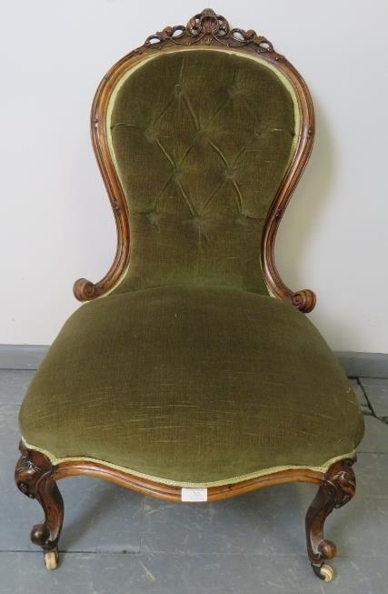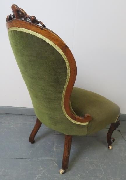 A Victorian walnut spoonback nursing chair, with ornately carved and pierced cornice, upholstered in green buttoned velvet, on scrolled supports with ceramic castors.