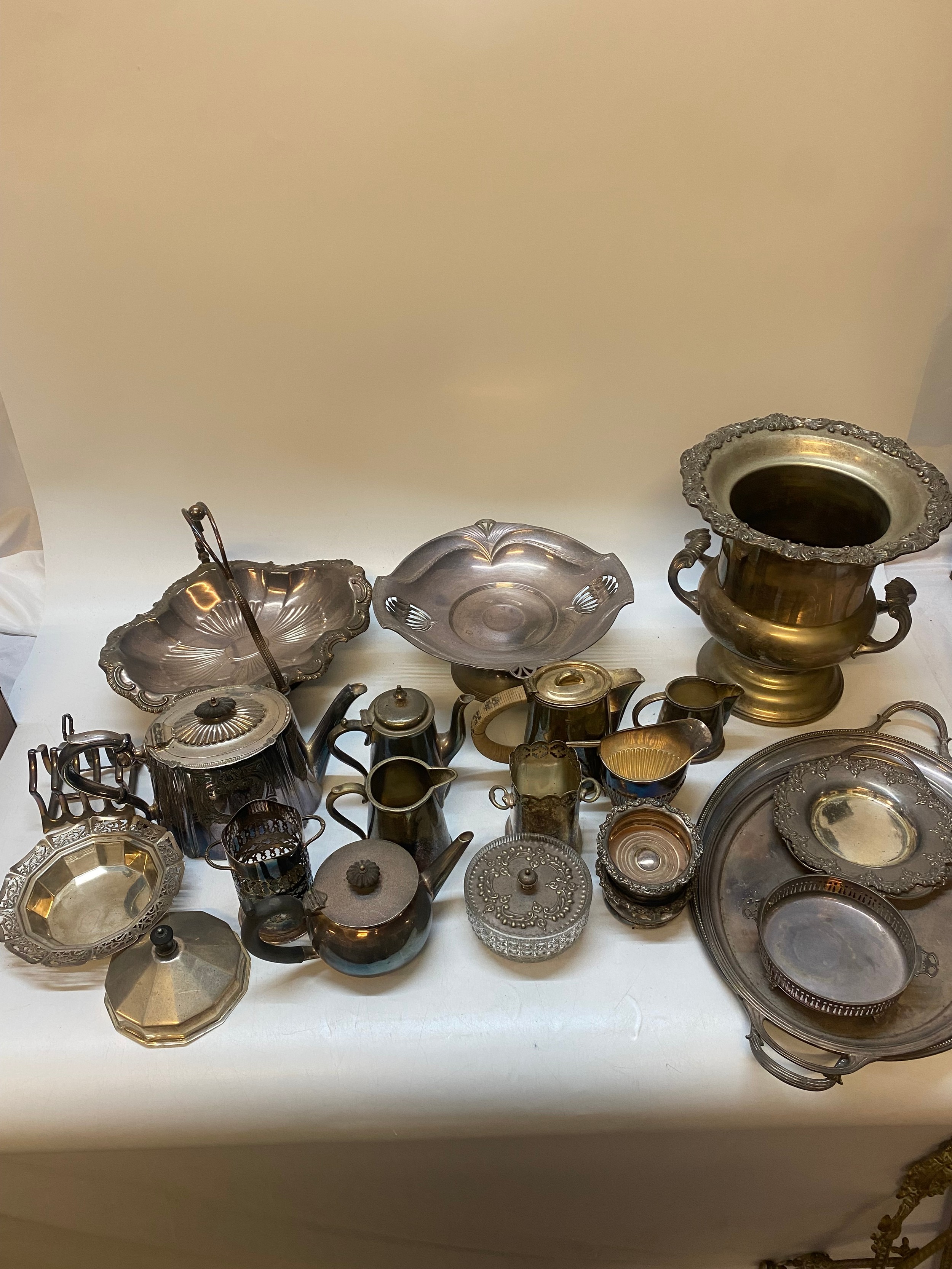 Plate comprising:- oval tray with engraved decoration, plain ditto, two bottle coasters, campagna shaped ice bucket, three piece tea service, toastrack, butter dish, fruit basket, pedestal fruit stand etc..