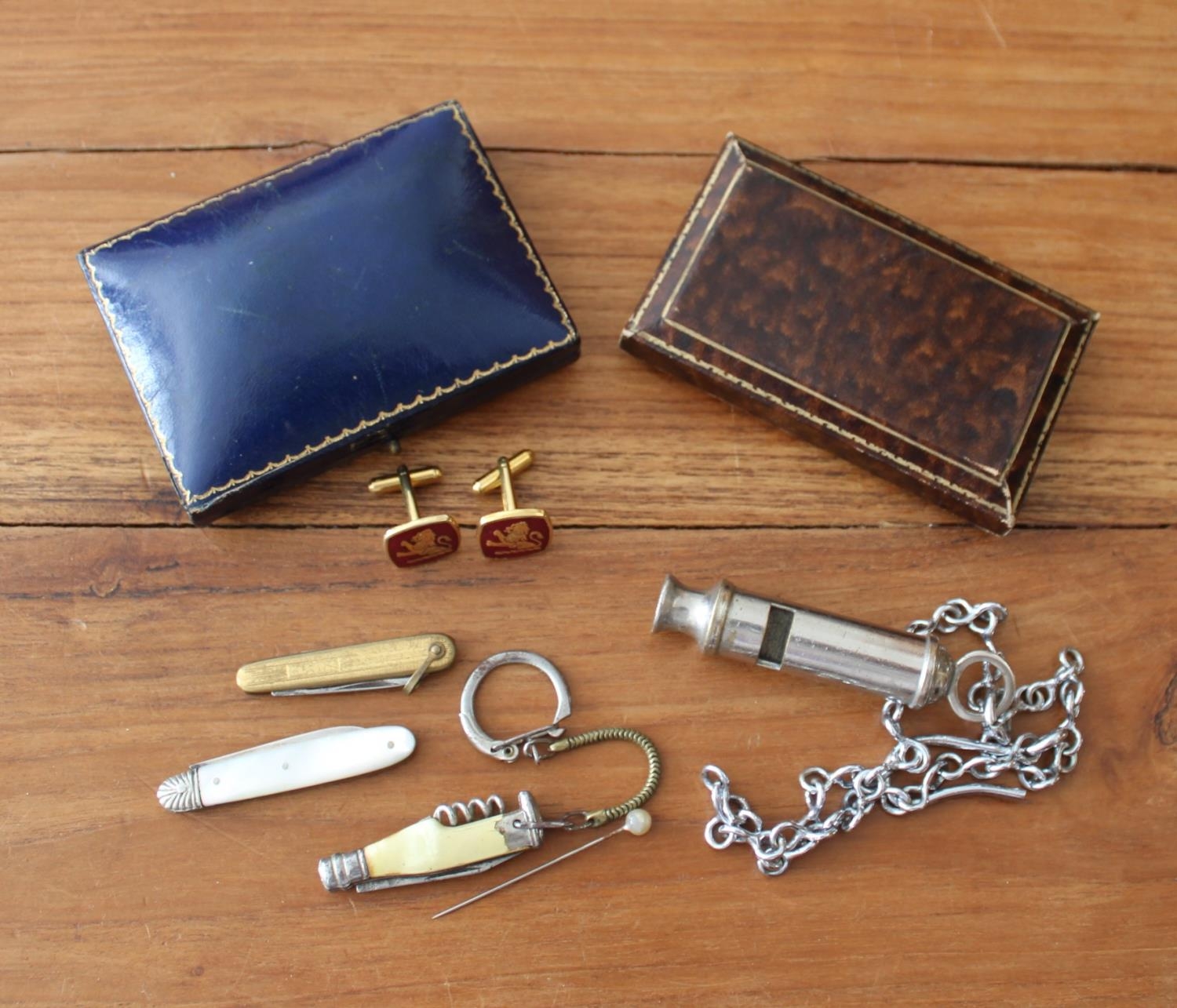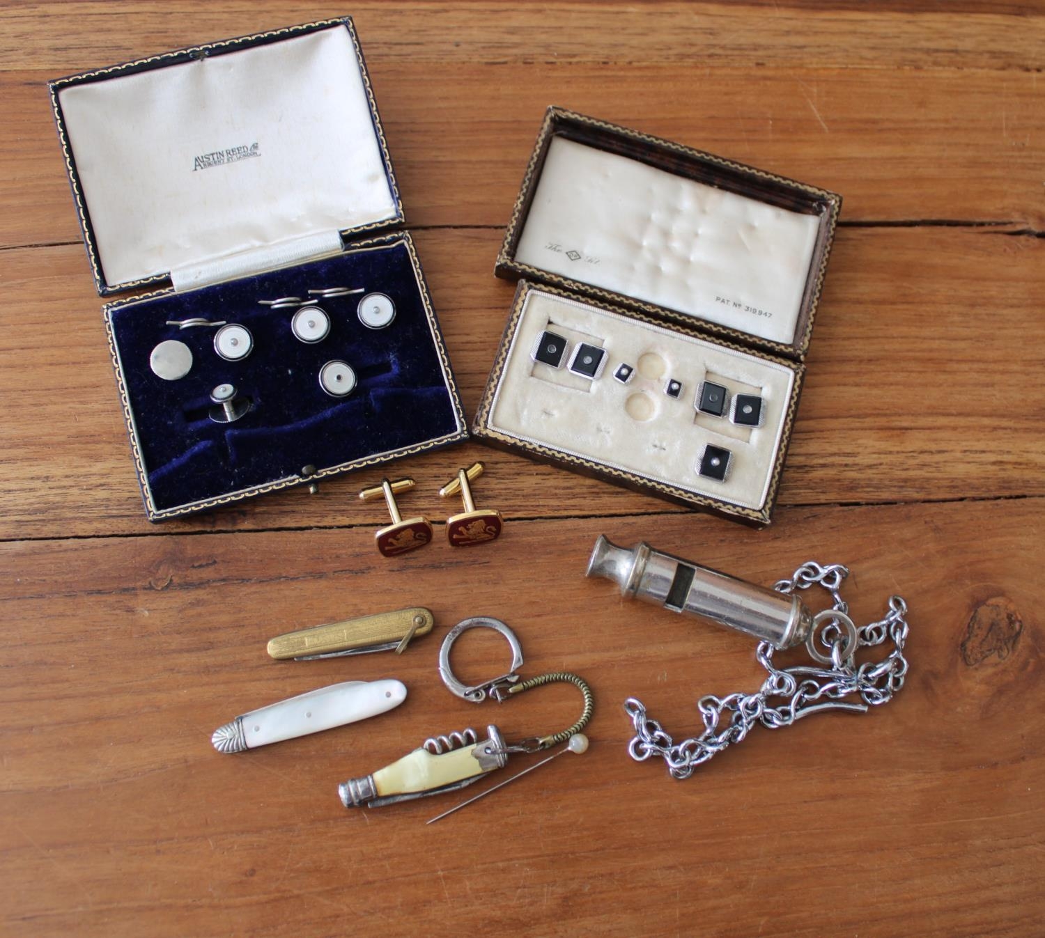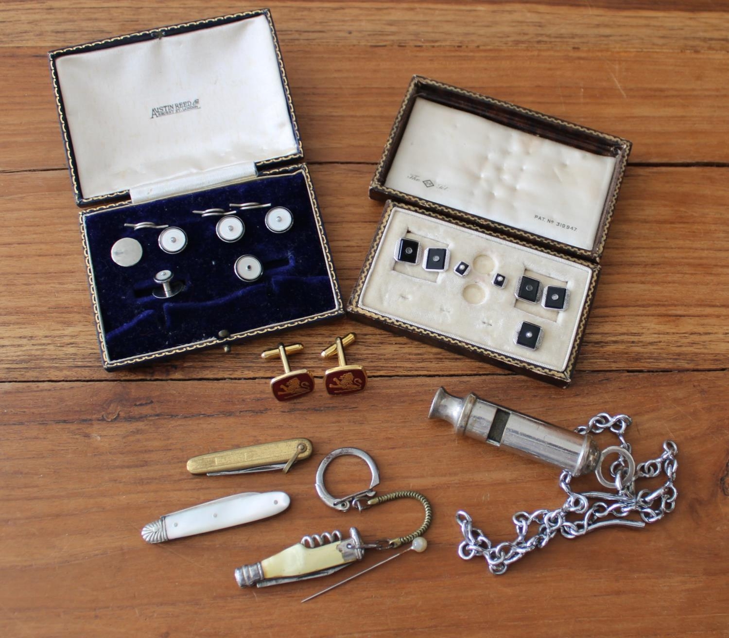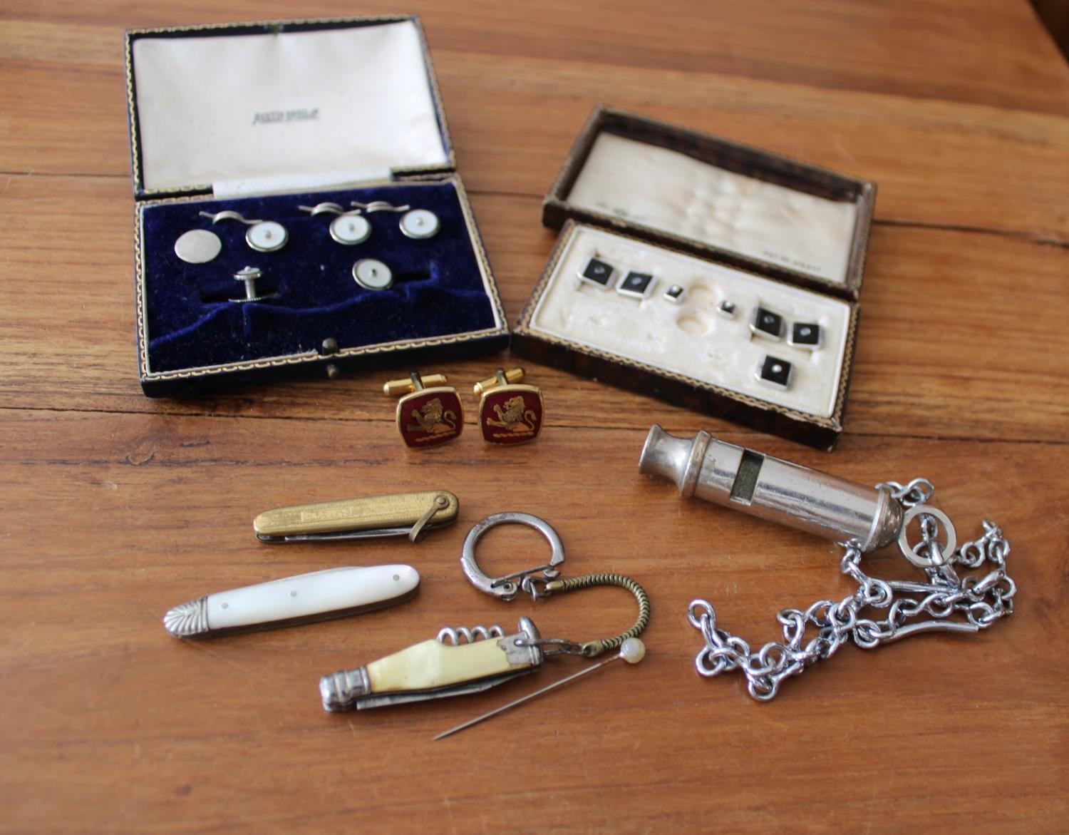 Job Lot of Mixed Collectable Items. Includes Cufflinks, Penknives, Whistle on chain etc