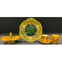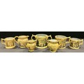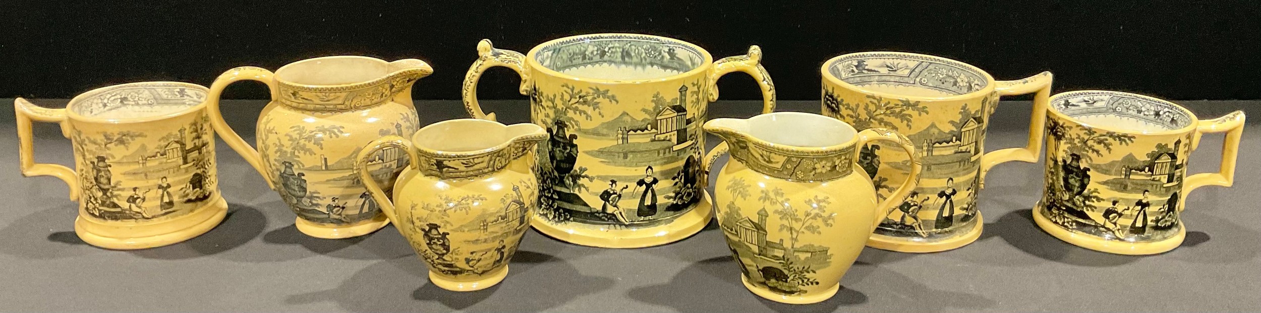 An early 19th century Joseph Thompson, Hartshorne Pottery monochrome two handled loving cup, transfer printed with a musician and female singer, "Jenny Lind", in a romanticised landscape, 14cm, printed Near Ashby De Le Zouch mark in black; a set of three similar graduated monochrome mugs, the largest 12.5cm with printed Thompson mark in black; a set of three graduated jugs, printed with seemingly the same transfers, the middle jug 11.5cm with Harrison & Shaw Church Gresley Derbyshire printed mark in black, c.1840/50 (7)