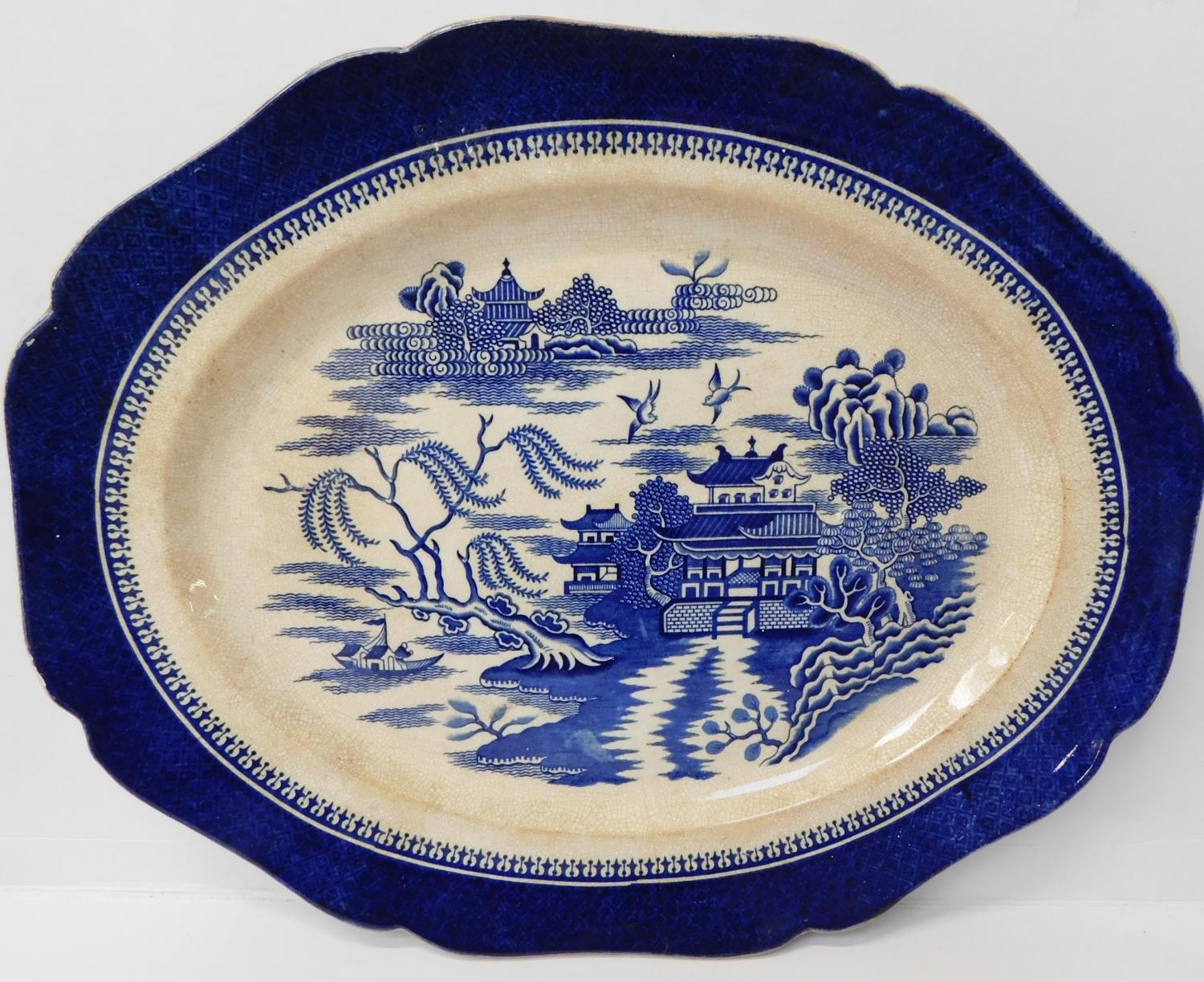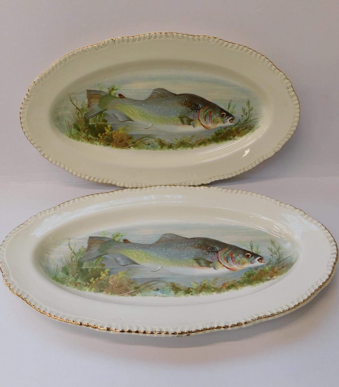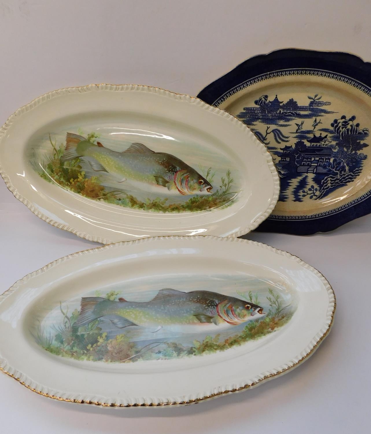 Blue and white meat platter - crack on reverse and Arthur Woods fish dishes x2 - no damage