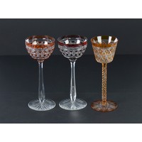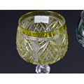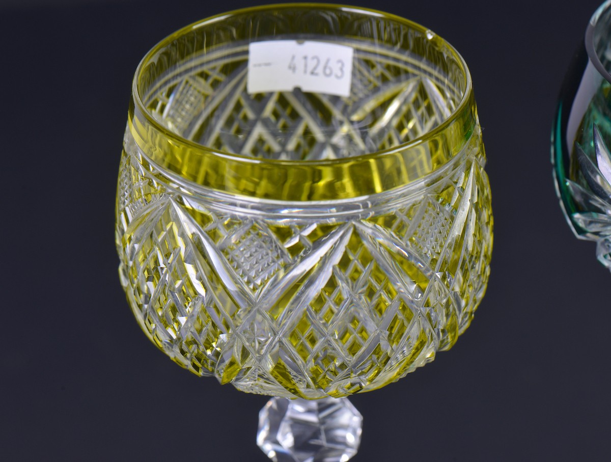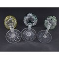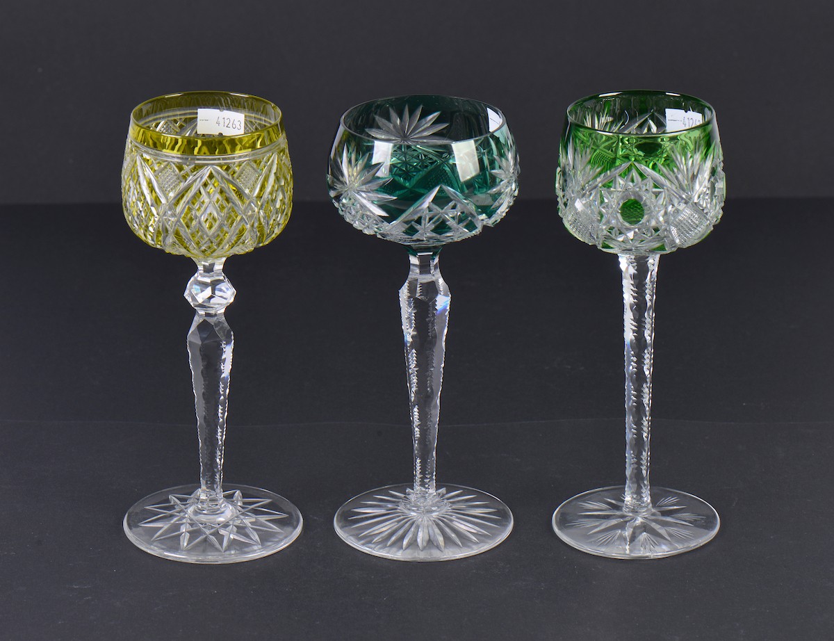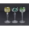 Two Green Cut & Faceted Hock Glasses on faceted stems & Star Cut Bases one other in Olive Green. (AF).