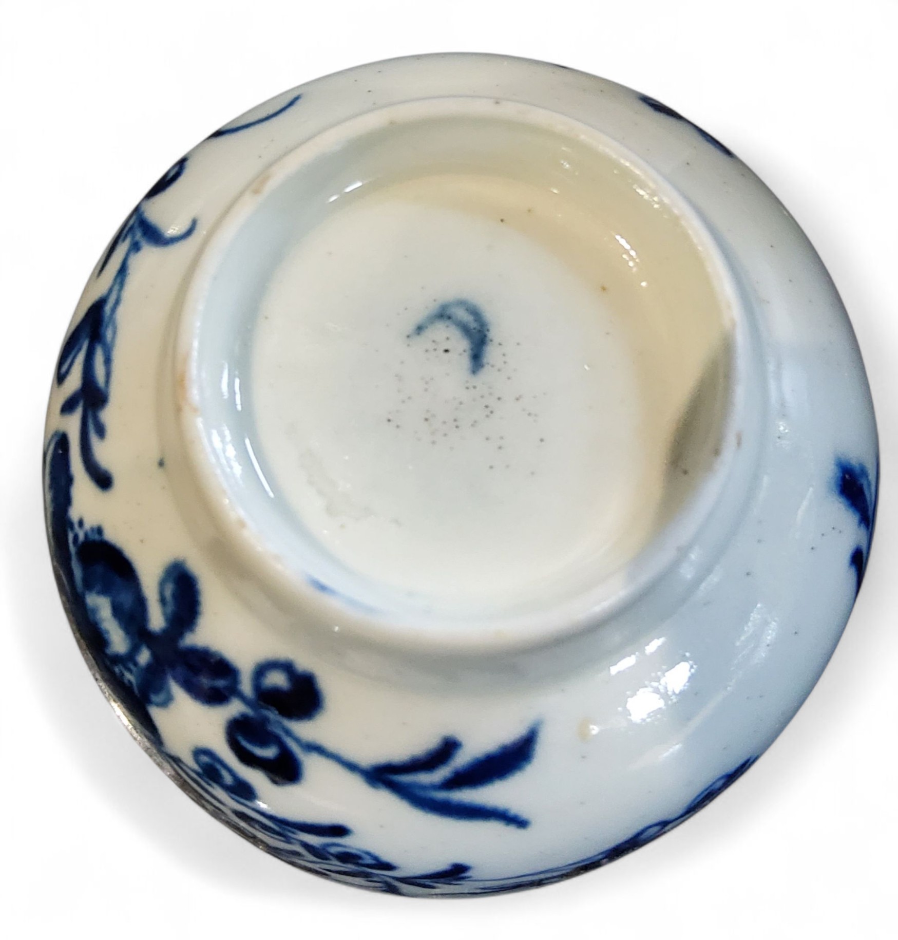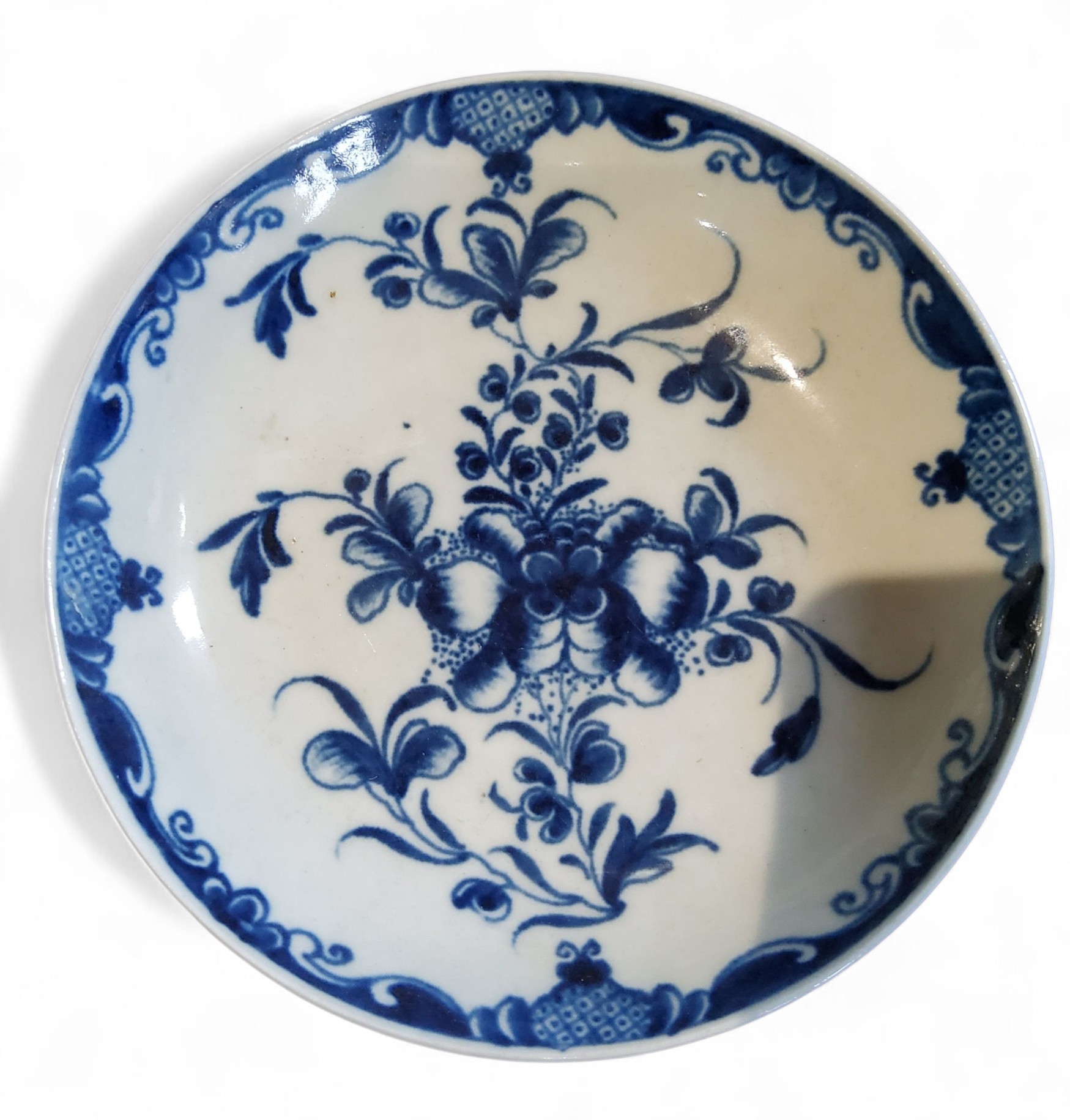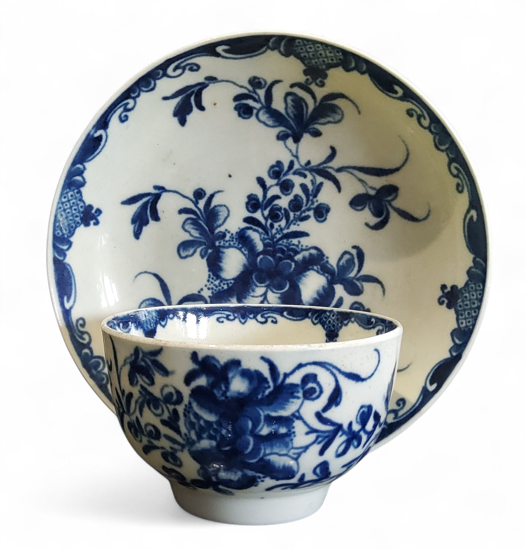A Worcester Mansfield pattern tea bowl and saucer, painted in underglaze blue with stylised flowers and foliage, scroll borders, crescent mark, c.1770