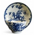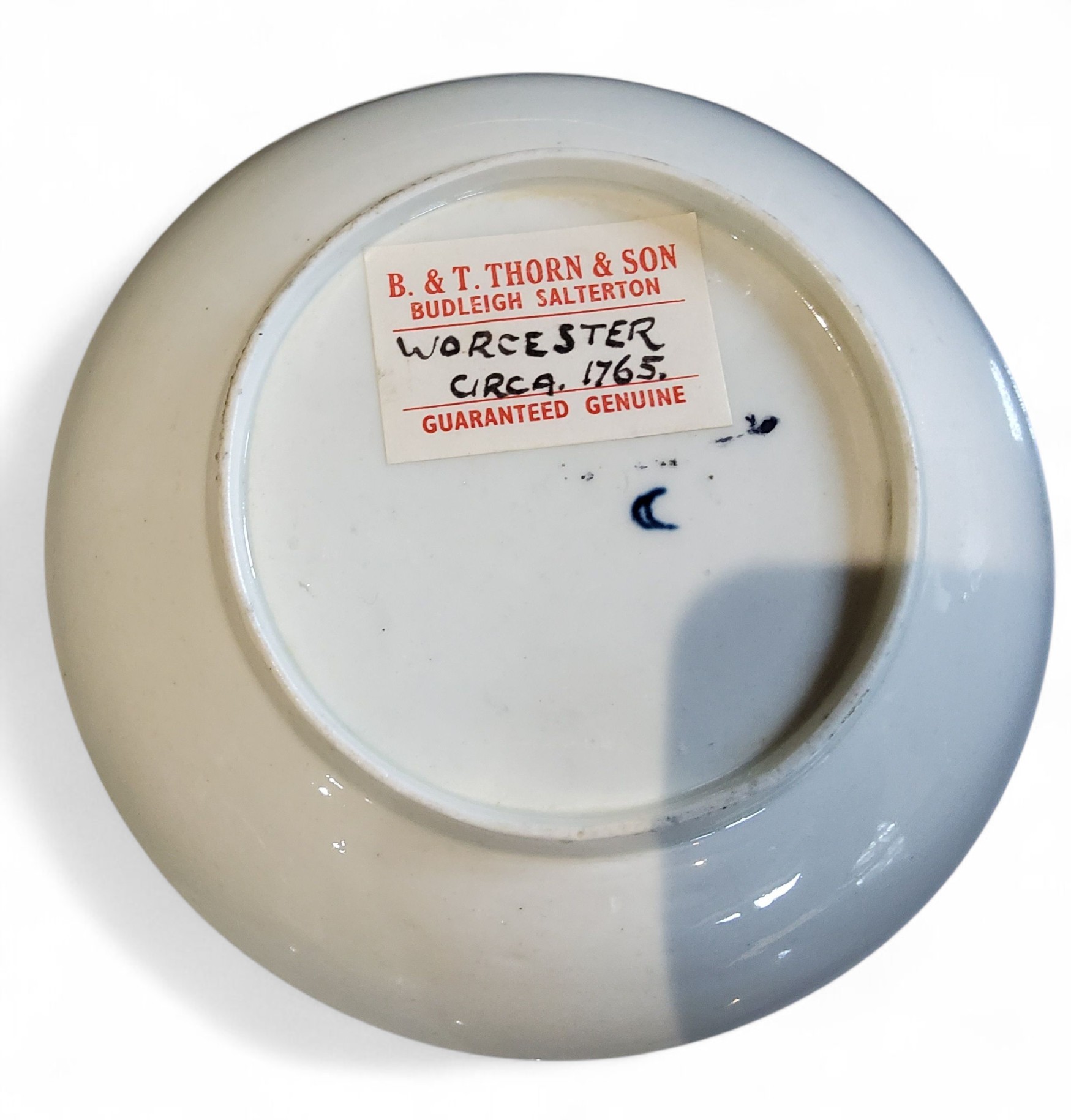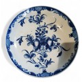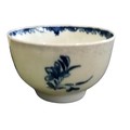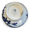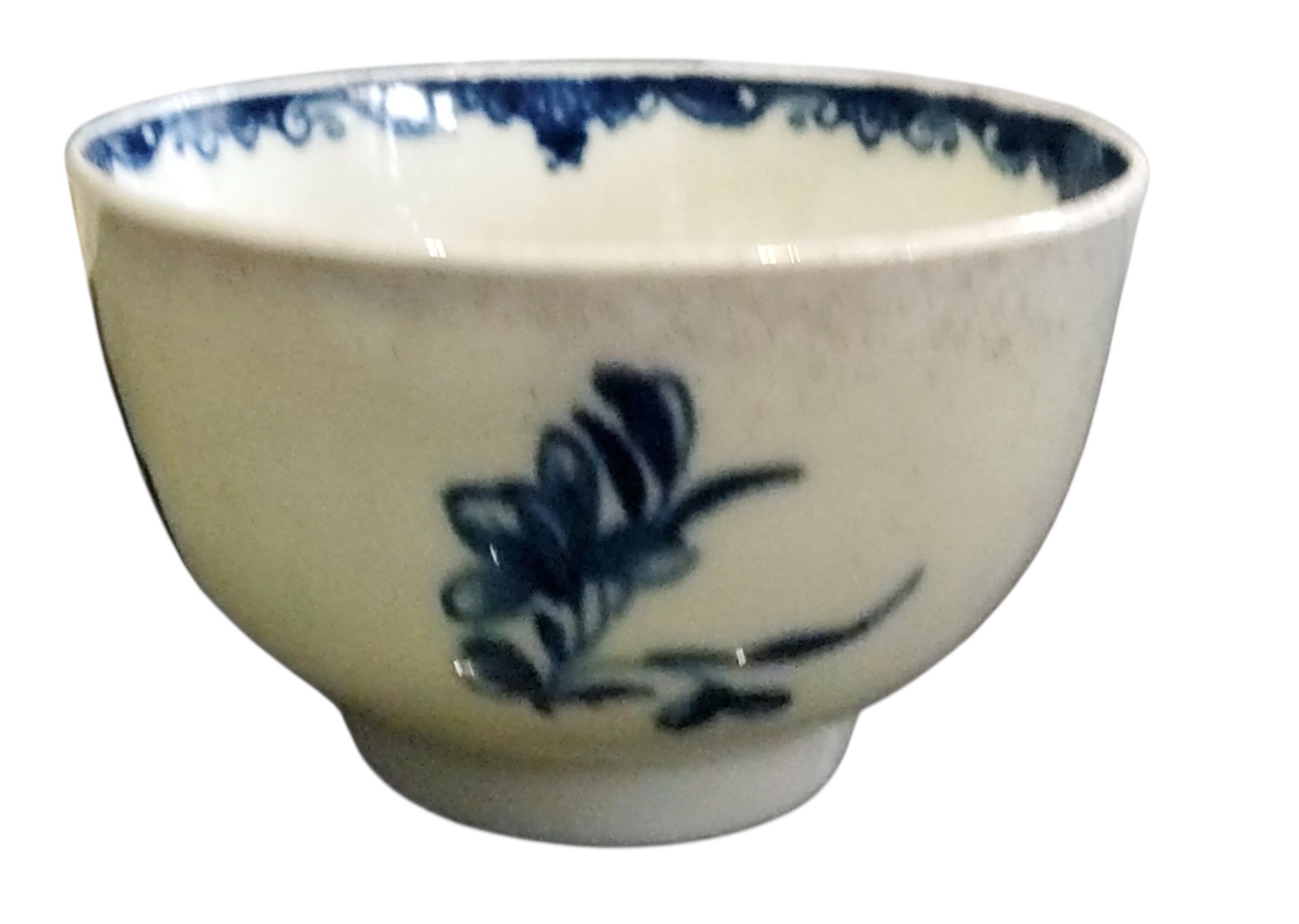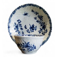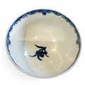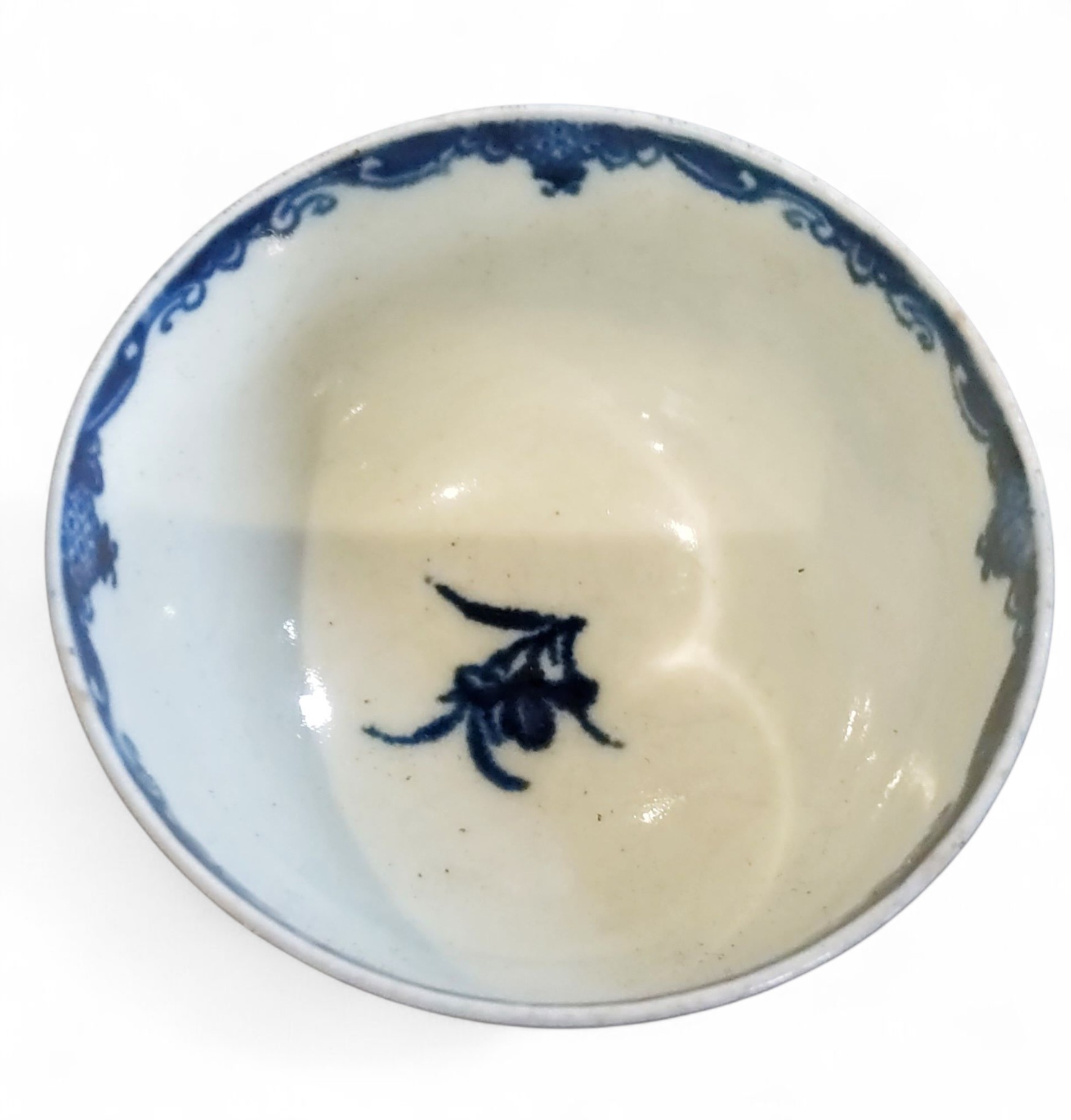A Worcester Mansfield pattern tea bowl and saucer, painted in underglaze blue with stylised flowers and foliage, scroll borders, crescent mark, c.1770