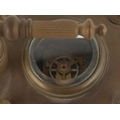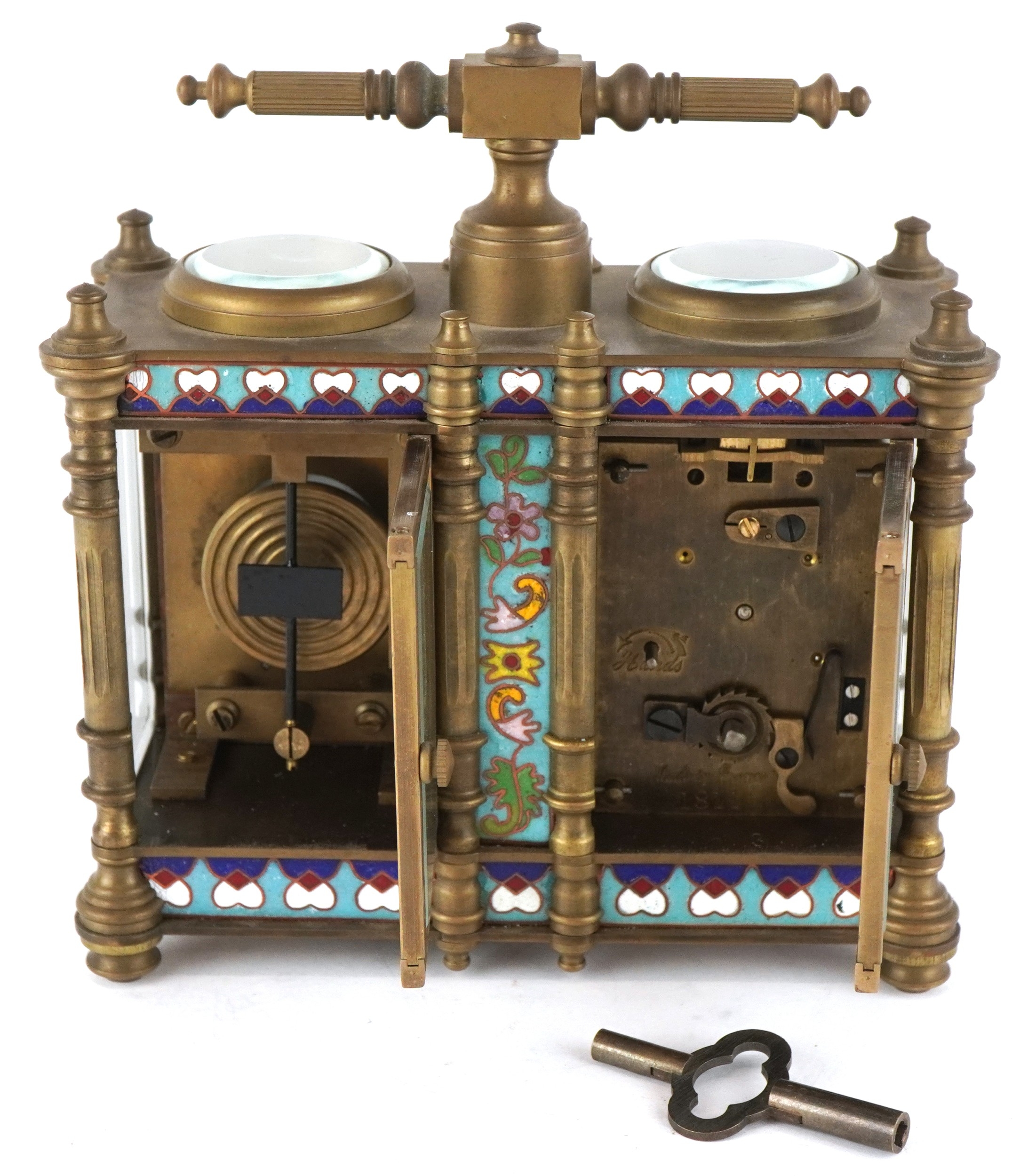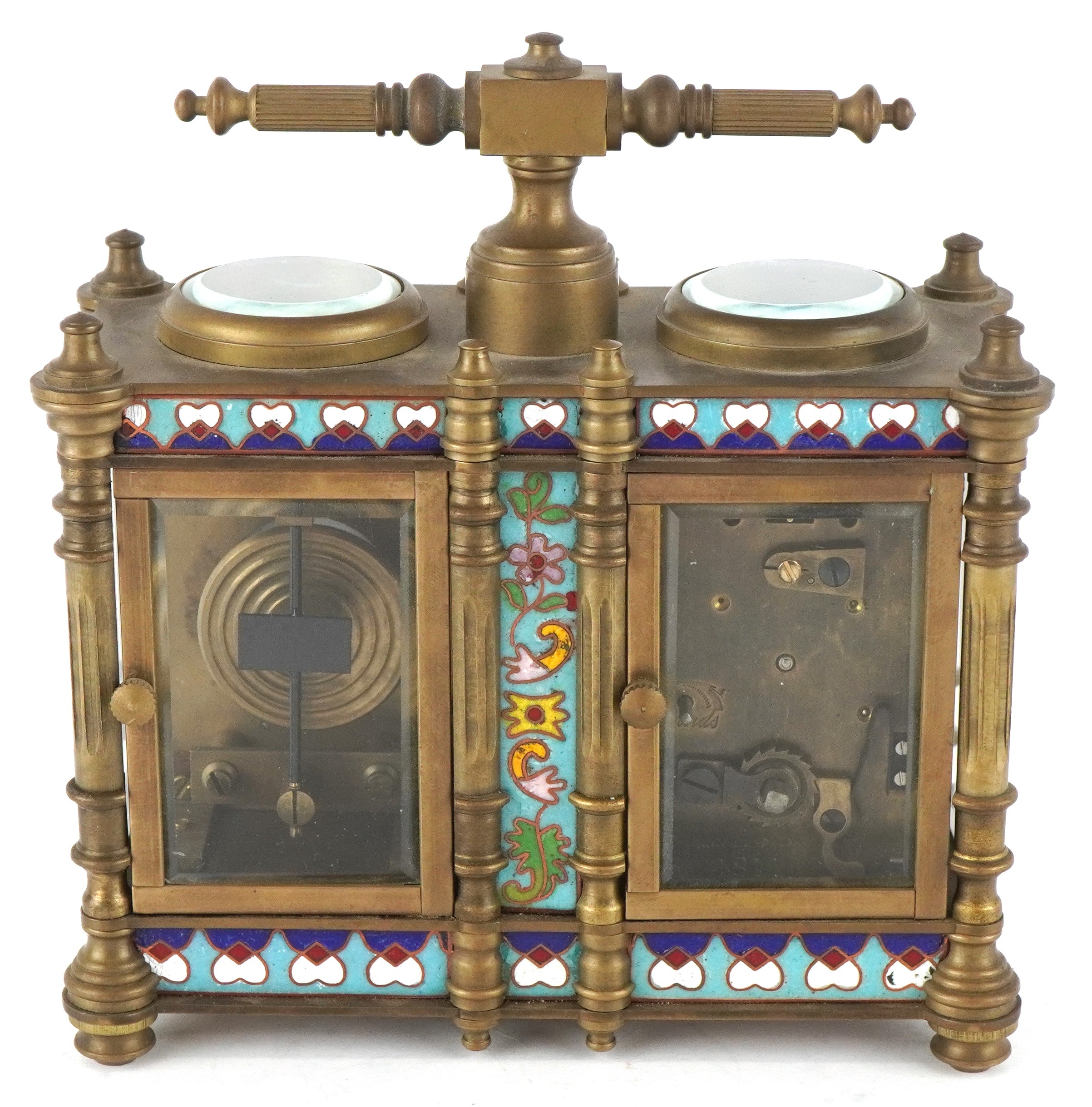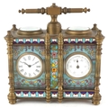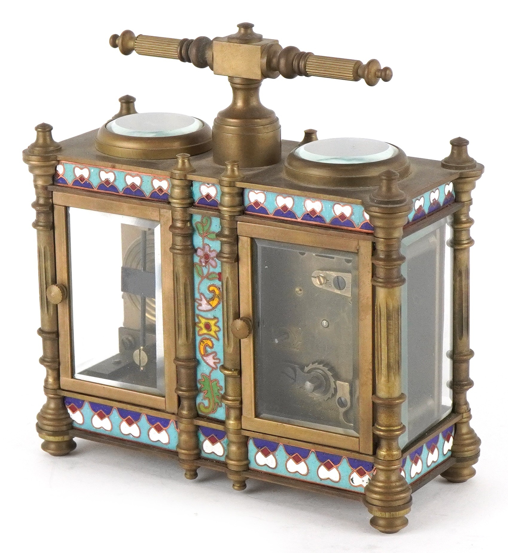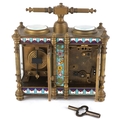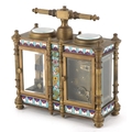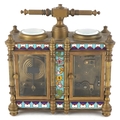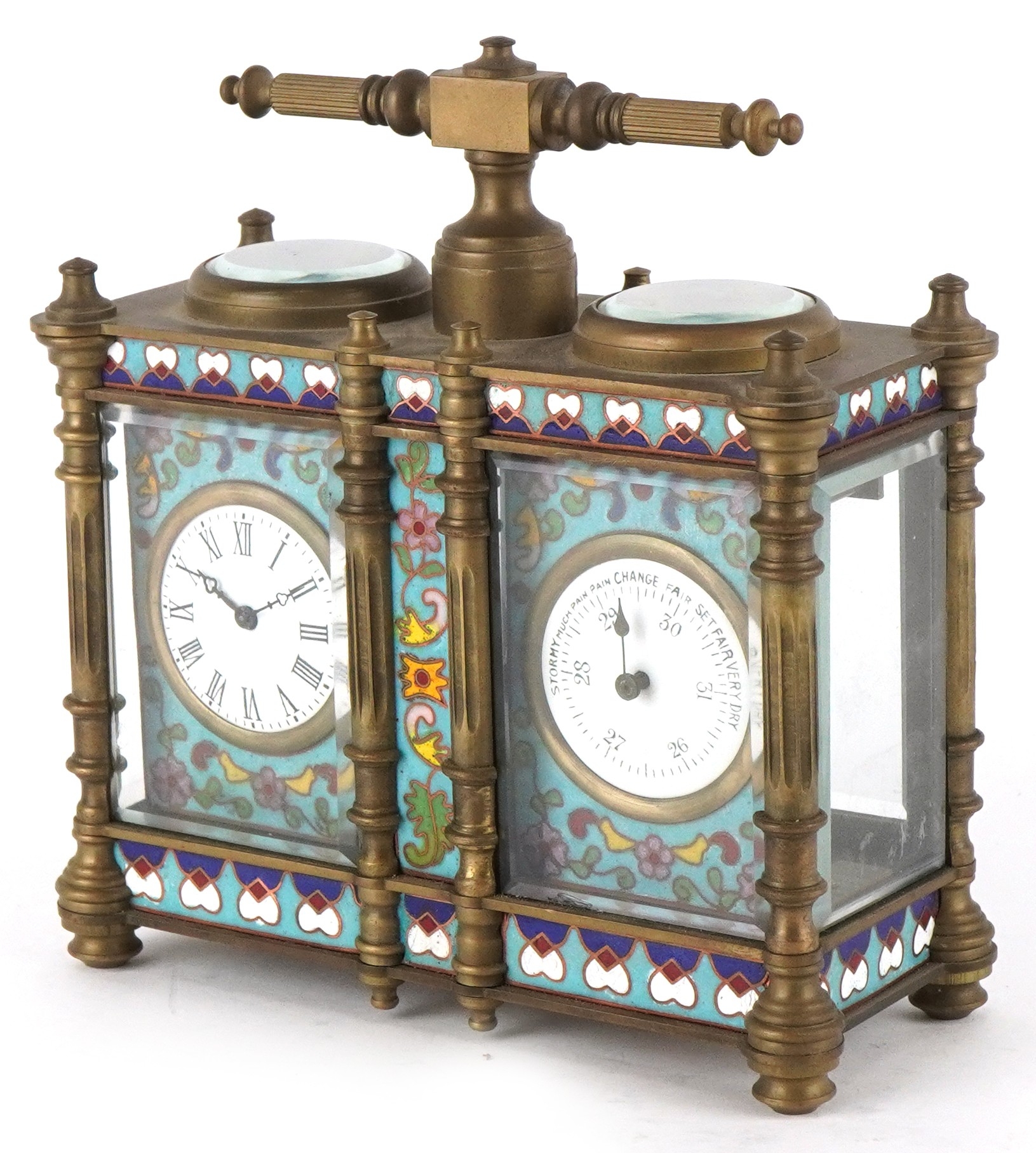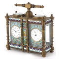A champlevé enamel brass cased travelling timepiece with clock and barometer, 14cm high.