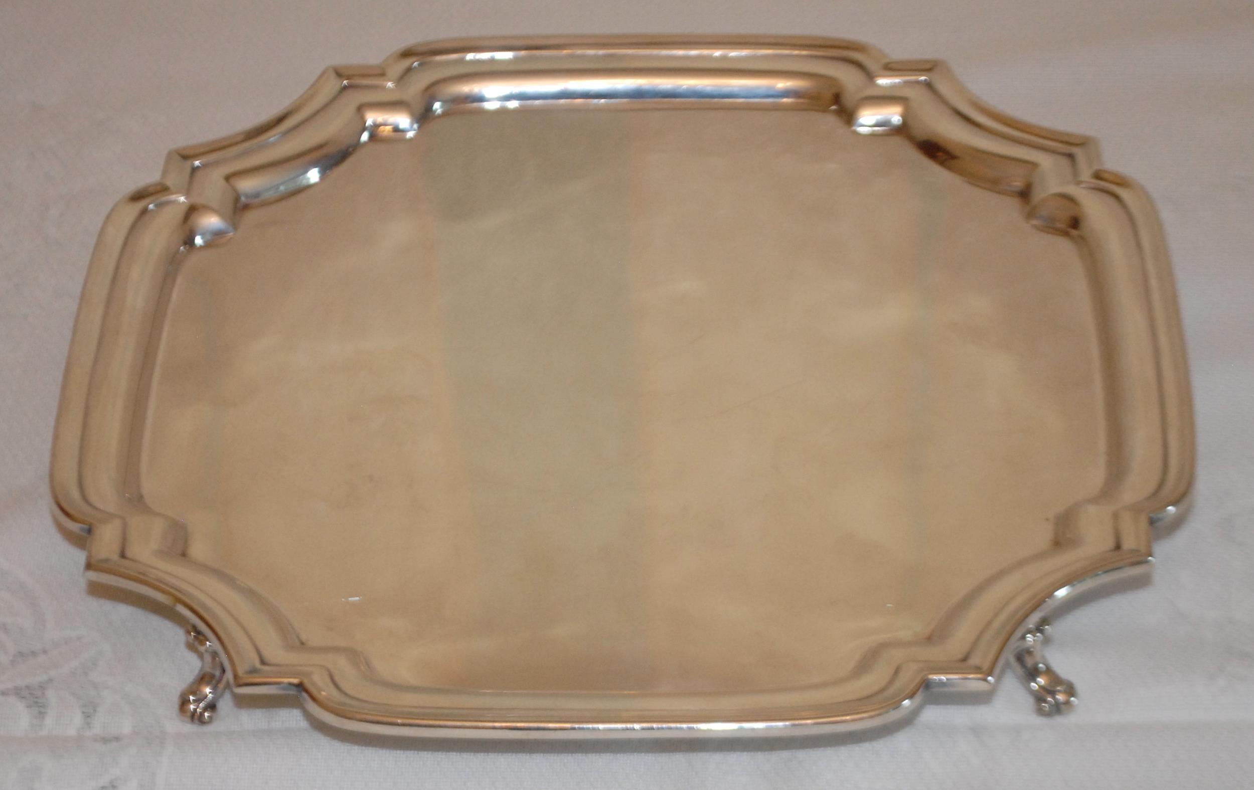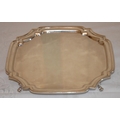 A silver George III style shaped square tray, shaped rim, scroll feet, 27cm wide, Martin, Hall & Co, Sheffield 1931, 642g (20.7ozt)