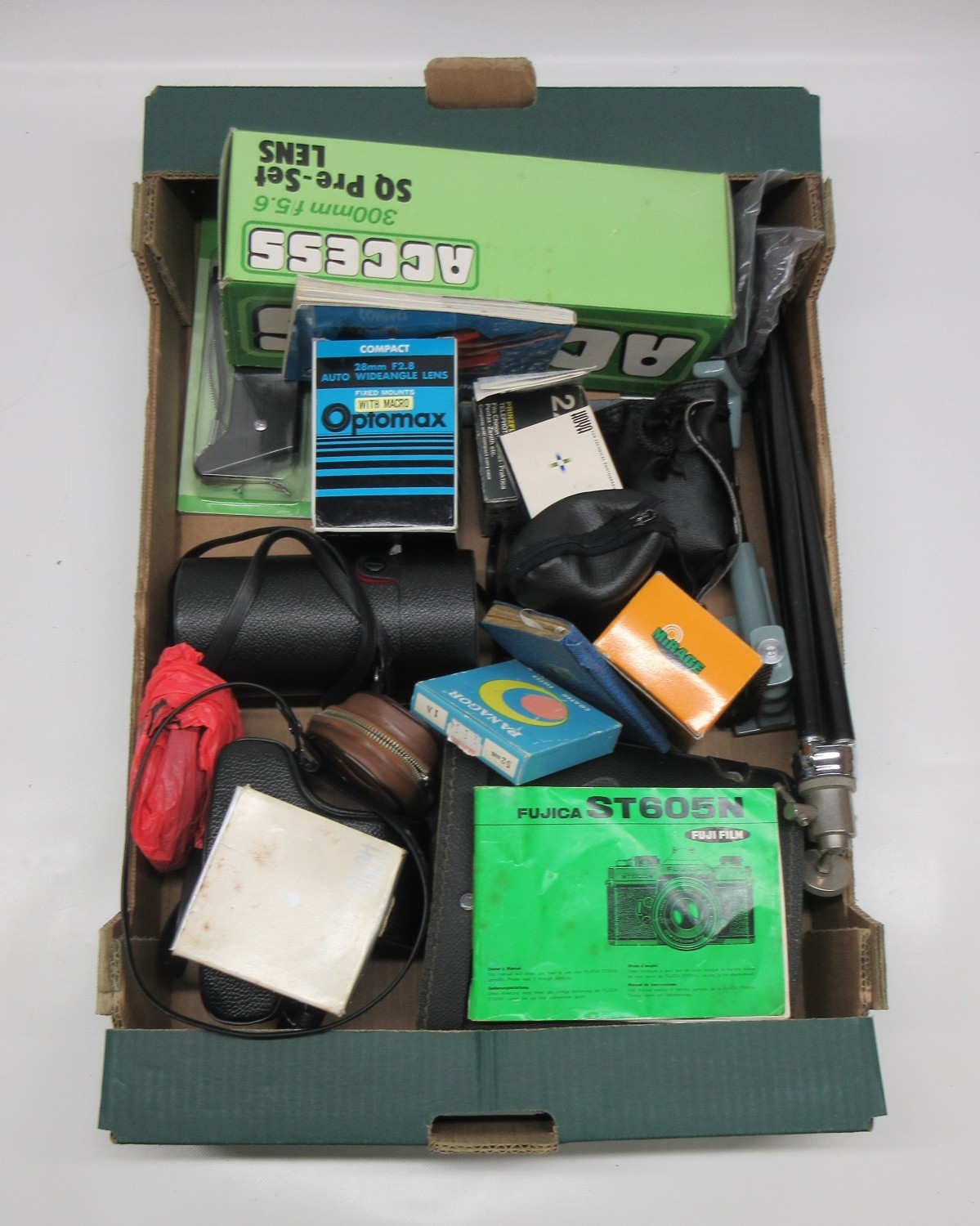 Cameras, camera equipment and binoculars, incl. Prinzlux 7 x 50 coated optics 372 FT. AT 1000 YDS. binoculars with case; Fujica ST605N with FUJI photo film f=55mm, 1:2.2 lens and case; PHOTAX-PARAGON 1:35 f=200mm lens with case; Auto Optomax f=28mm lens with case, without cap; Solitel 1:28 f=135mm lens with case; etc.