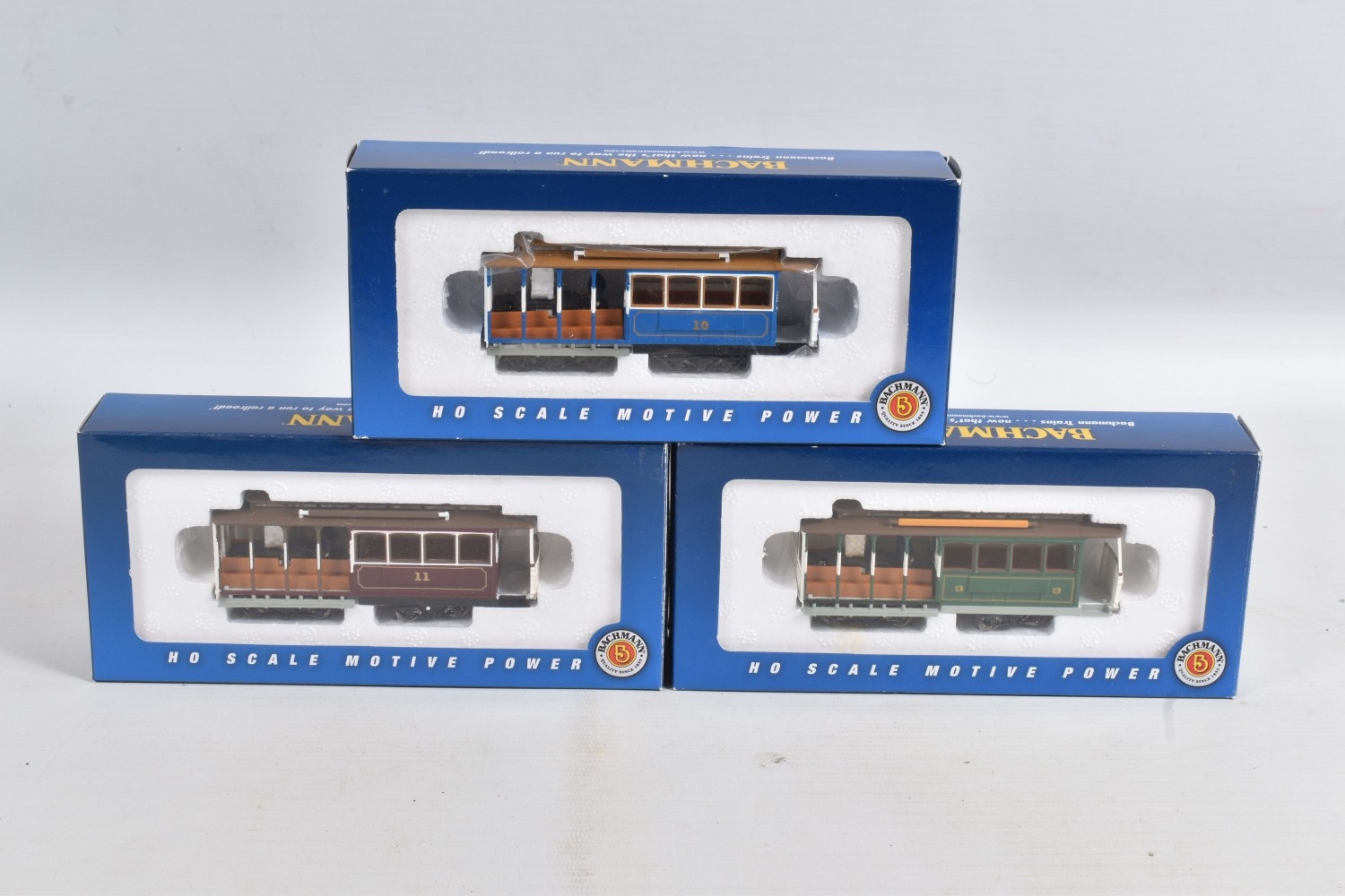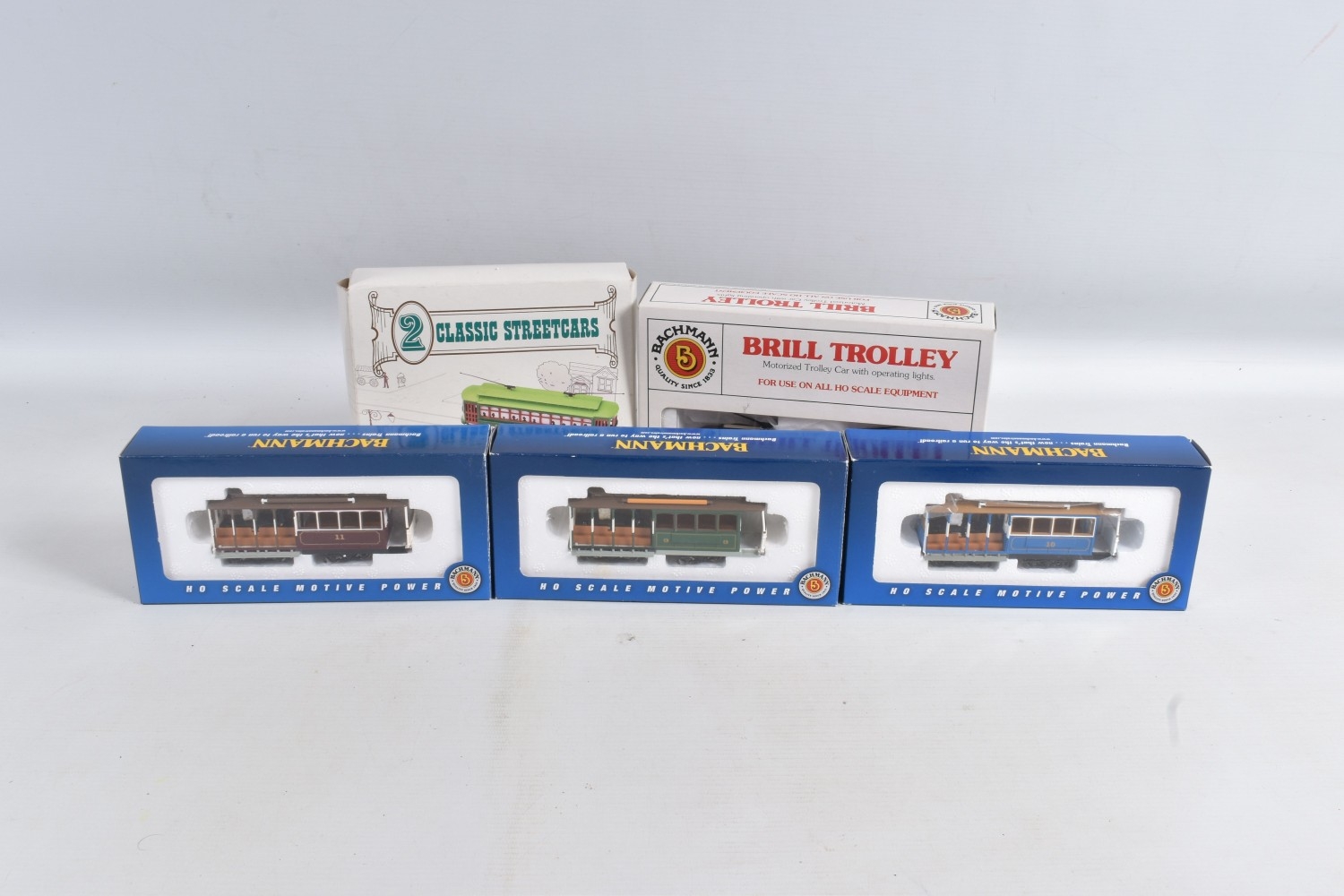 A QUANTITY OF BOXED BACHMANN HO GAUGE TROLLEY AND CABLE CAR MODELS, Hershey Brill Trolley, No.9, brown and cream livery (61039), 3 x Cable Car models No.11, red livery (60530), No.3, green livery (60531) and No.10, blue livery (60532), all appear complete and in very good condition, all with instructions, with a boxed set of two similar plastic static Trolley & Cable Car models (6)
