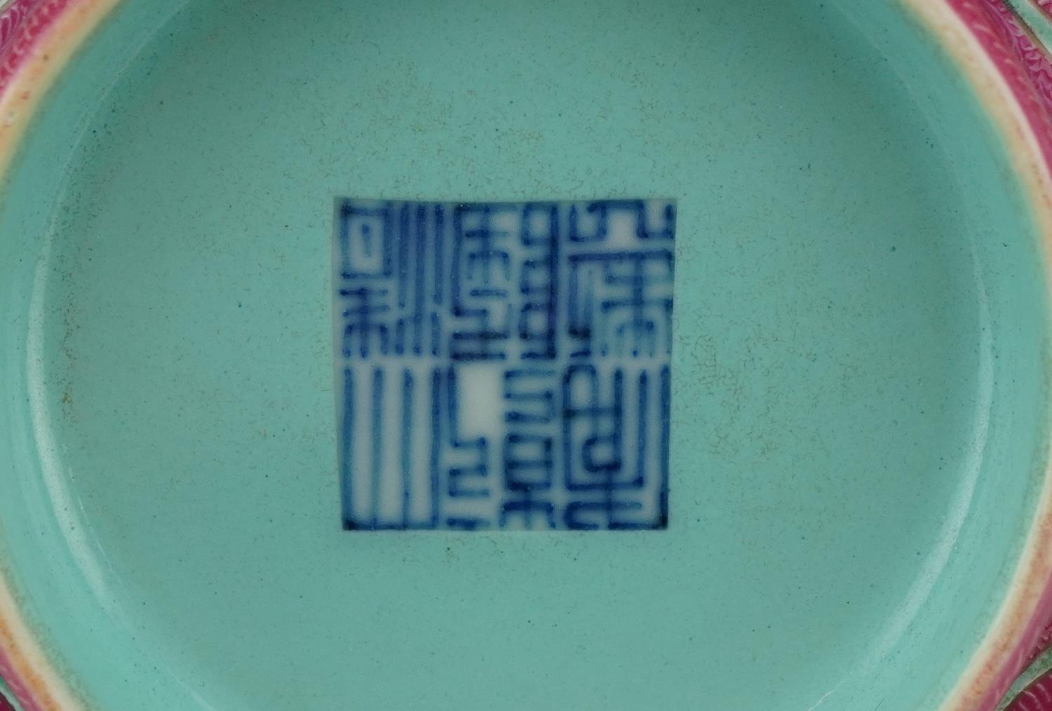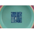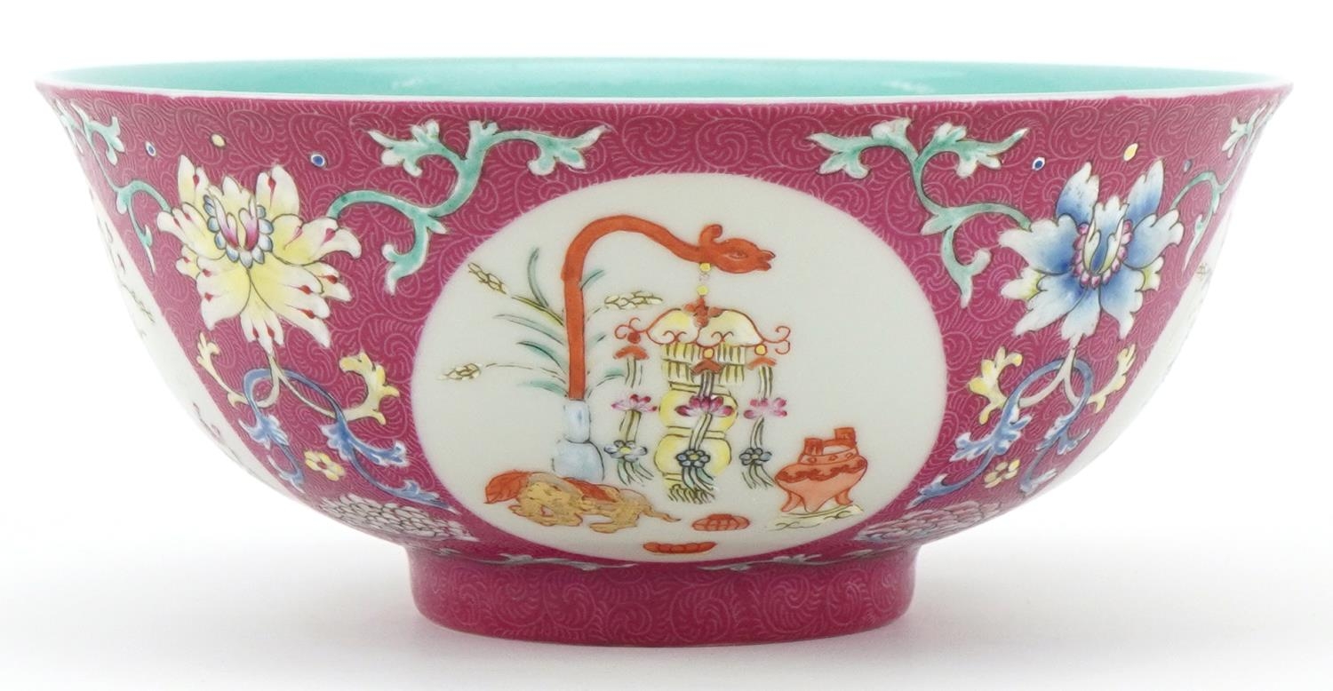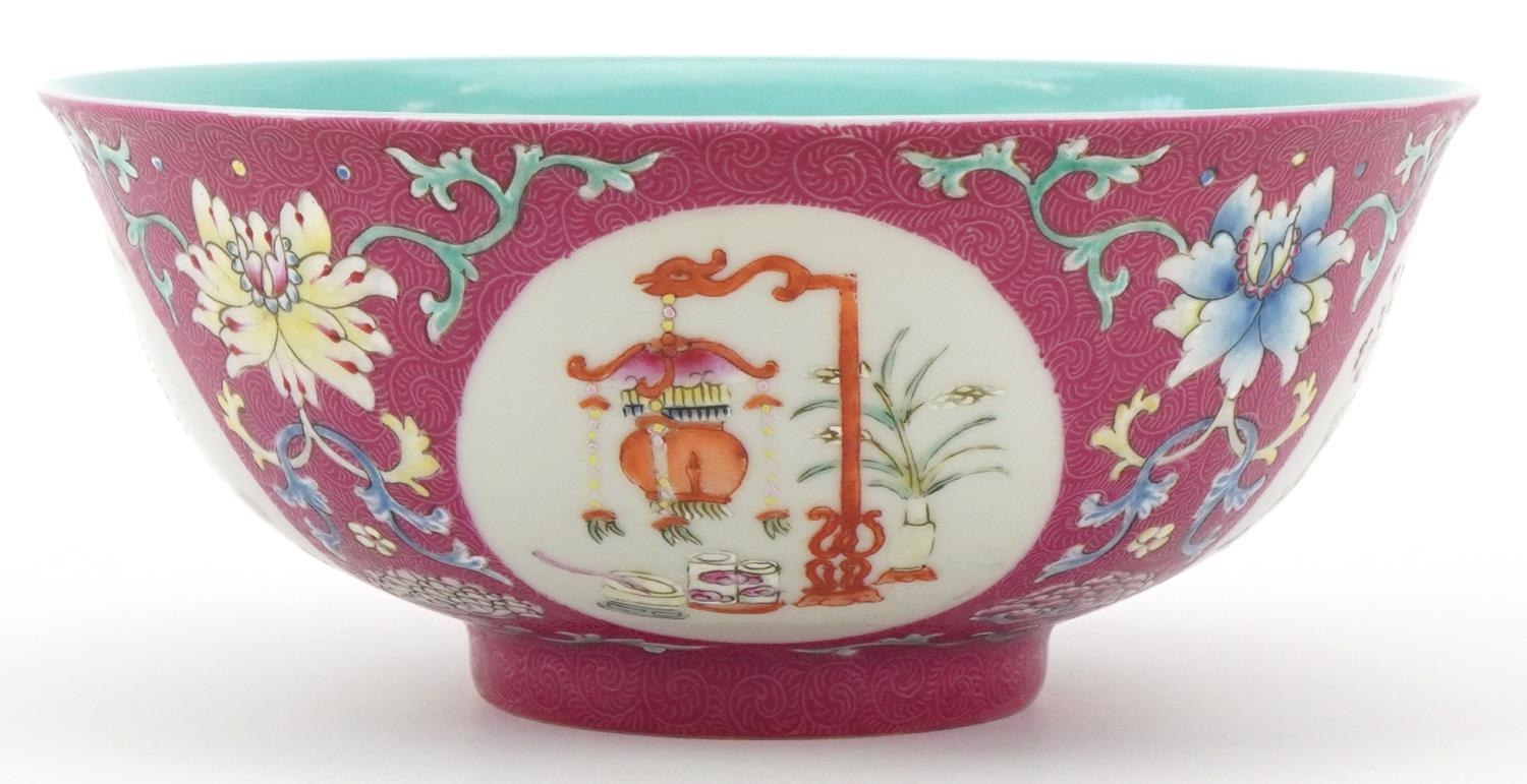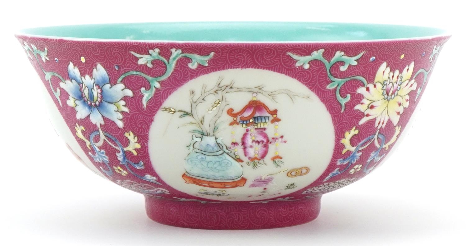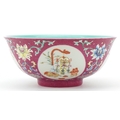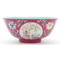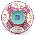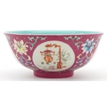 A Chinese hand painted bowl hand painted in the famille rose palette with foliage amongst four panels depicting lanterns onto a pink ground, character marks to the base, 7cm high x 15.5cm in diameter.
