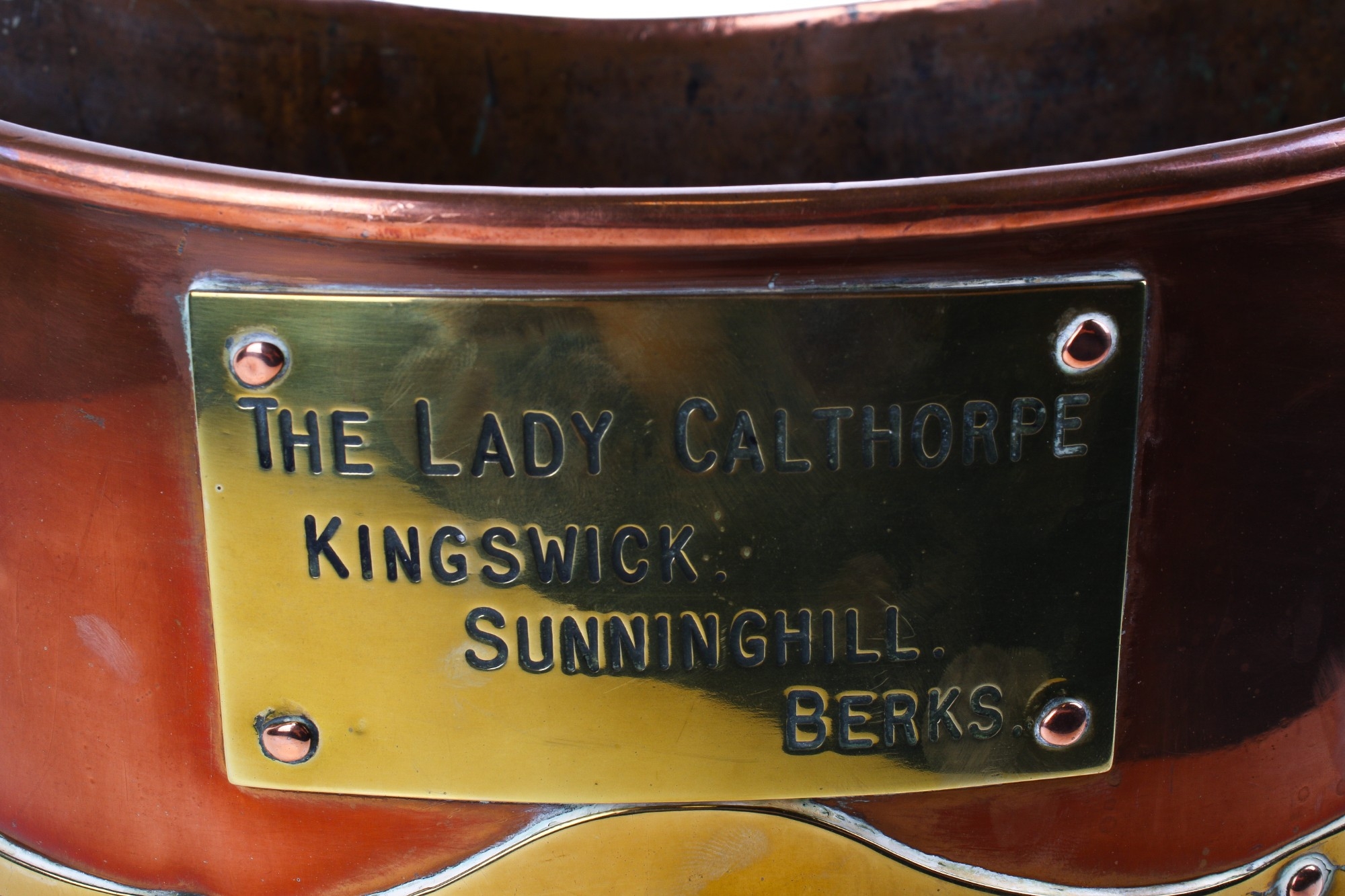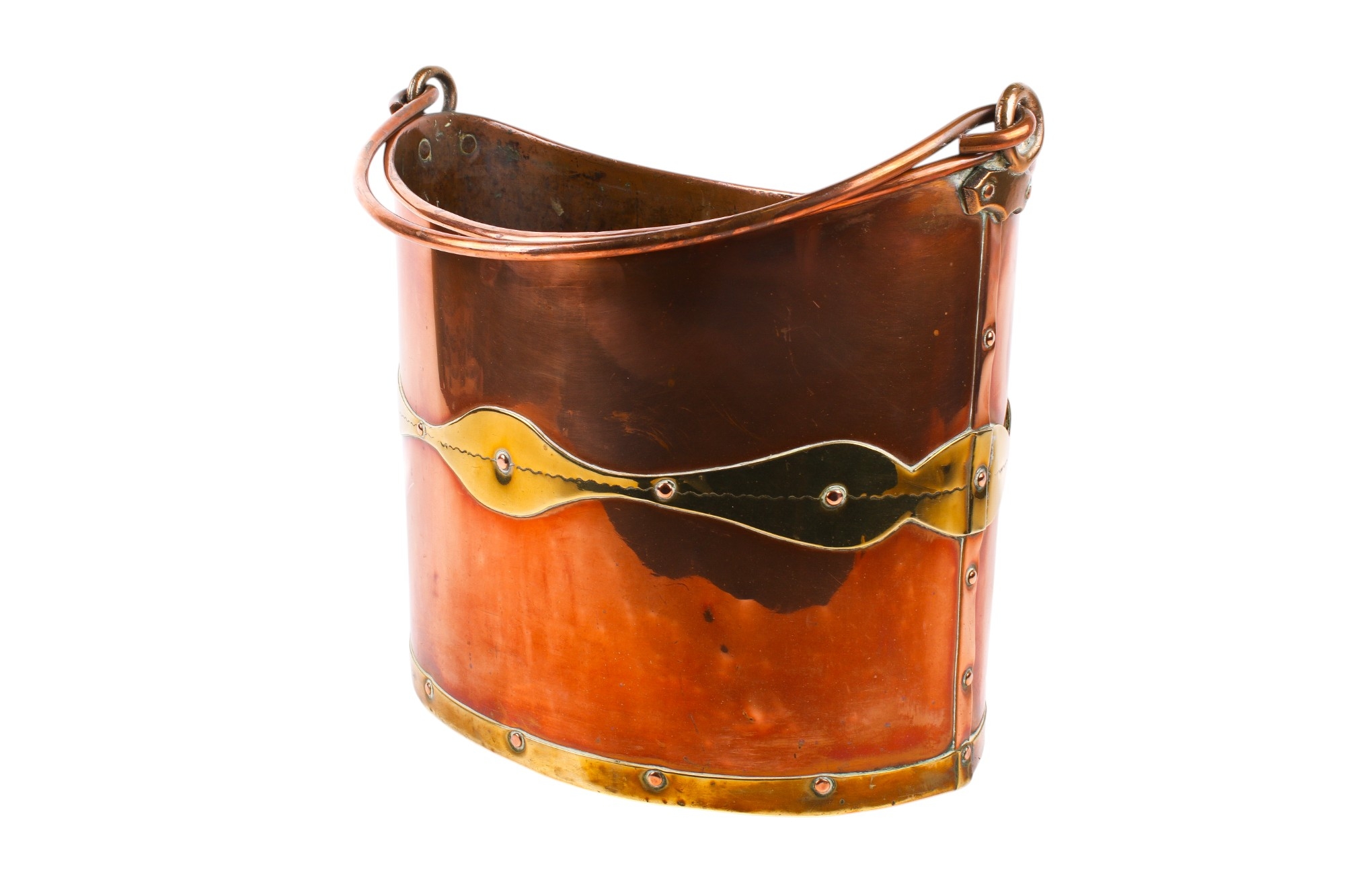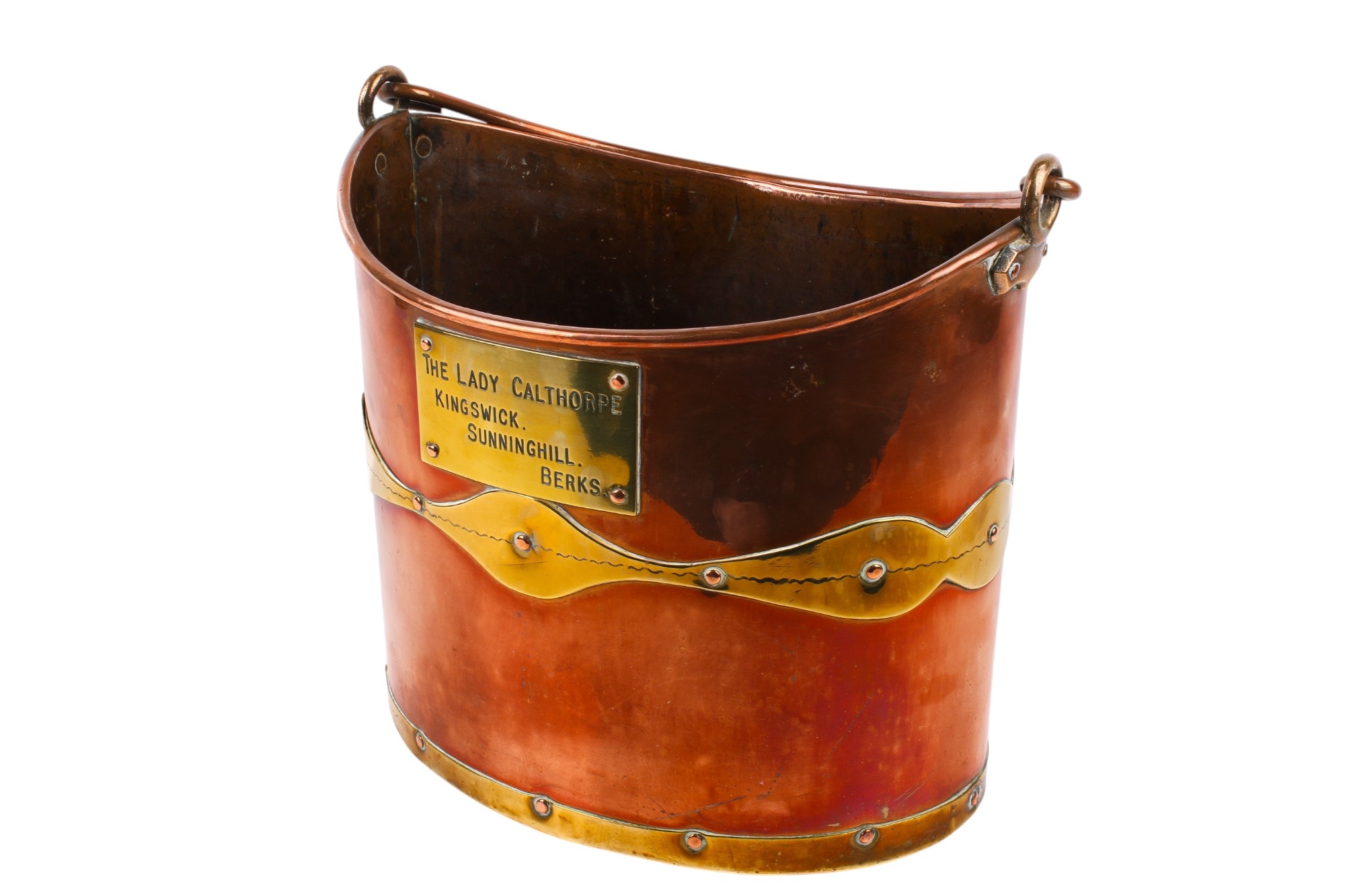 A 19th century brass and copper coal bucket. Of oval form, with a swing handle and a brass plaque marked 'The Lady Calthorpe, Kingswick, Sunninghill, Berks', H31cm (excluding handle)