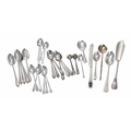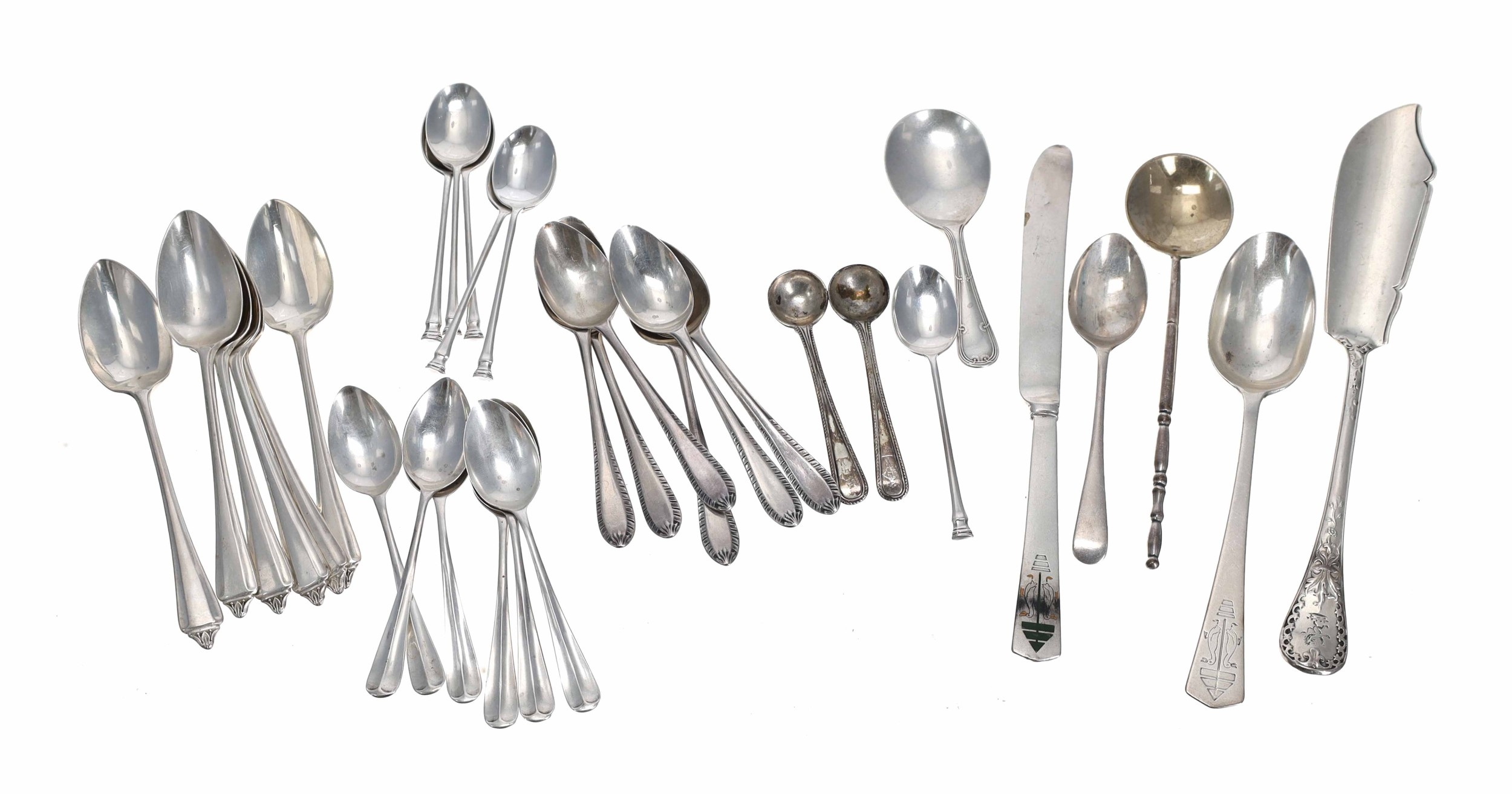 Set of six silver teaspoons by James Dixon & Son, Sheffield 1963, 5.5" long; together with six silver teaspoons by Viner's Ltd; another six silver teaspoons by Viner's Ltd; six silver coffee spoons by James Dixon & Son, pair of silver salt spoons by Henry Holland, silver caddy spoon by H Hunt, another silver teaspoon, Chawner & Co silver fish knife, gilt silver vermeil spoon by Brook & Son and a silver knife and spoon pair with emblem crest to the handles by Cartier London, 15.7oz t total