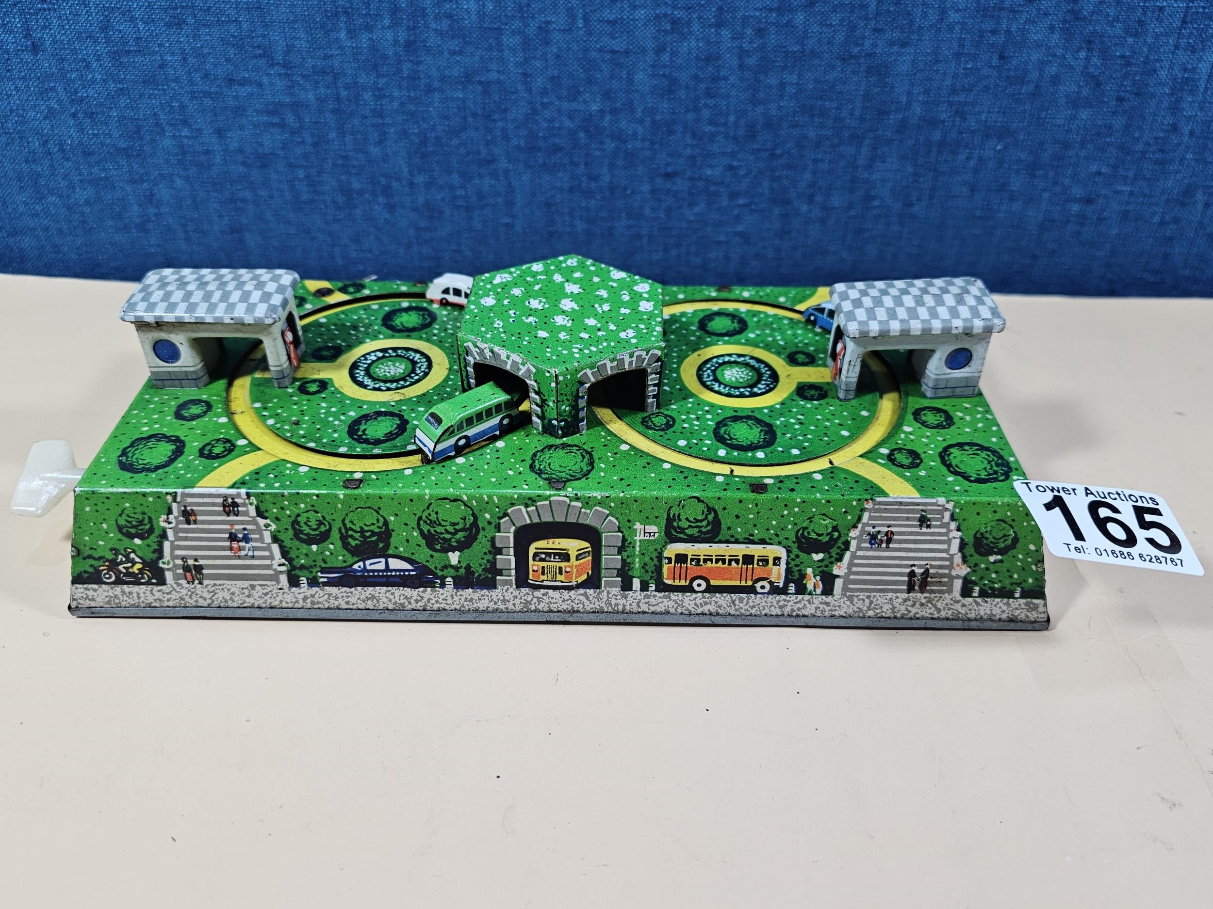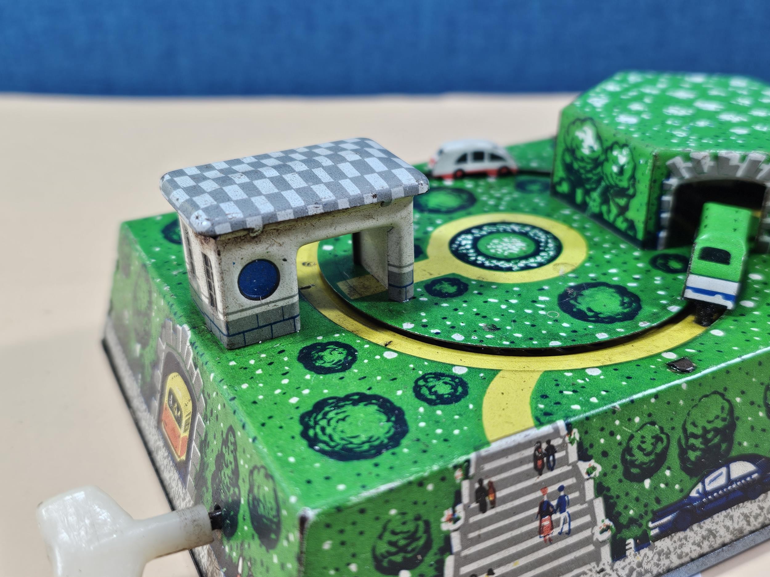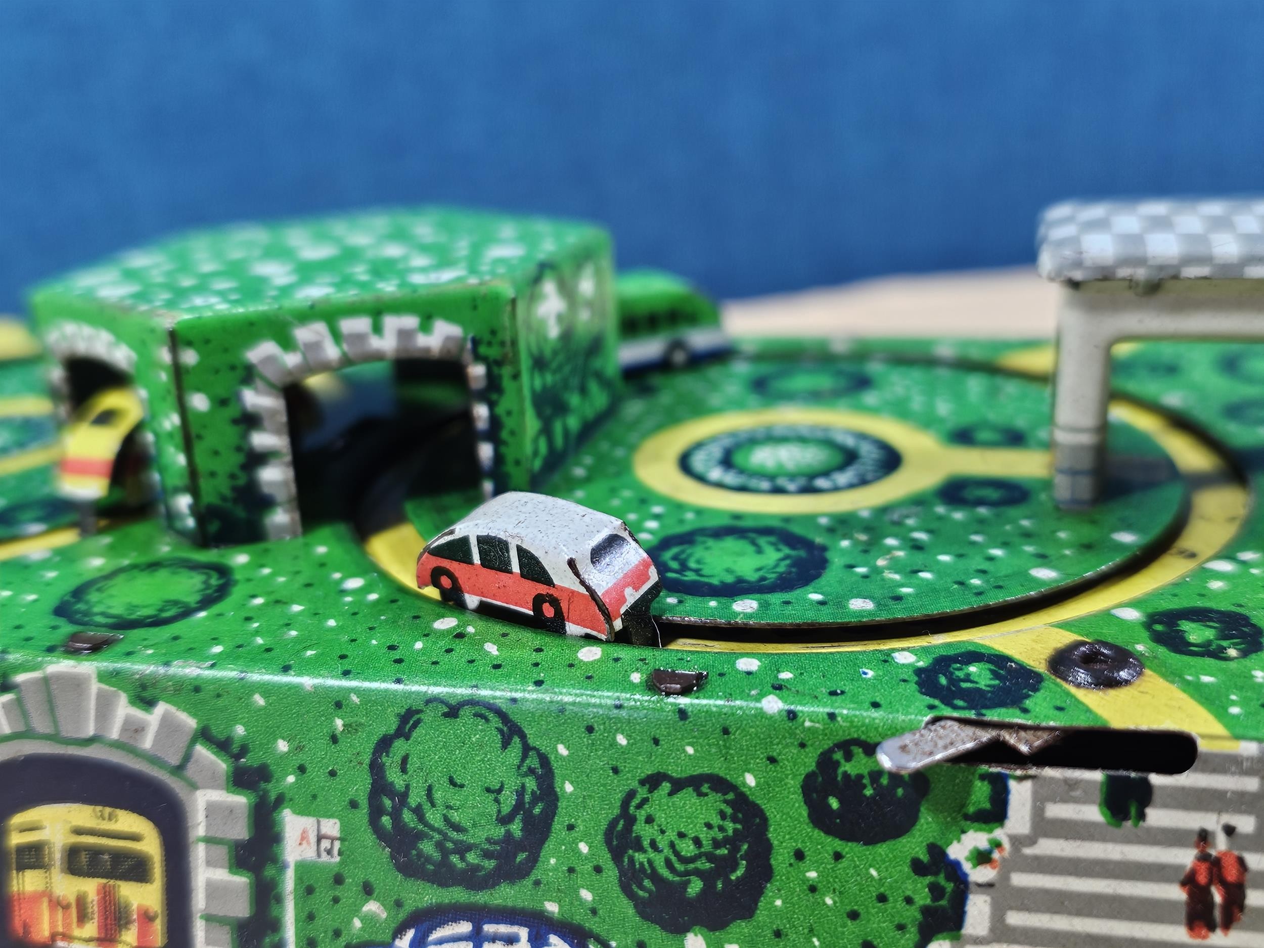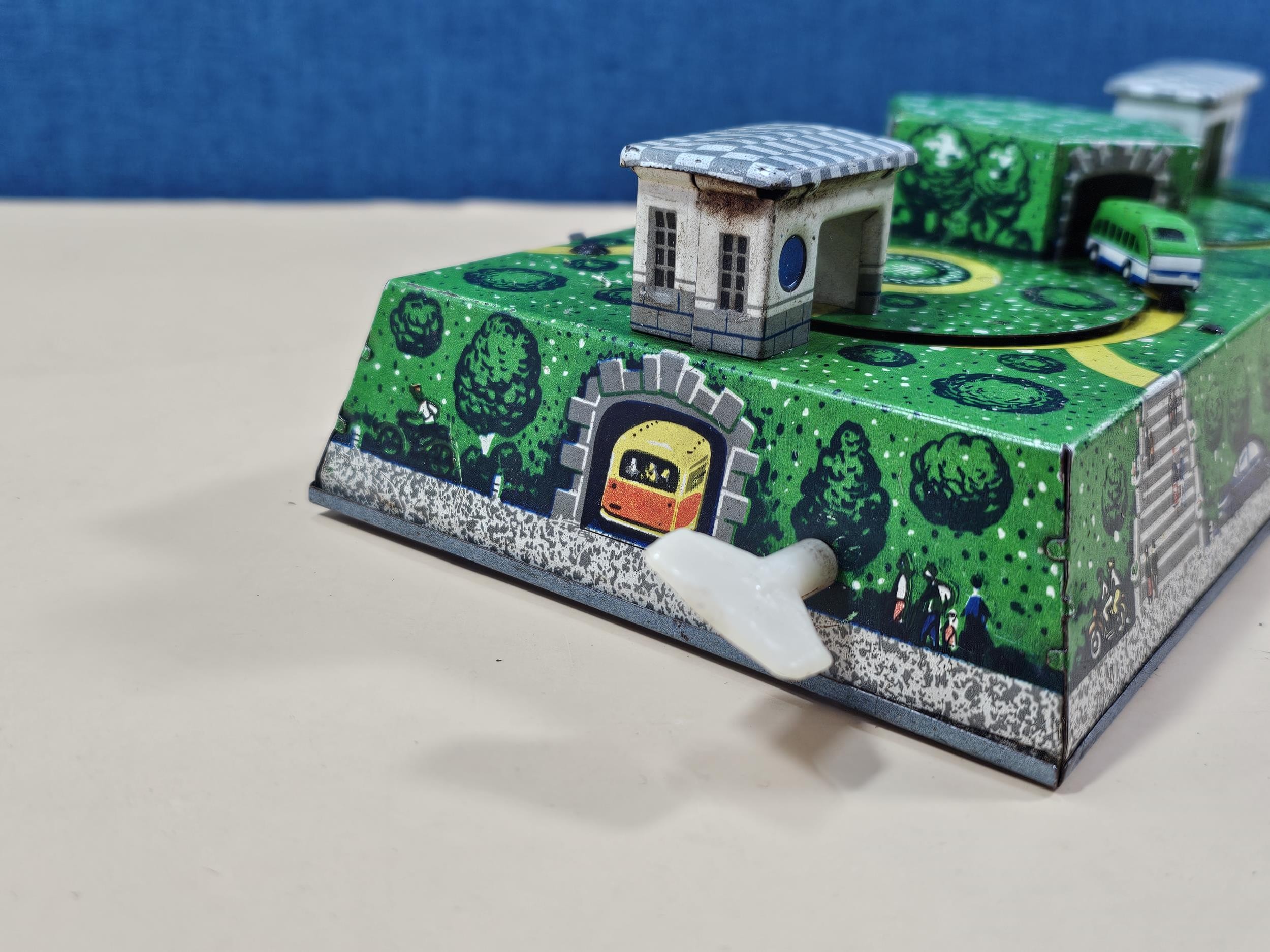 Good quality vintage clockwork tin toy showing vehicles going through tunnels, made by Abtotpacca (USSR) in working condition with the key. measures 7cm high 24cm long and 12cm deep