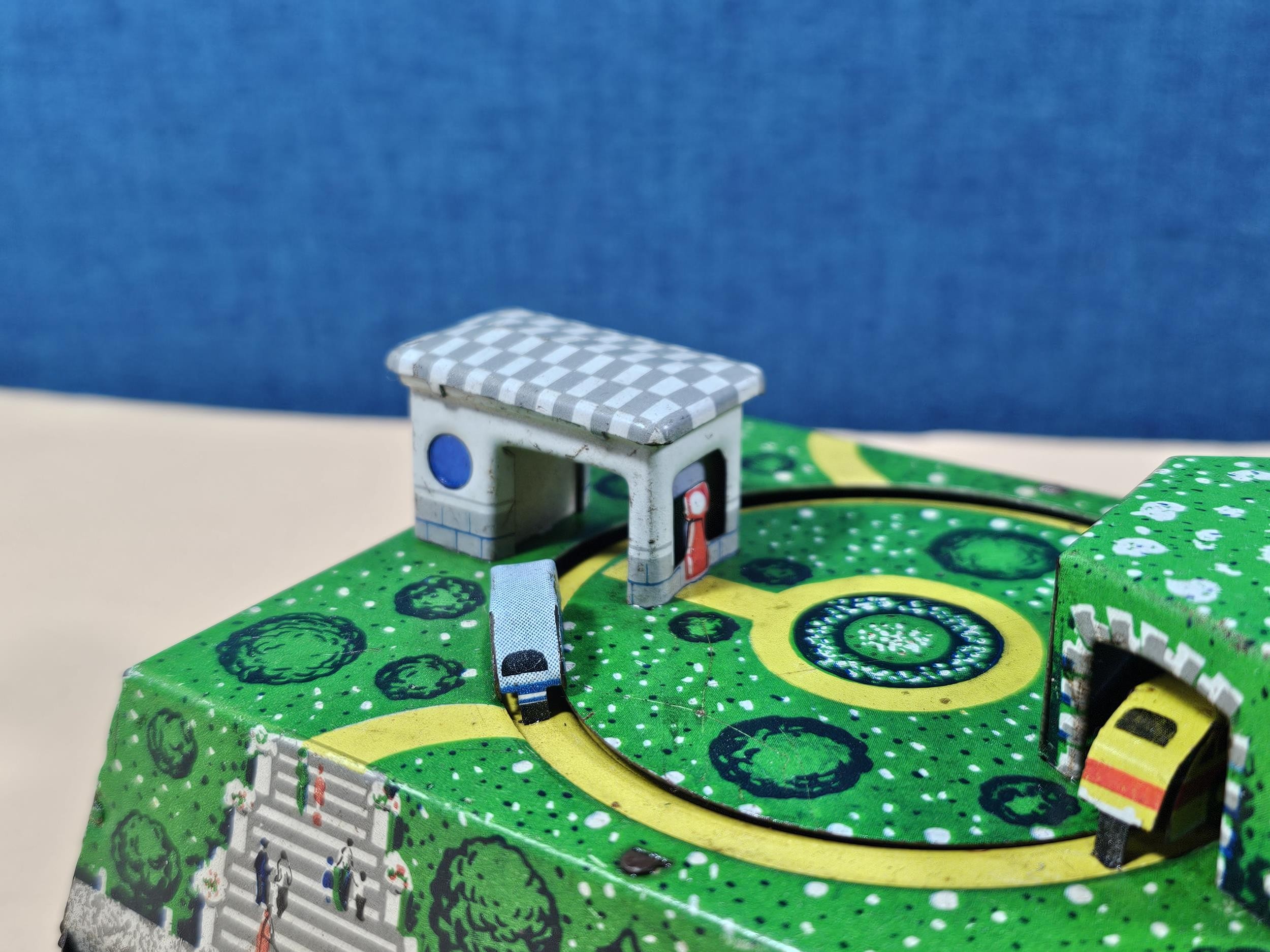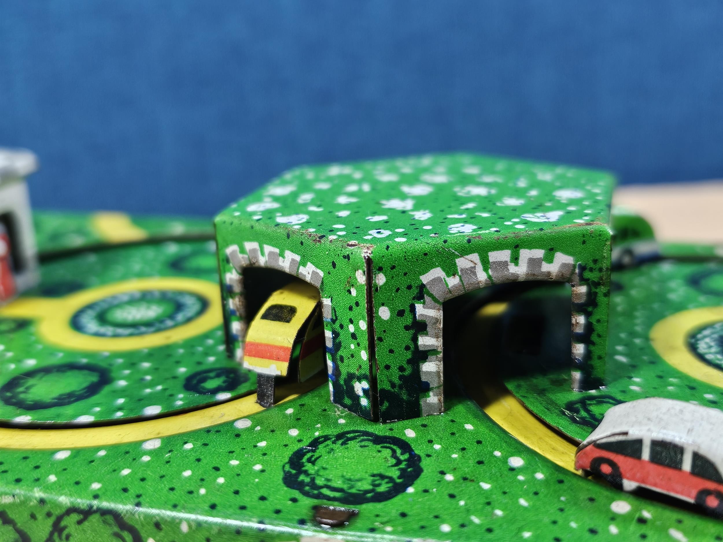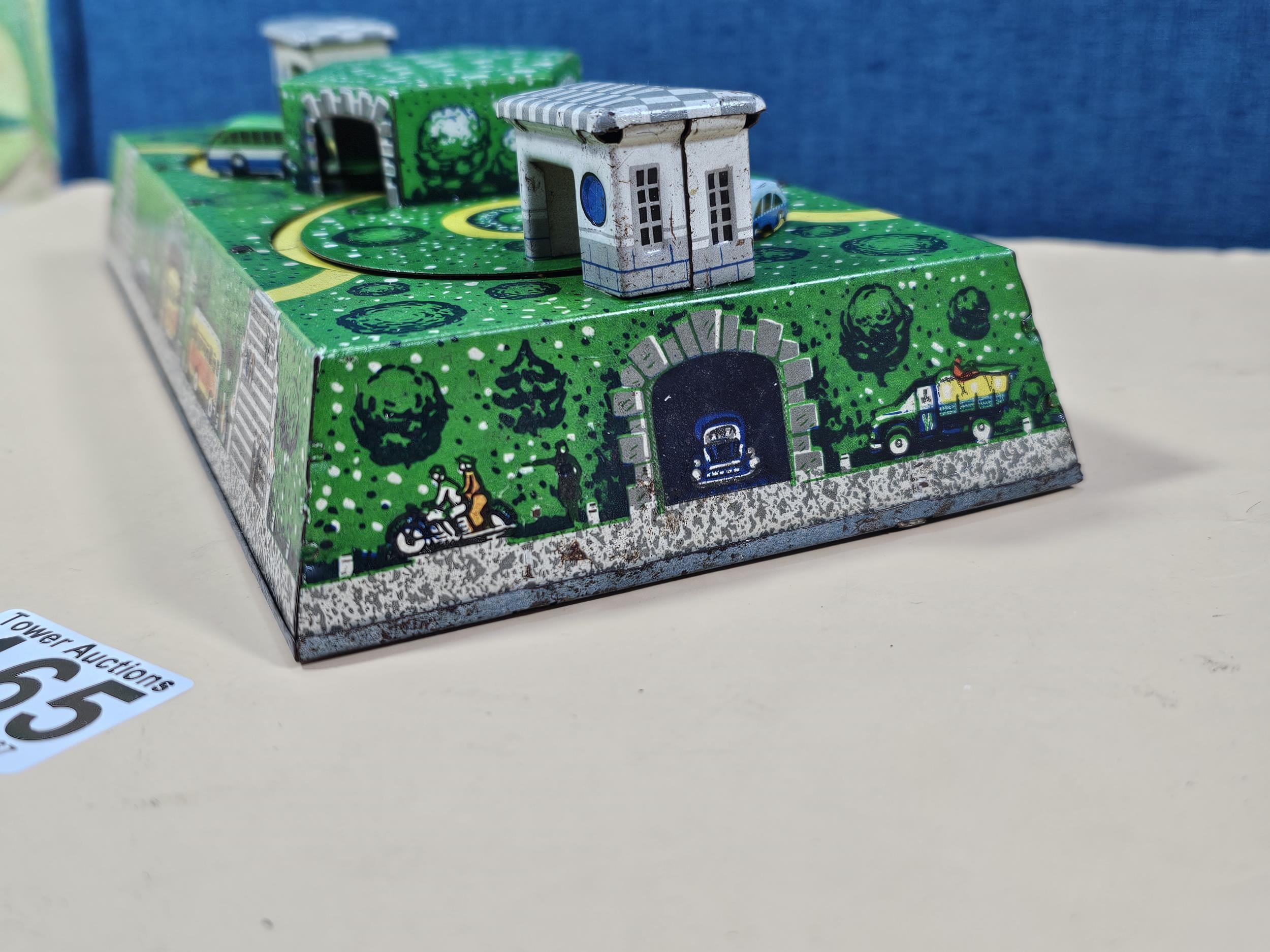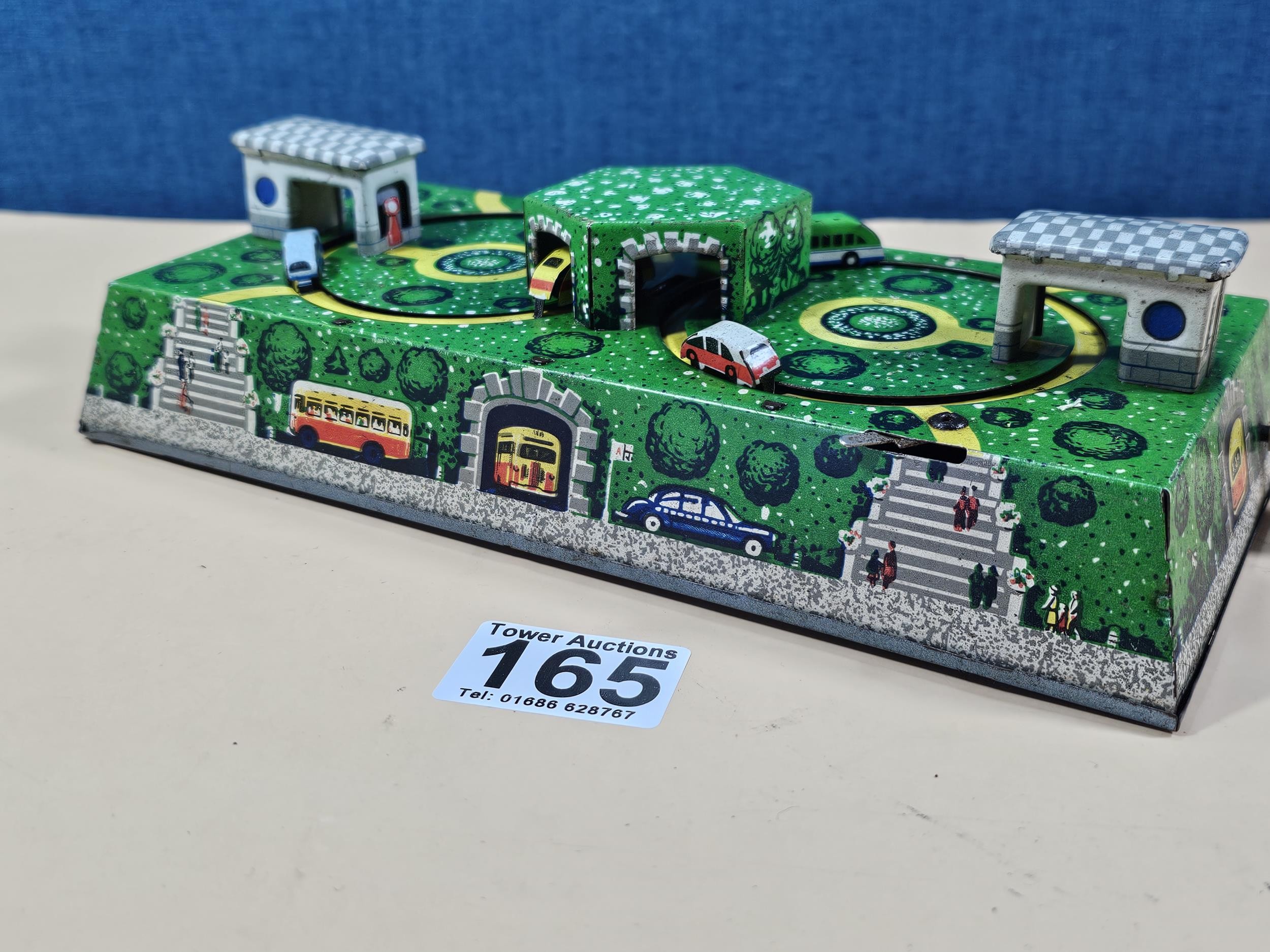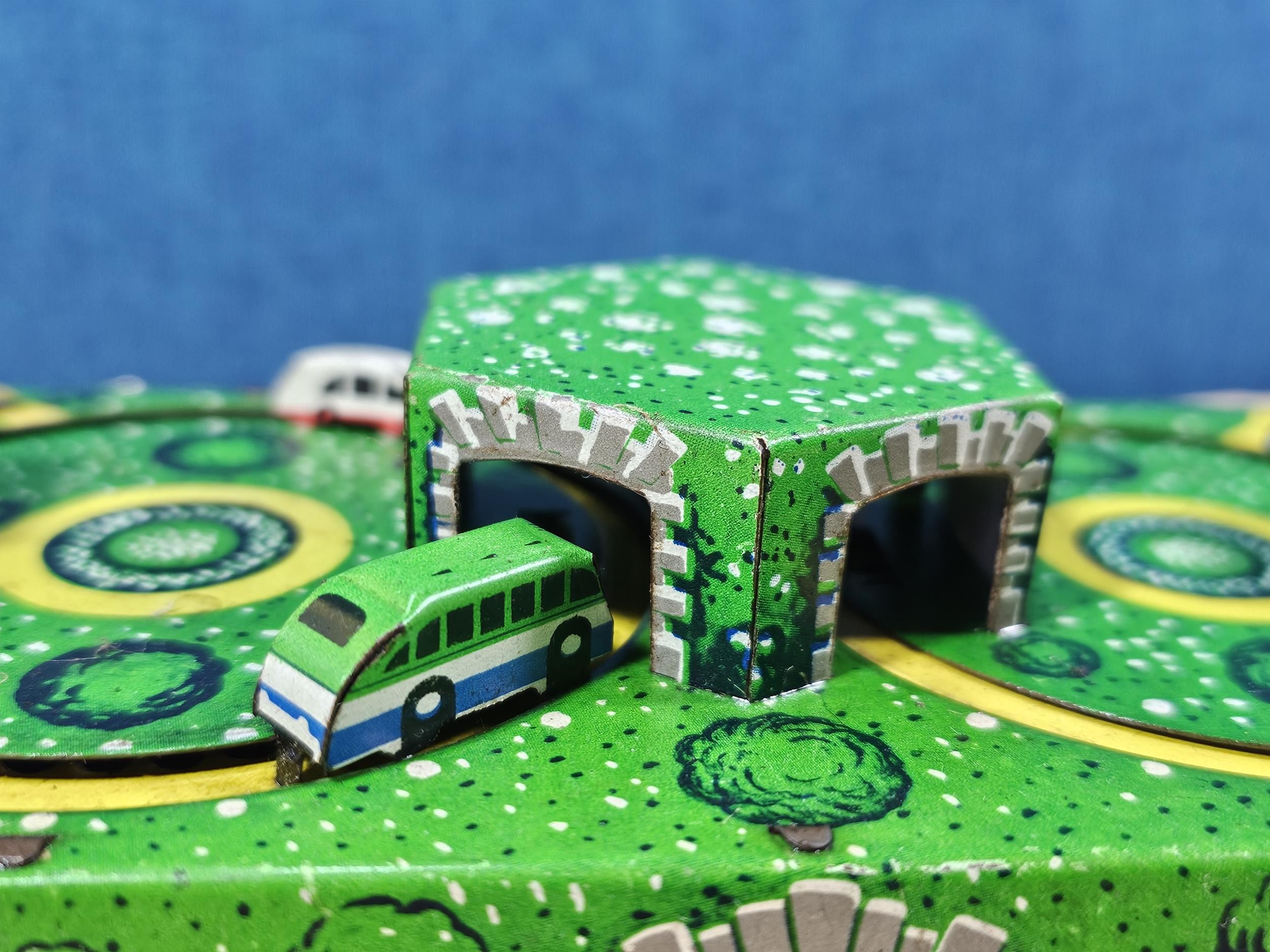 Good quality vintage clockwork tin toy showing vehicles going through tunnels, made by Abtotpacca (USSR) in working condition with the key. measures 7cm high 24cm long and 12cm deep