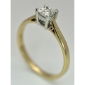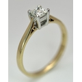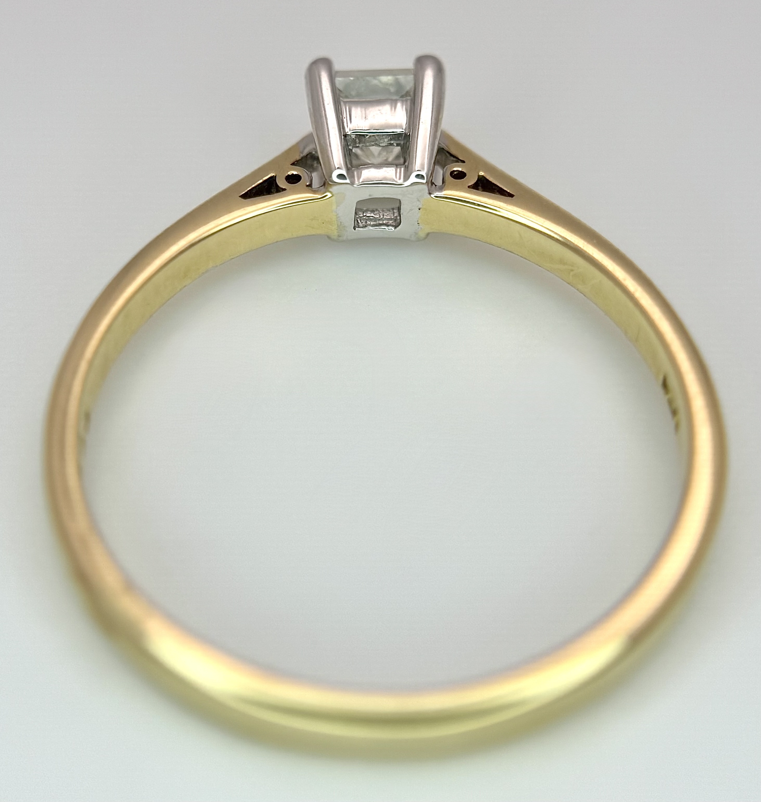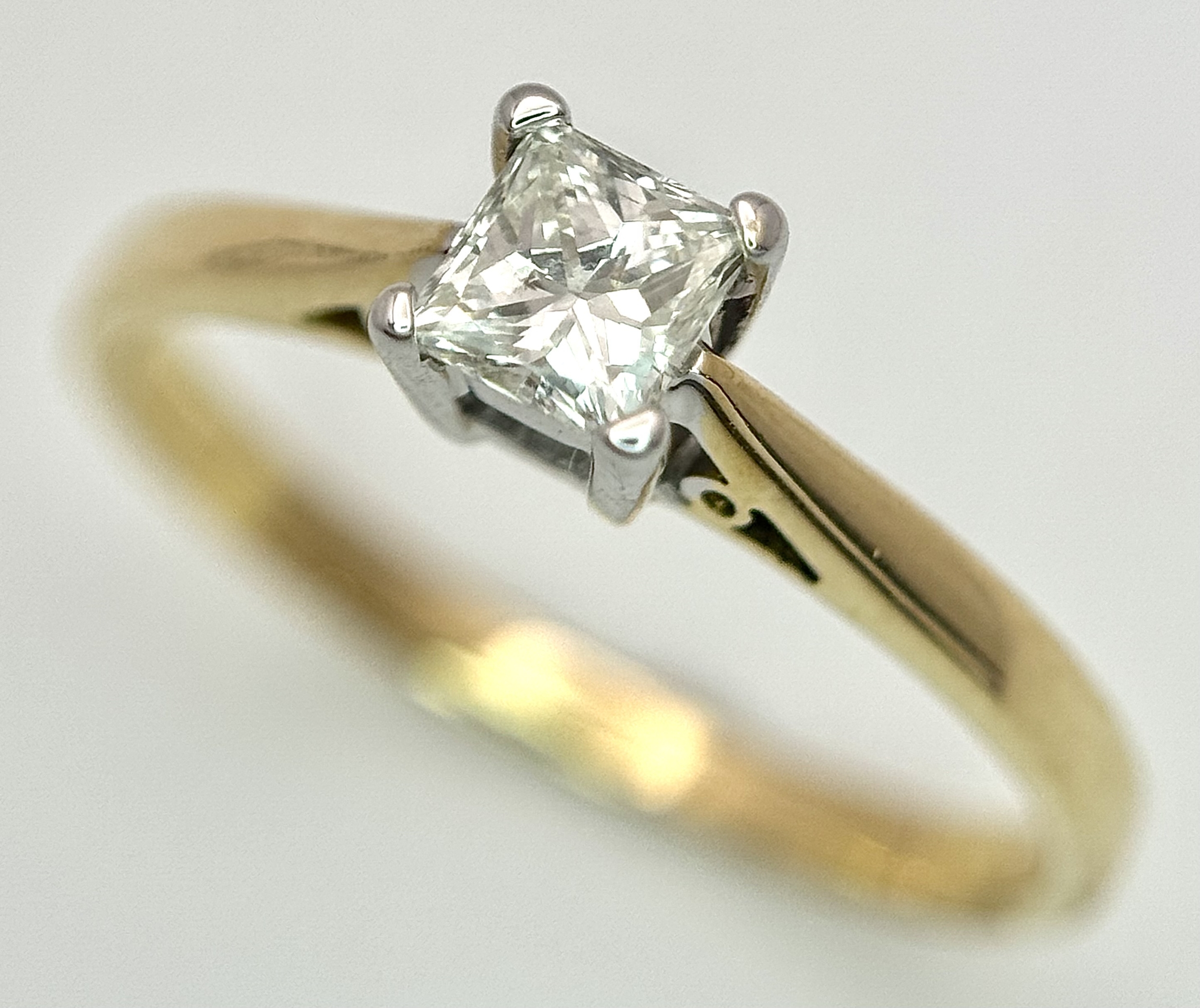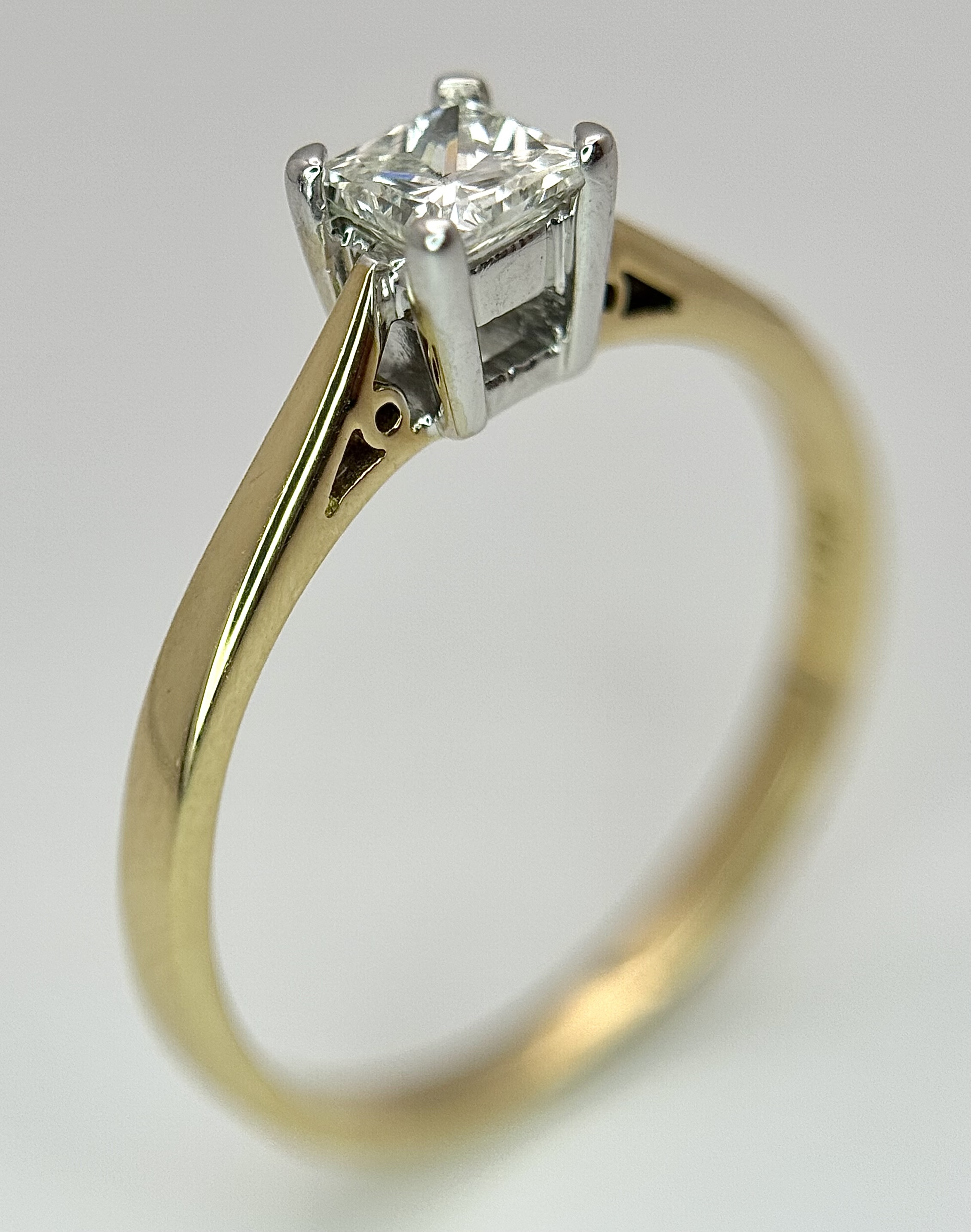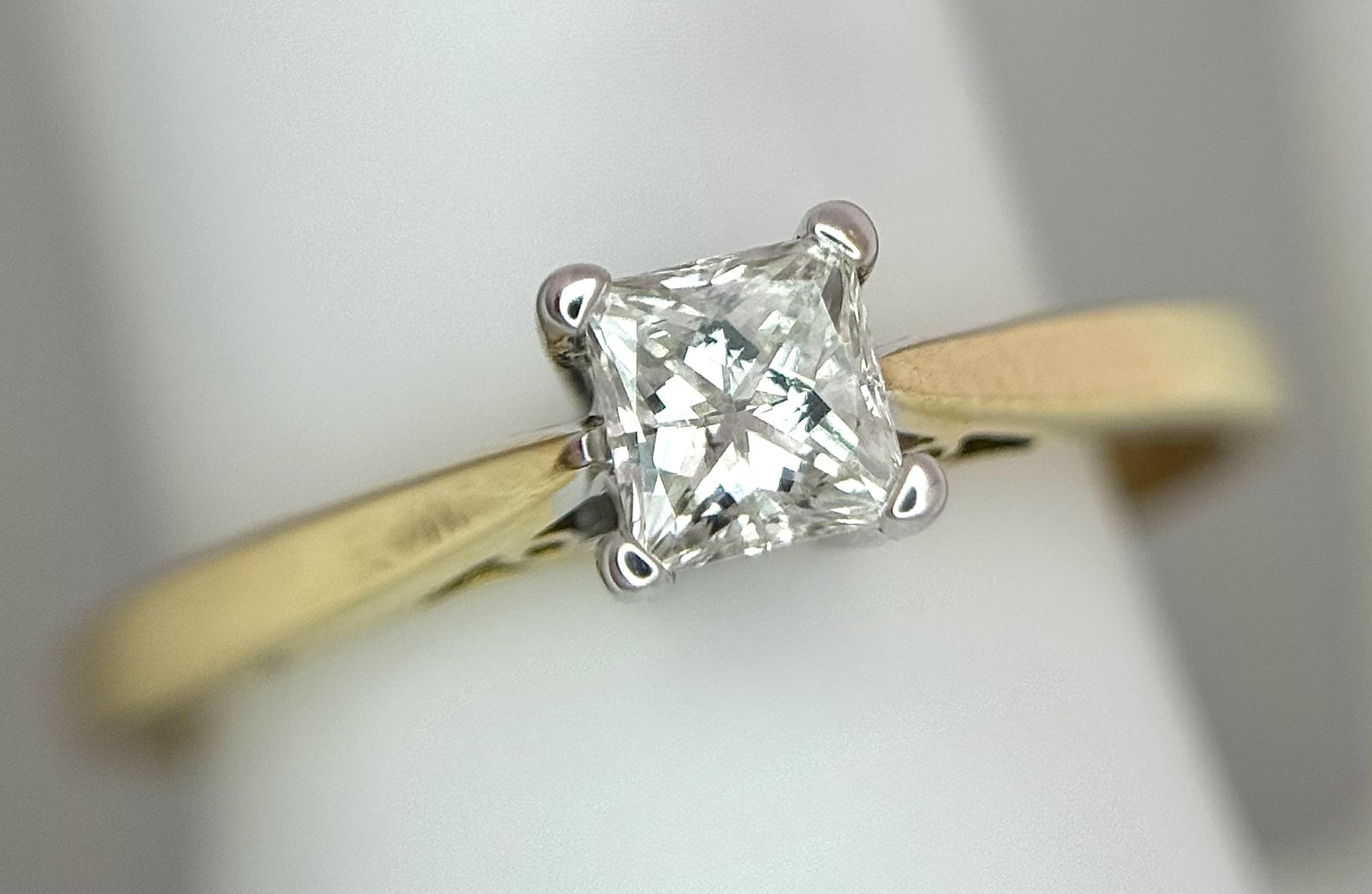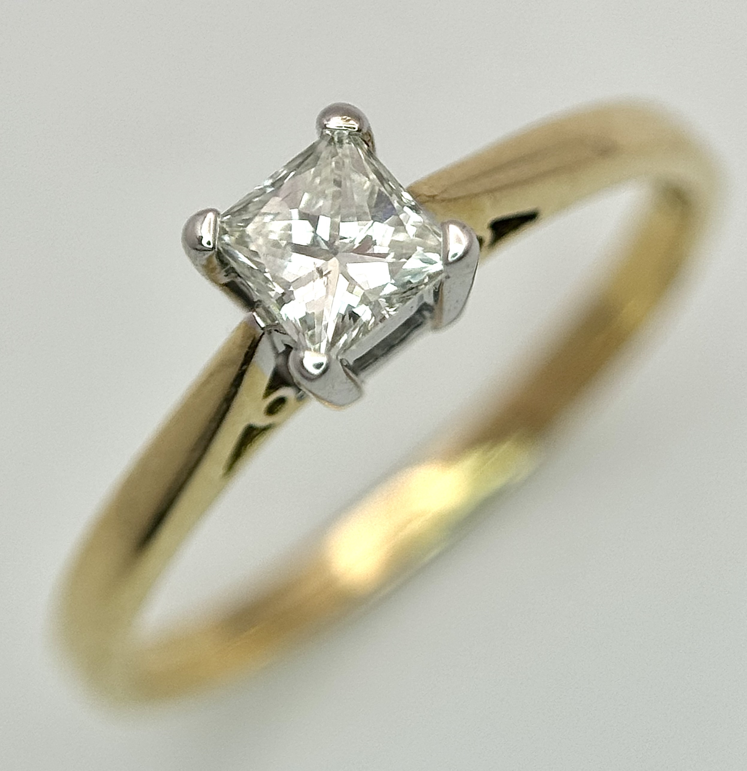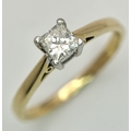 An 18K Yellow Gold Diamond Solitaire Ring. A 0.33ct Princess cut diamond having H colour and SI1 clarity. Size N. 2.37g total weight. MT70