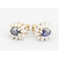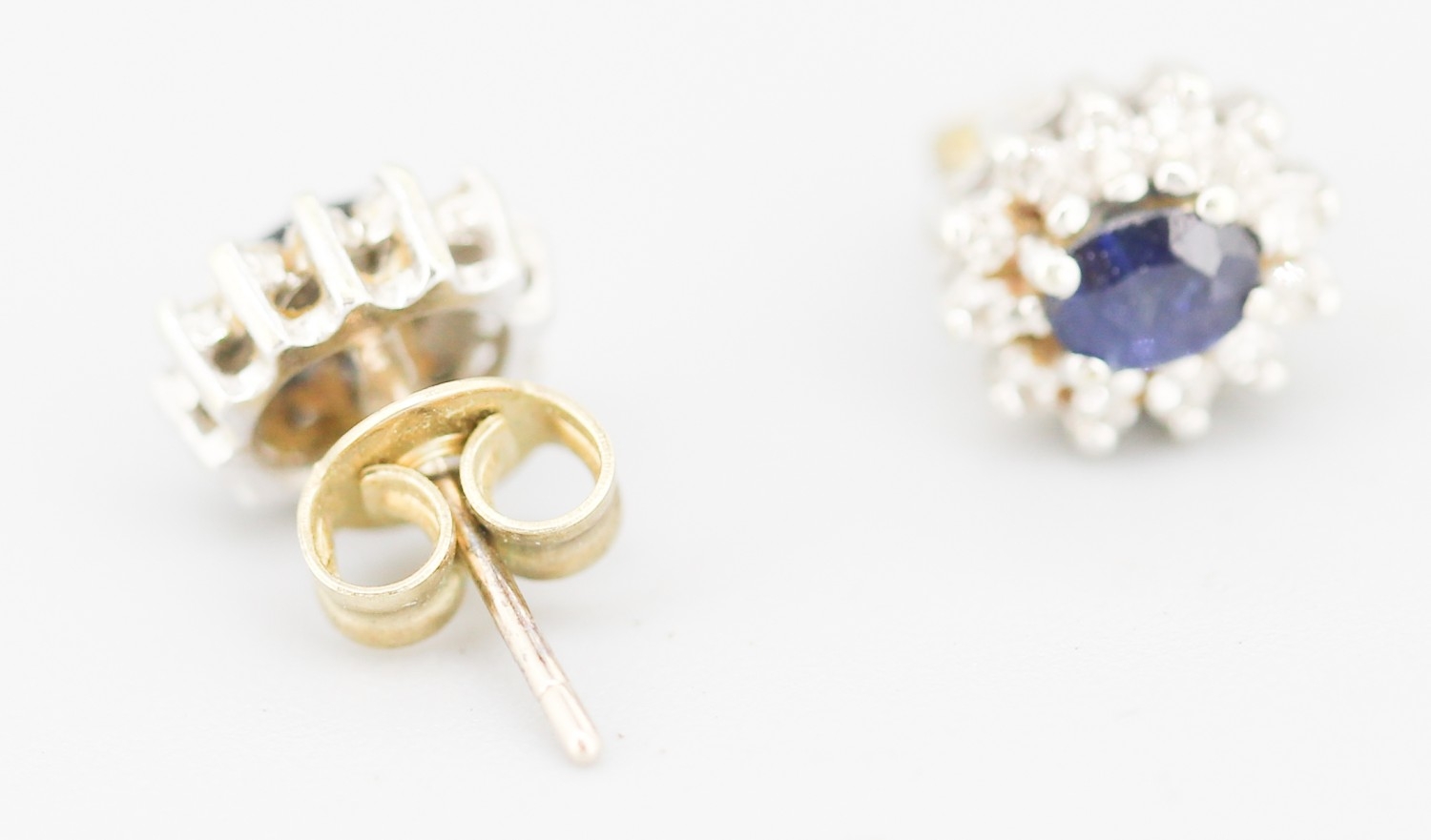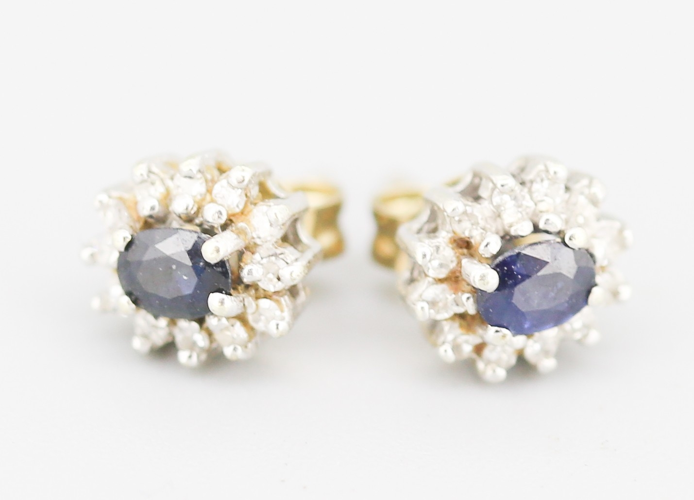 Pair of Sapphire Set Earrings with Diamond Set Halo Mounted in 9 Carat Yellow Gold 8mm High