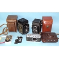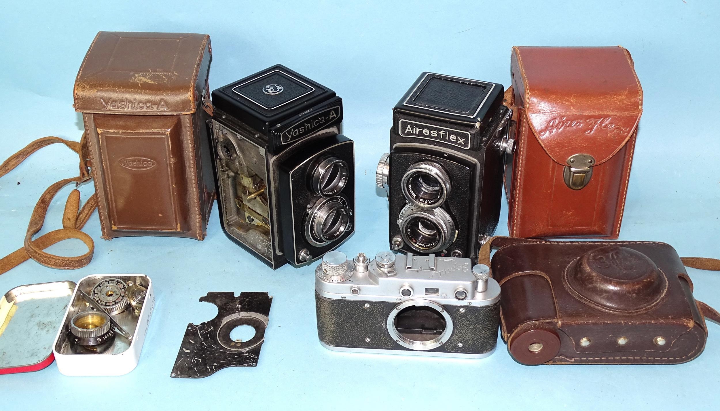 An Airesflex TLR camera with case, a Yashic-A TLR (a/f), cased and a Zorki camera body, with case.